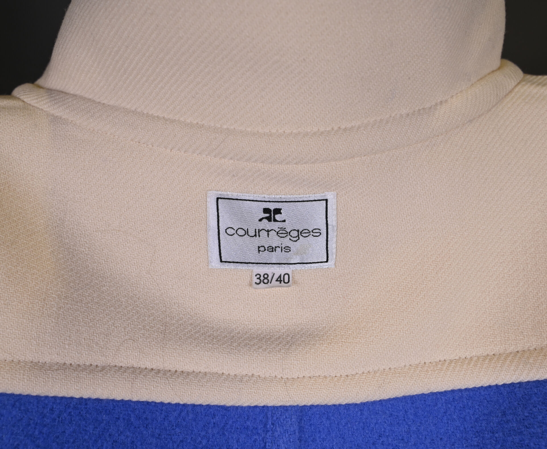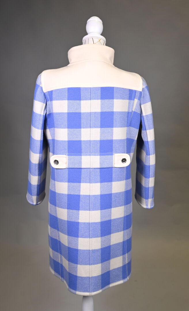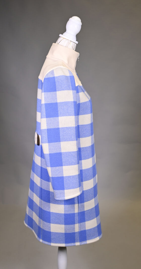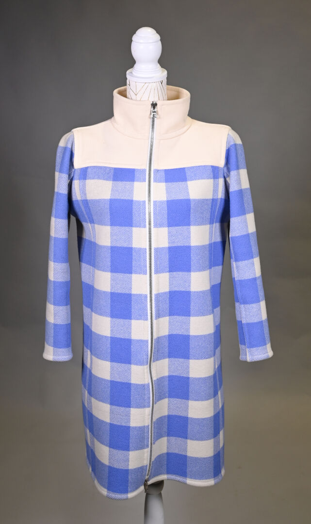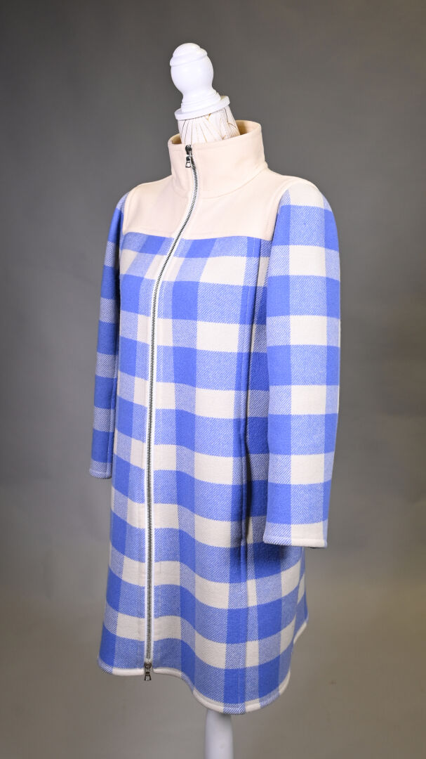 COURREGES. Manteau en laine et angora (?) vichy bleu et crème, fermeture éclair argentée. Haut. : 95 cm.