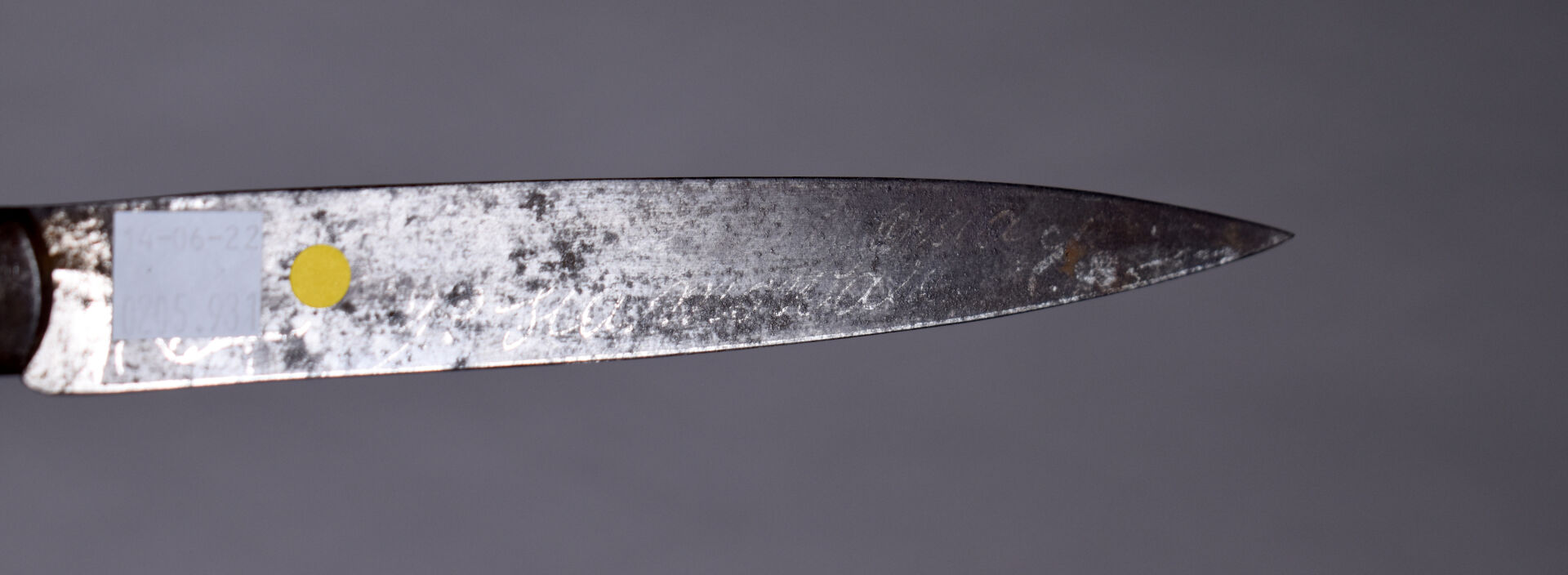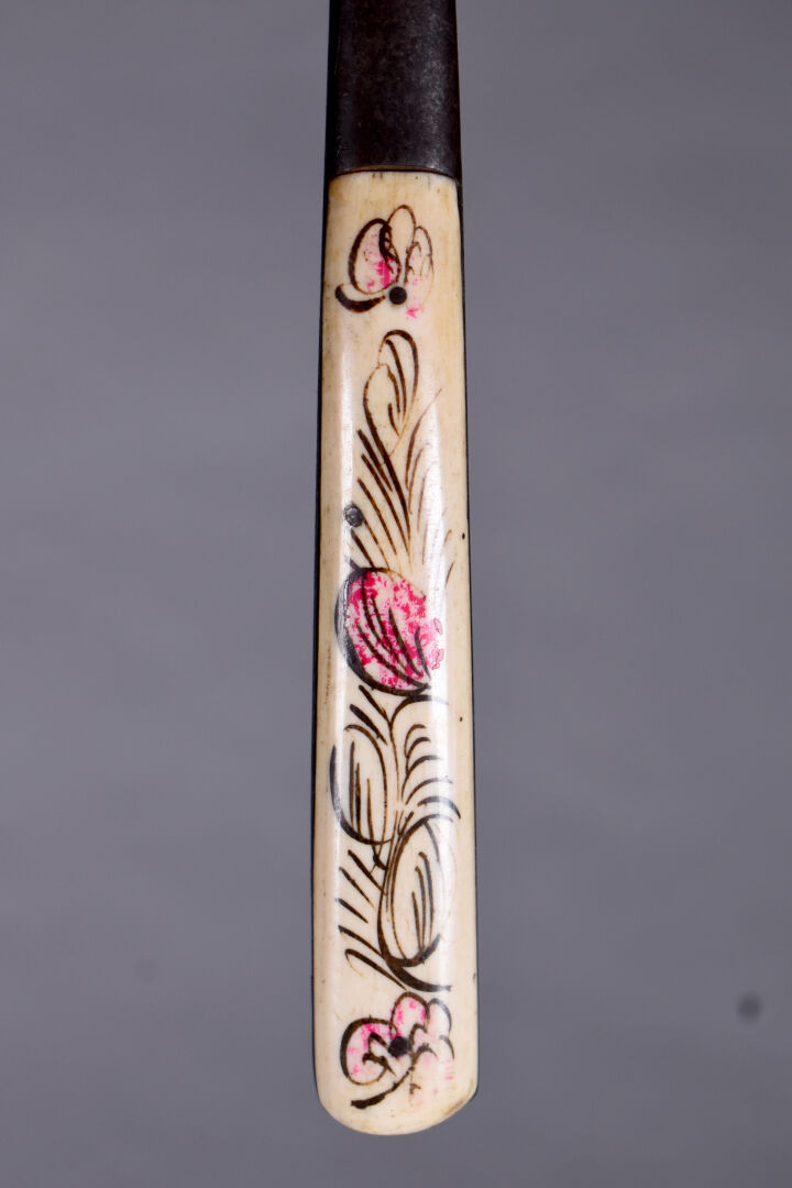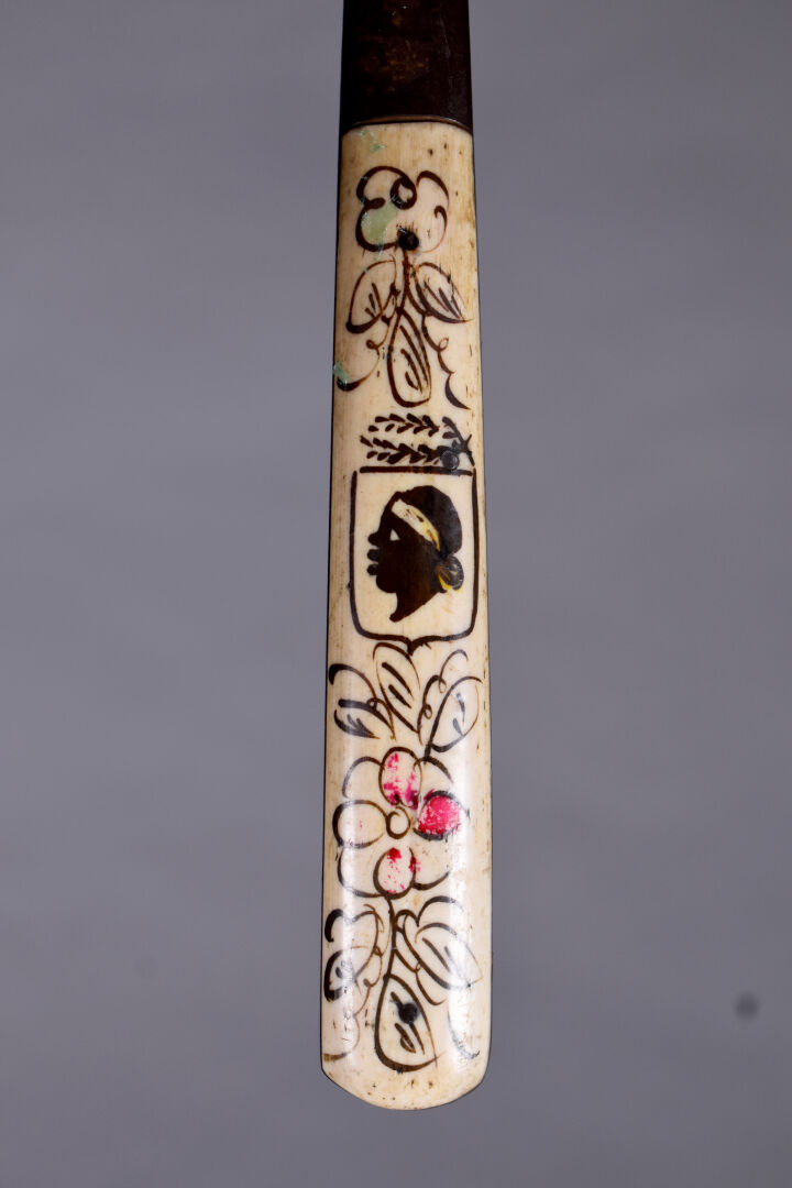 Couteau vandetta à manche en os à décor peint de la tête de Maure. Long. ouvert : 43 cm.
