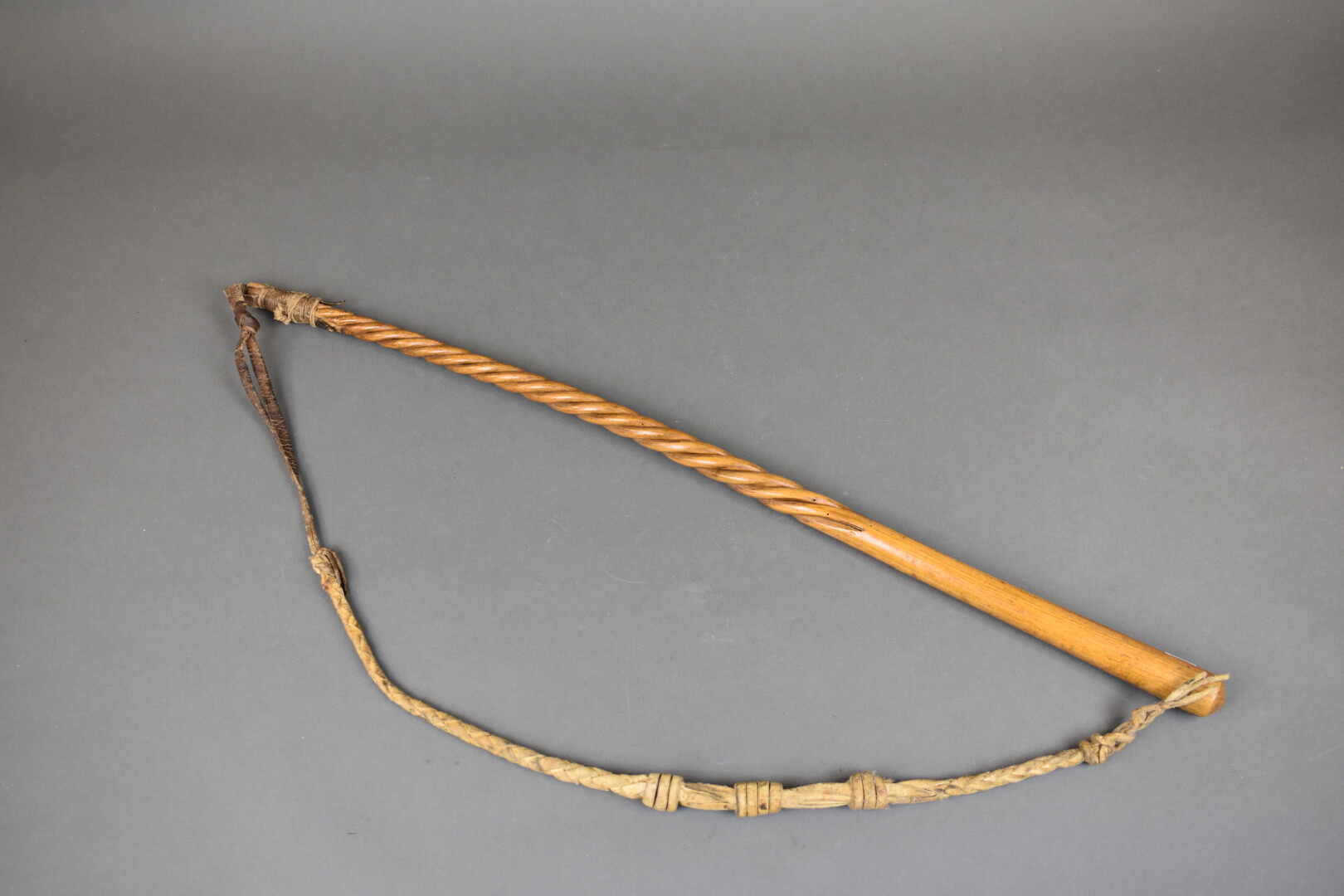 Cravache en bois et cuir tressé (usures, petit accident). Long. : 76 cm.