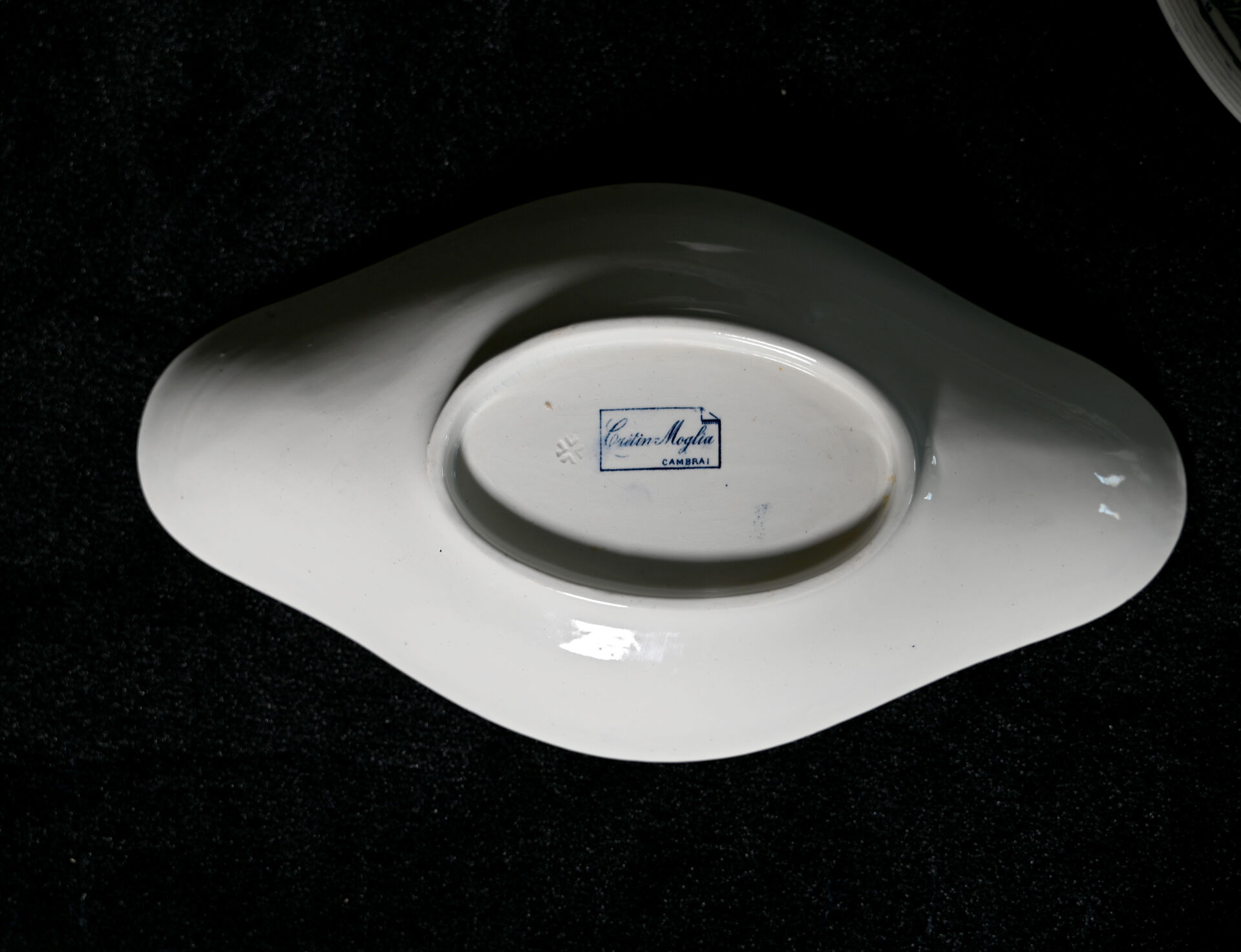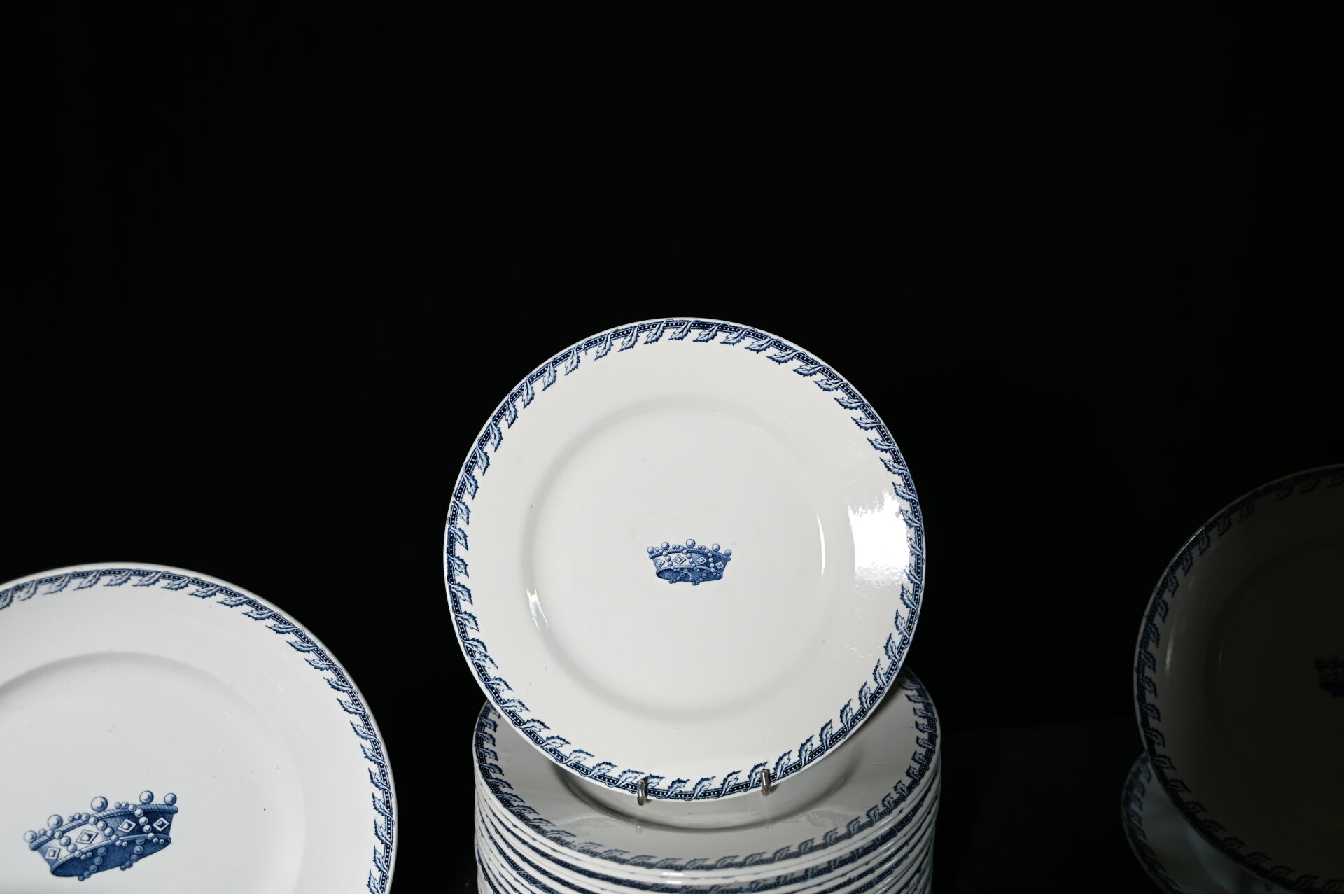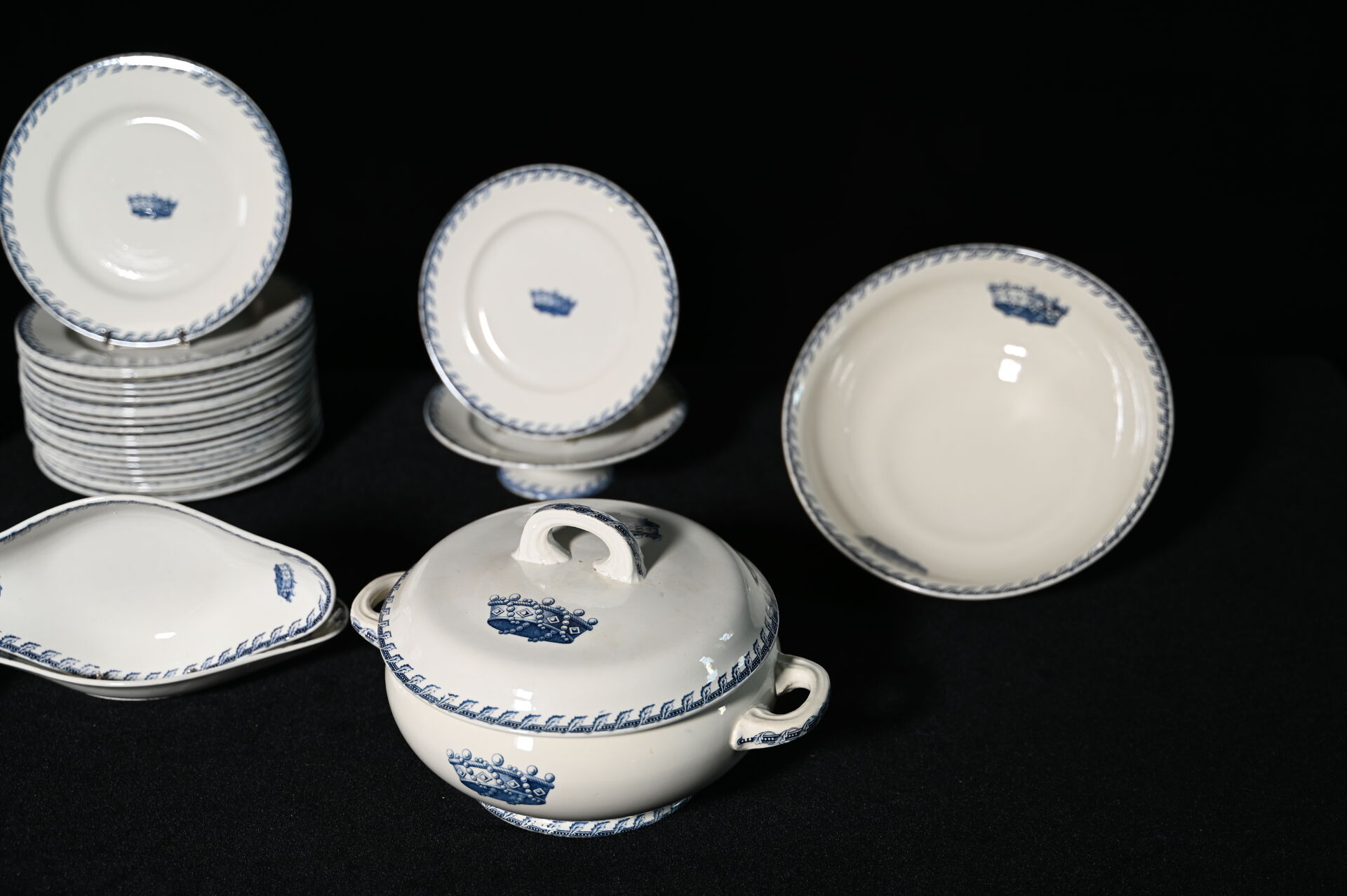 CRETIN-MOGLIA à CAMBRAI (Actifs entre 1880-1914). Partie de service de table en faïence à décor en bleu d’acanthes, ruban ajouré et couronne de Baron comprenant 20 assiettes plates, 8 assiettes à entremets, 2 plats à tarte, 1 compotier, 1 saucière à fonds solidaire, 2 raviers, 1 saladier, 1 plat de service circulaire, et 1 soupière. Marqué au dessous.
