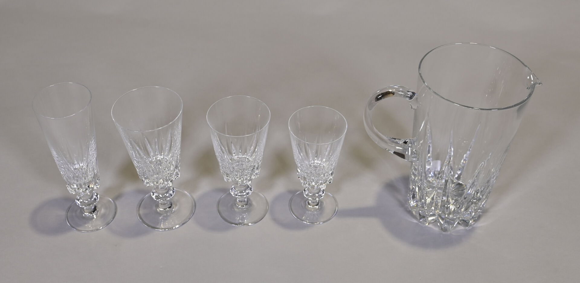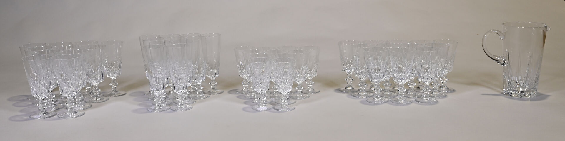 CRISTALLERIE DE BAYEL. Partie de service de verres à pied en cristal comprenant 11 verres à eau, 12 verres à vin rouge, 11 verres à vin blanc, 11 flutes à champagne et un broc (quelques égrenures).