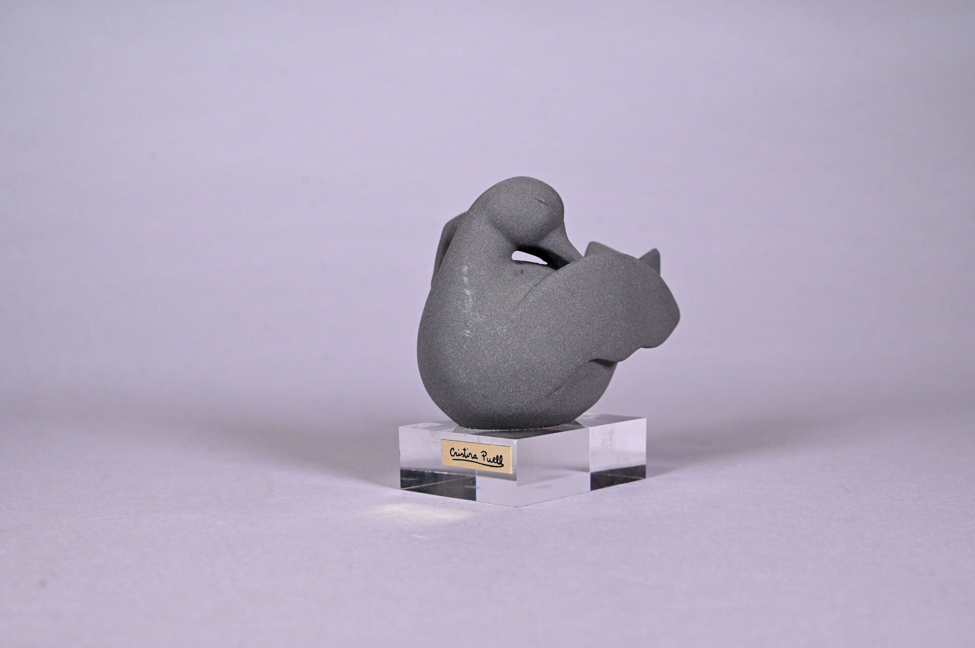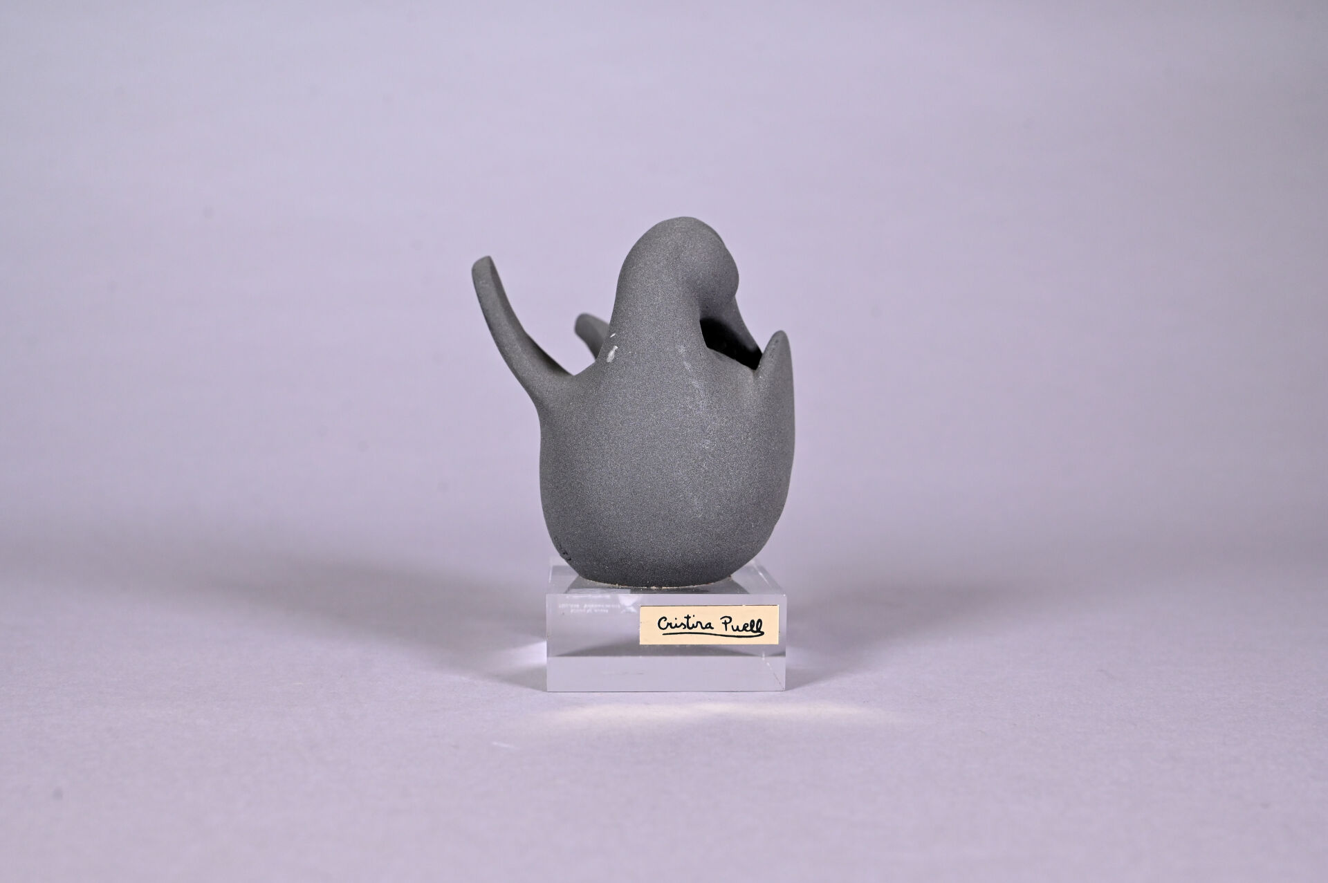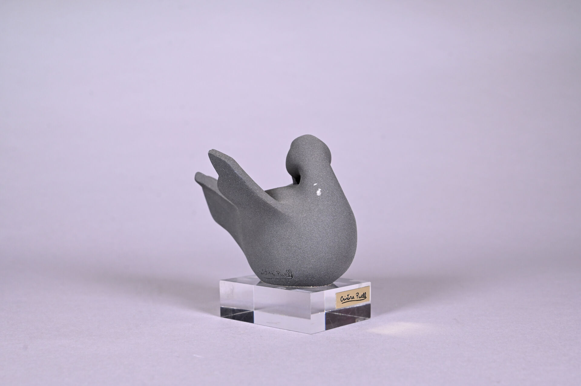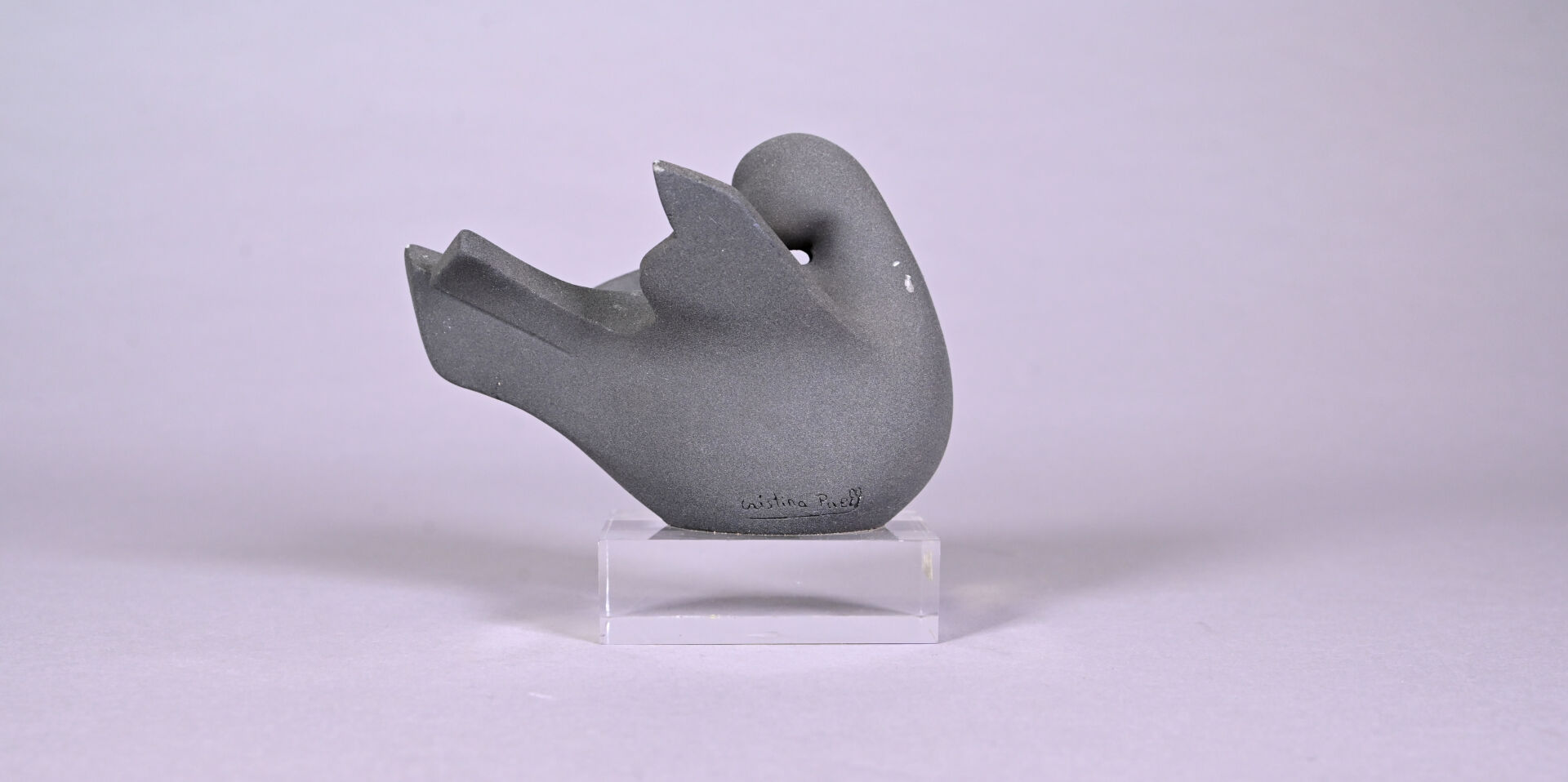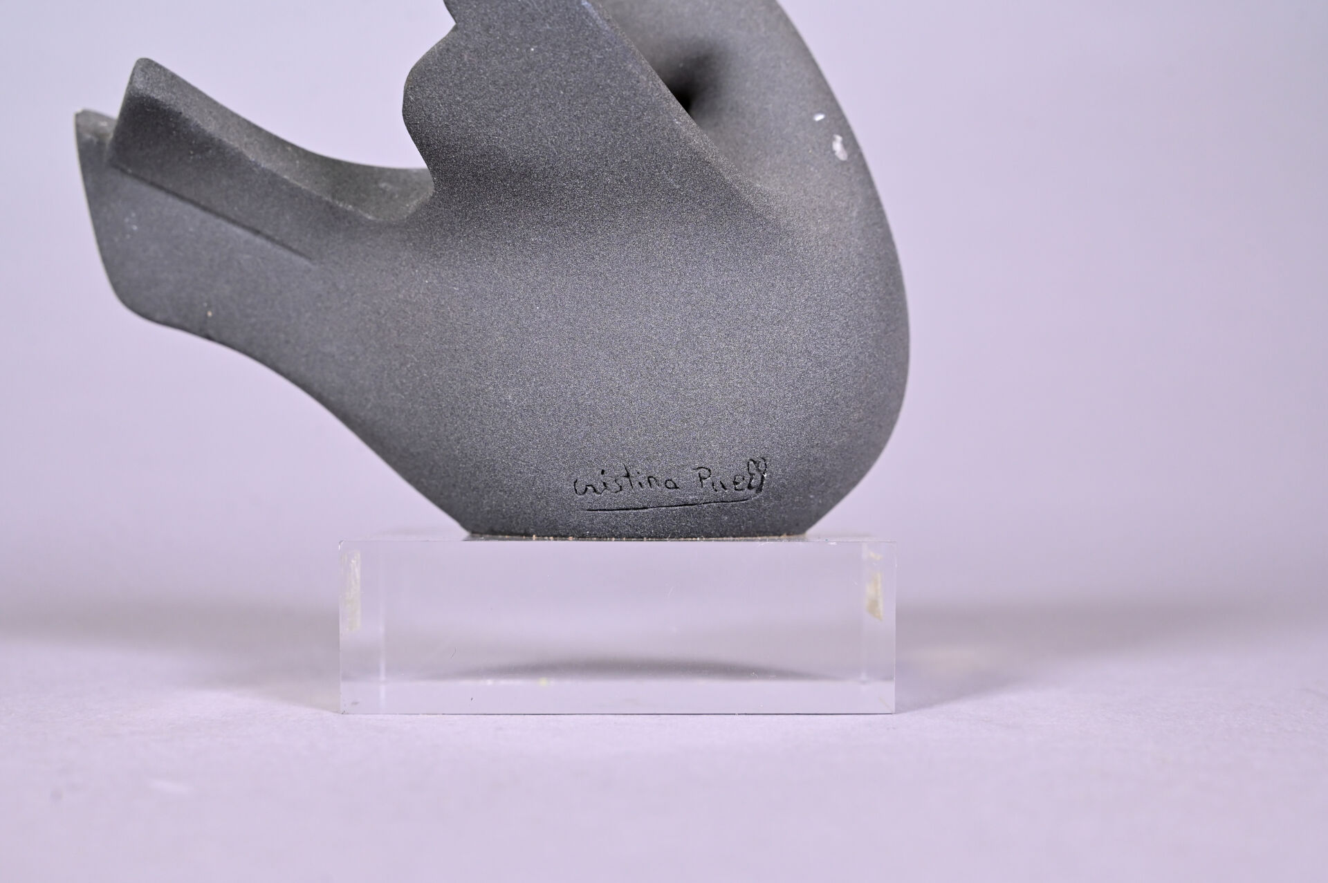 Cristina PUELL (XXe siècle). Canard en céramique émaillée noir sable (égrenures). Socle de plexiglass. Etiquette. Haut. : 12 cm.