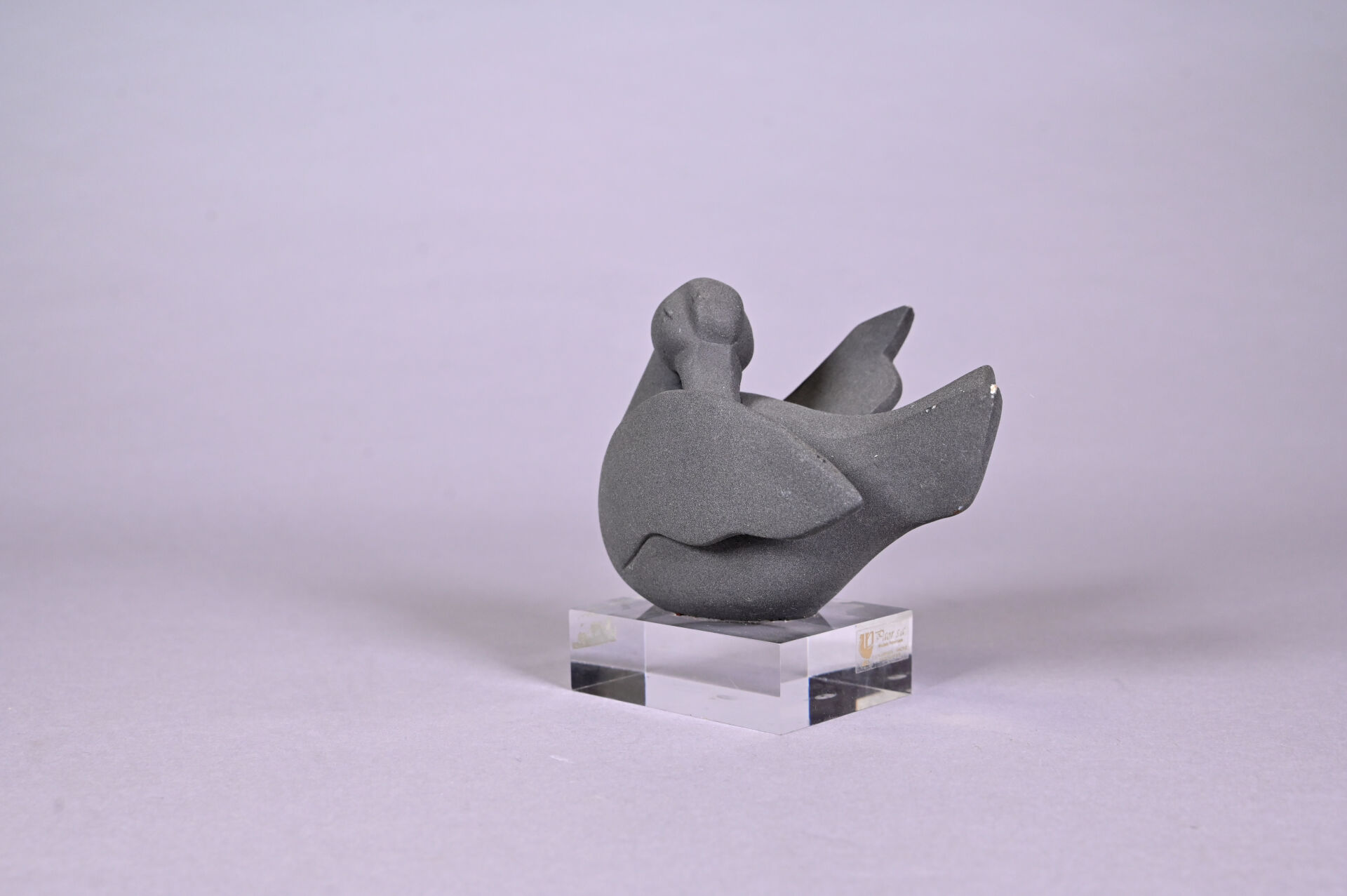 Canard en céramique émaillée noir sable (égrenures). Socle de plexiglass. Etiquette. Haut. : 12 cm.