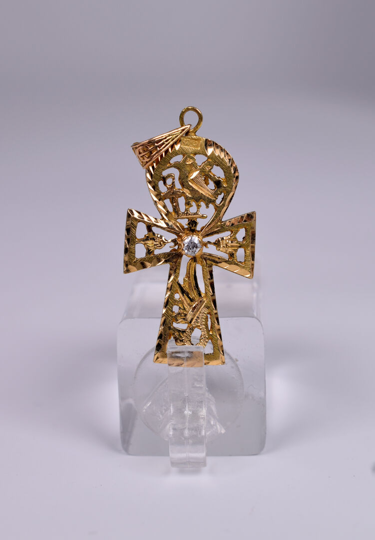 Croix égyptienne en or jaune 18K 750/1000e et pierre blanche. Haut. : 3,5 cm Poids : 4 g.