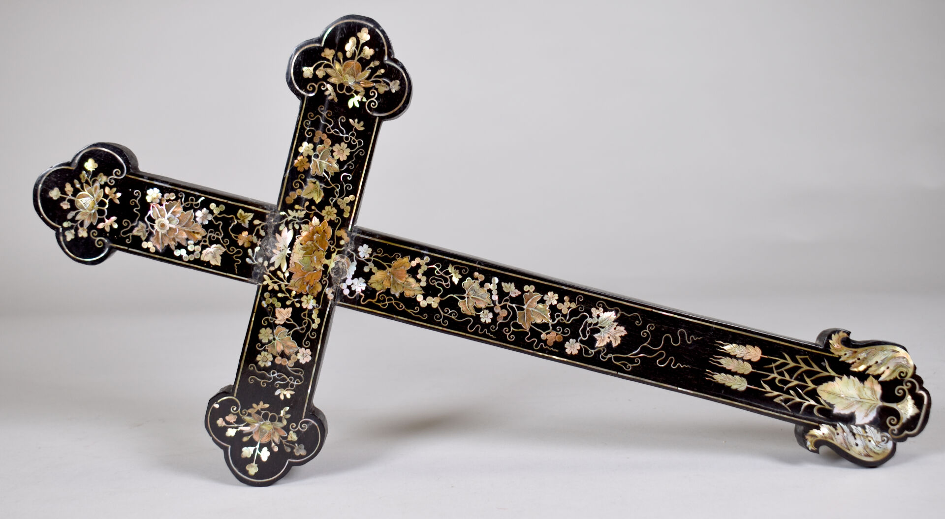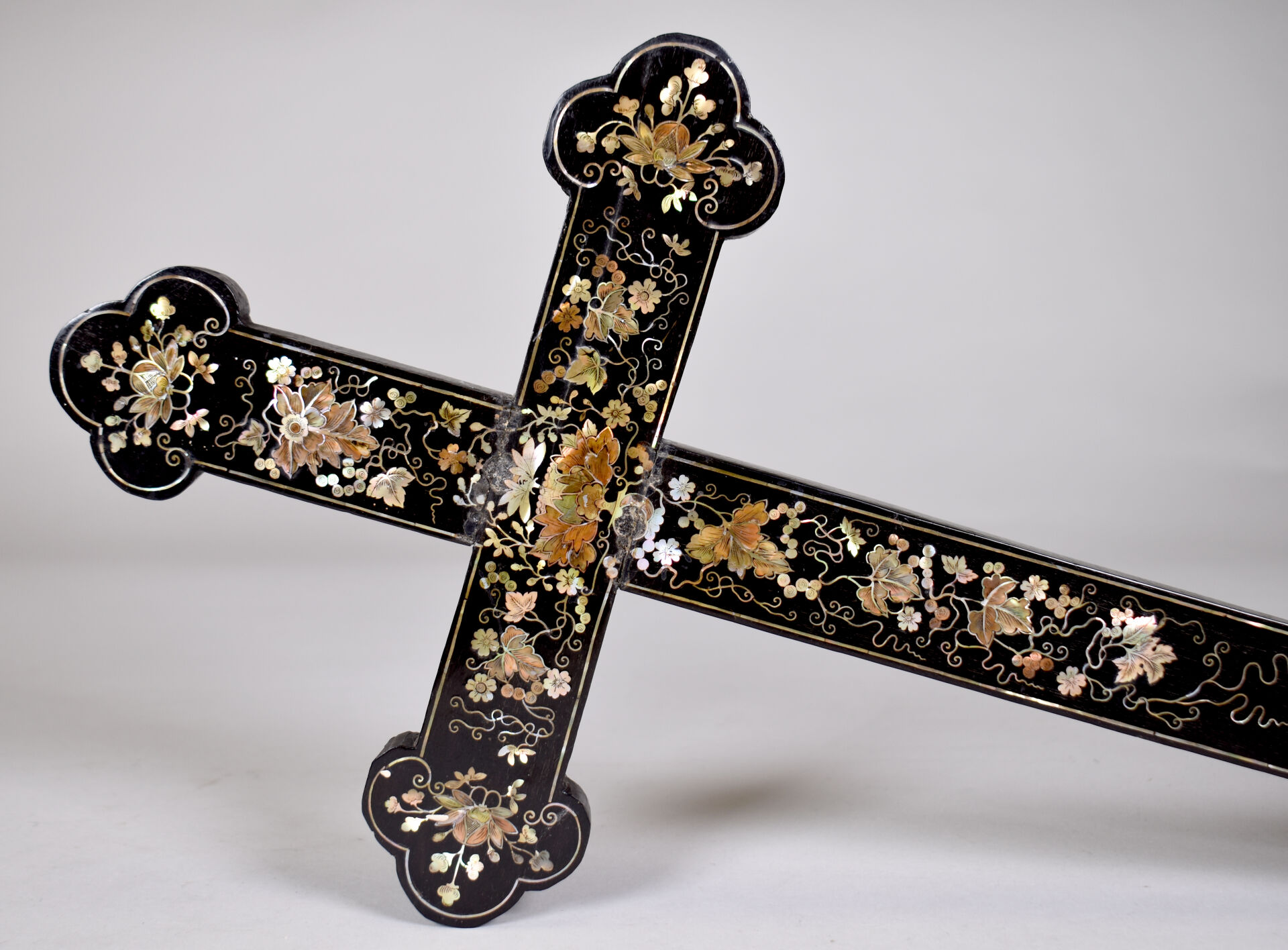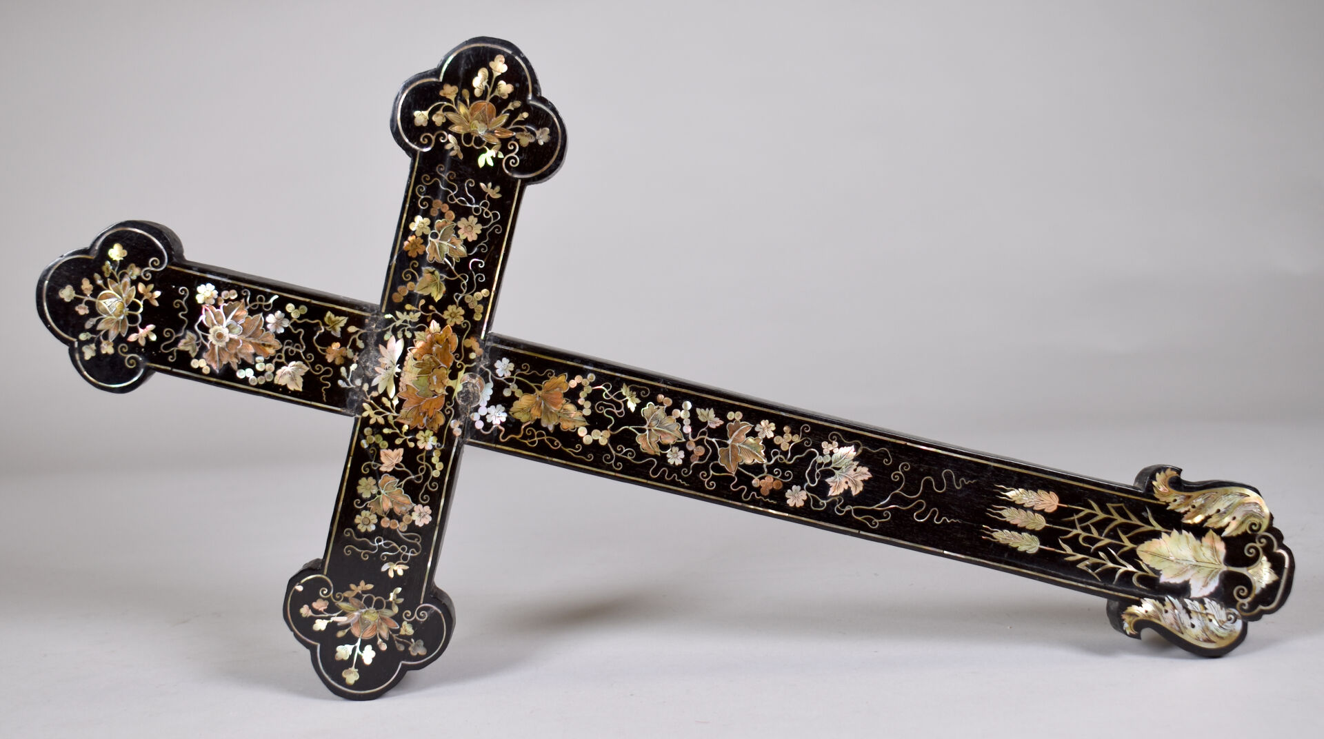 Croix en bois noirci à décor incrusté de nacre de pampres de vignes et épis de froment (quelques éclats). Indochine ? fin du XIXe ou début du XXe siècle siècle. Haut. : 43,5 cm Larg. : 23 cm.
