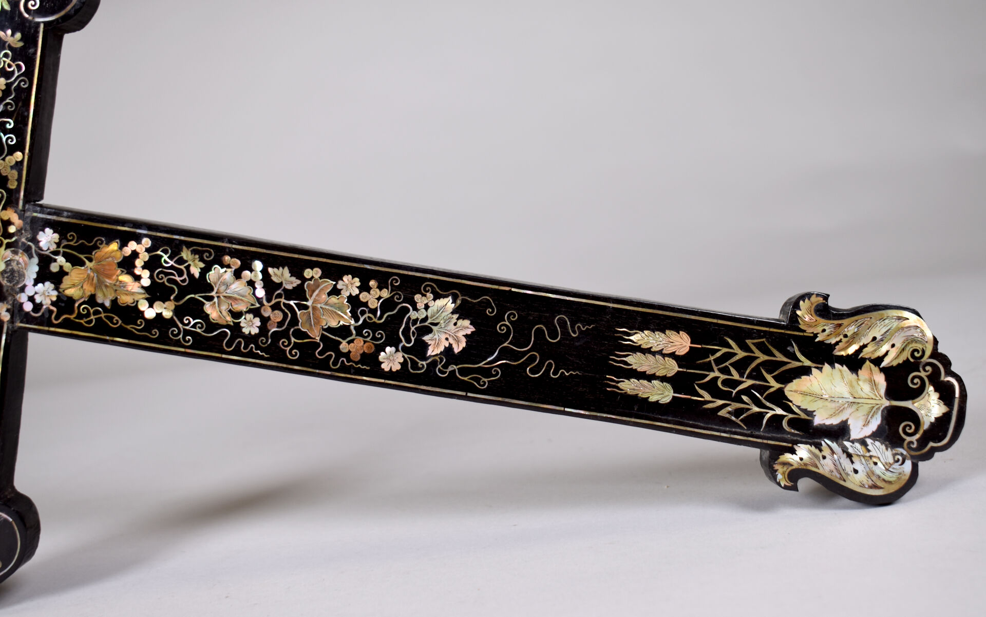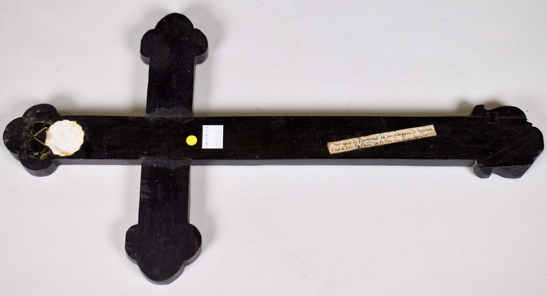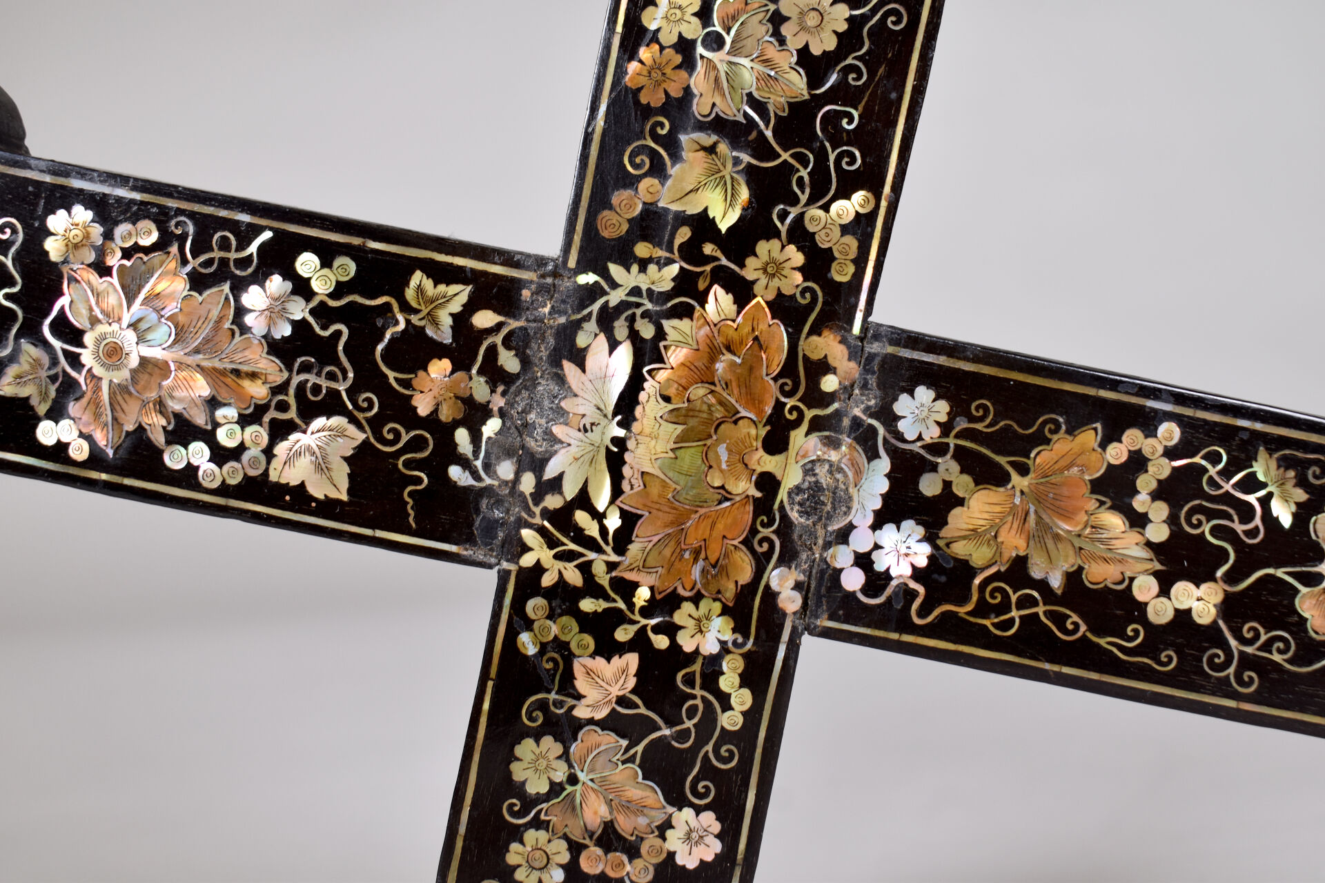 Croix en bois noirci à décor incrusté de nacre de pampres de vignes et épis de froment (quelques éclats). Indochine ? fin du XIXe ou début du XXe siècle siècle. Haut. : 43,5 cm Larg. : 23 cm.
