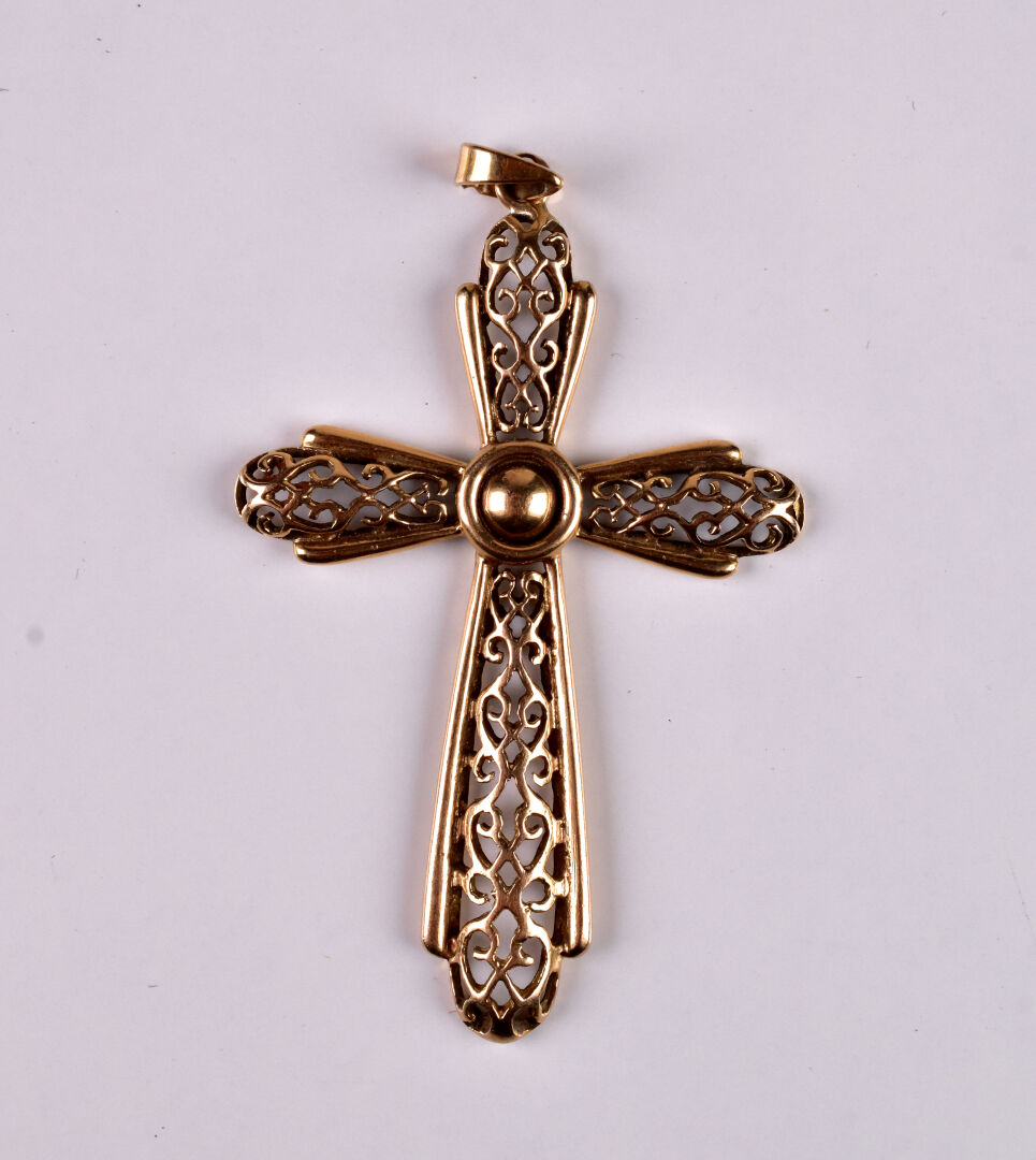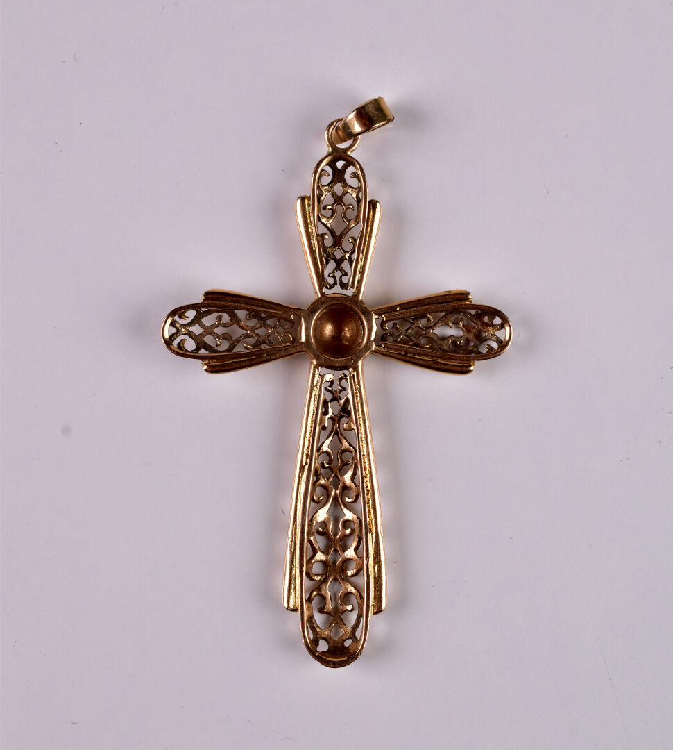 Croix en pendentif en or 18K 750/1000e à motif ajouré. Haut. : 5,5 cm. Poids. : 6,2 g.