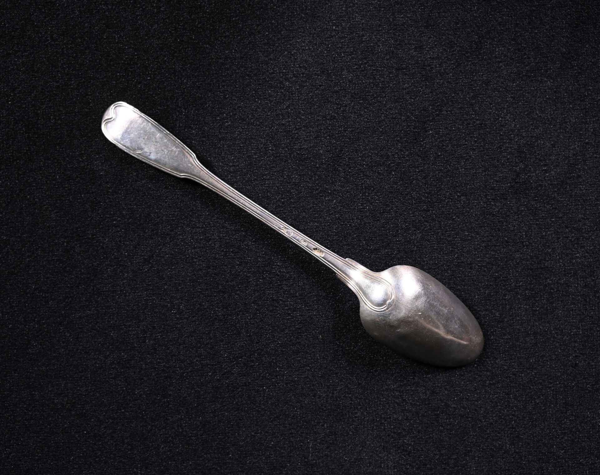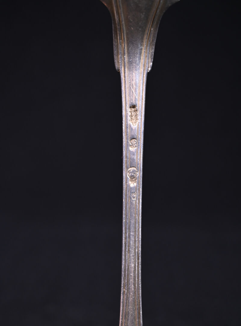Cuillère en argent 925/1000e, modèle uniplat à filet. Poinçon de maître : initiales J P M T sur deux lignes, couronne en chef, poinçon de maître de Joseph Pierre Marie Tiret, orfèvre à Vannes, poinçon de la ville de « Rennes » (?). XVIIIe siècle. Poids : 183 g.