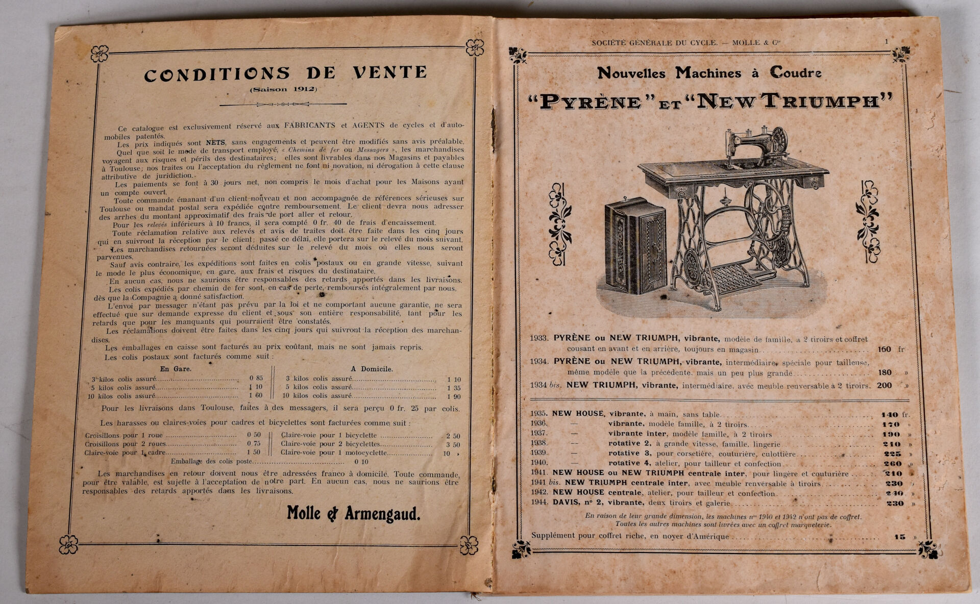 CYCLES PYRENE. MOLLE & Cie TOULOUSE. Catalogue 1912 – 1913, avec couverture lithographique (taches et salissures). On joint 100 ans d’affiches du cycle édition Henri VEYRIER.