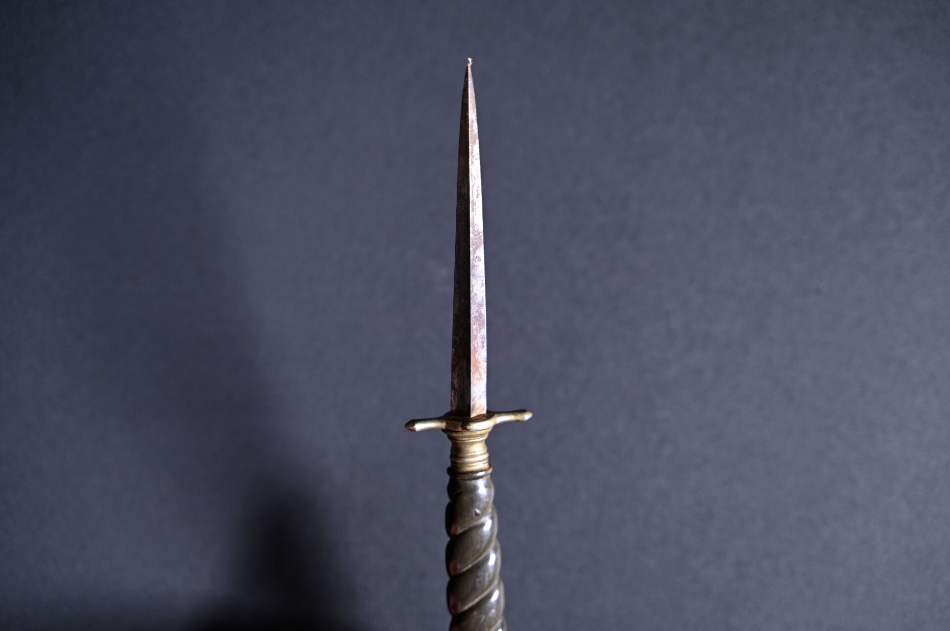 Dague de vertu à manche en corne sculpté torsadé. Fourreau gravé d’initiales. Long. : 18,5 cm.