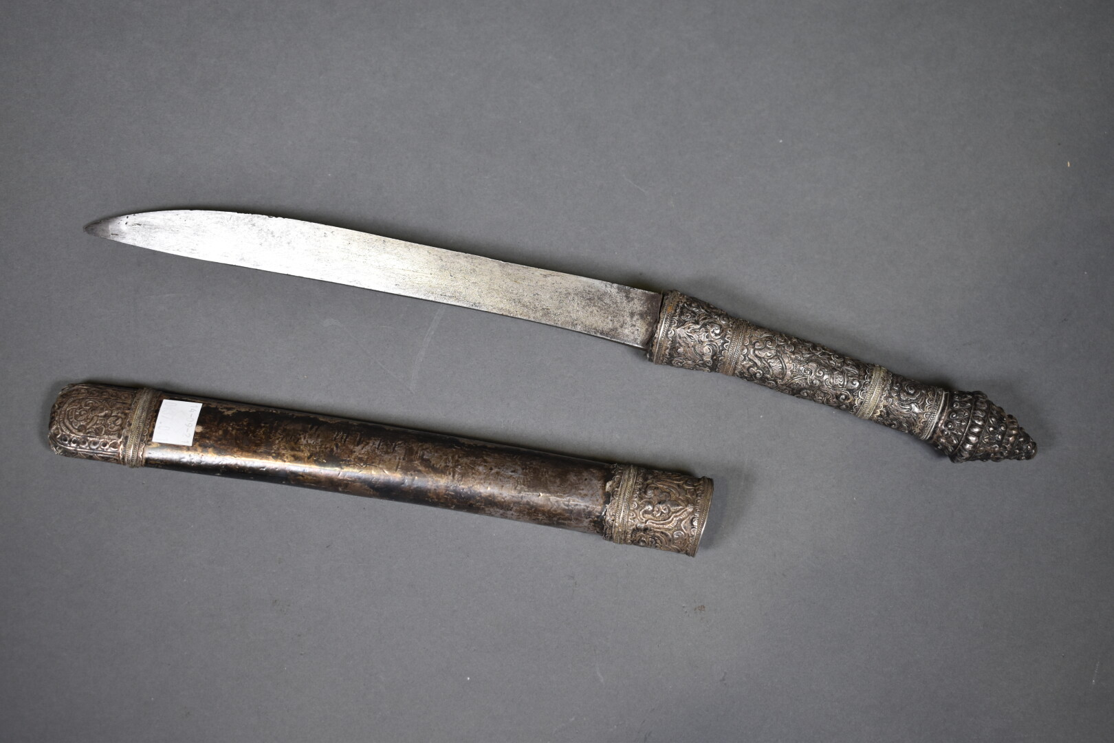 Dahh (poignard birman), lame courbe a dos plat, pointe légèrement faussée, fusée bois habillée d’un feuille d’argent repoussée ainsi que le fourreau. Long. totale 440 mm. État 2