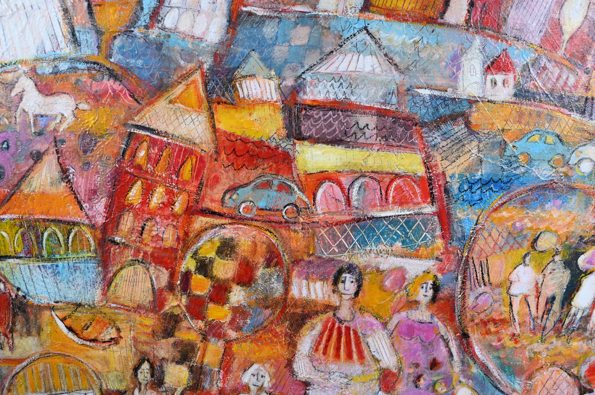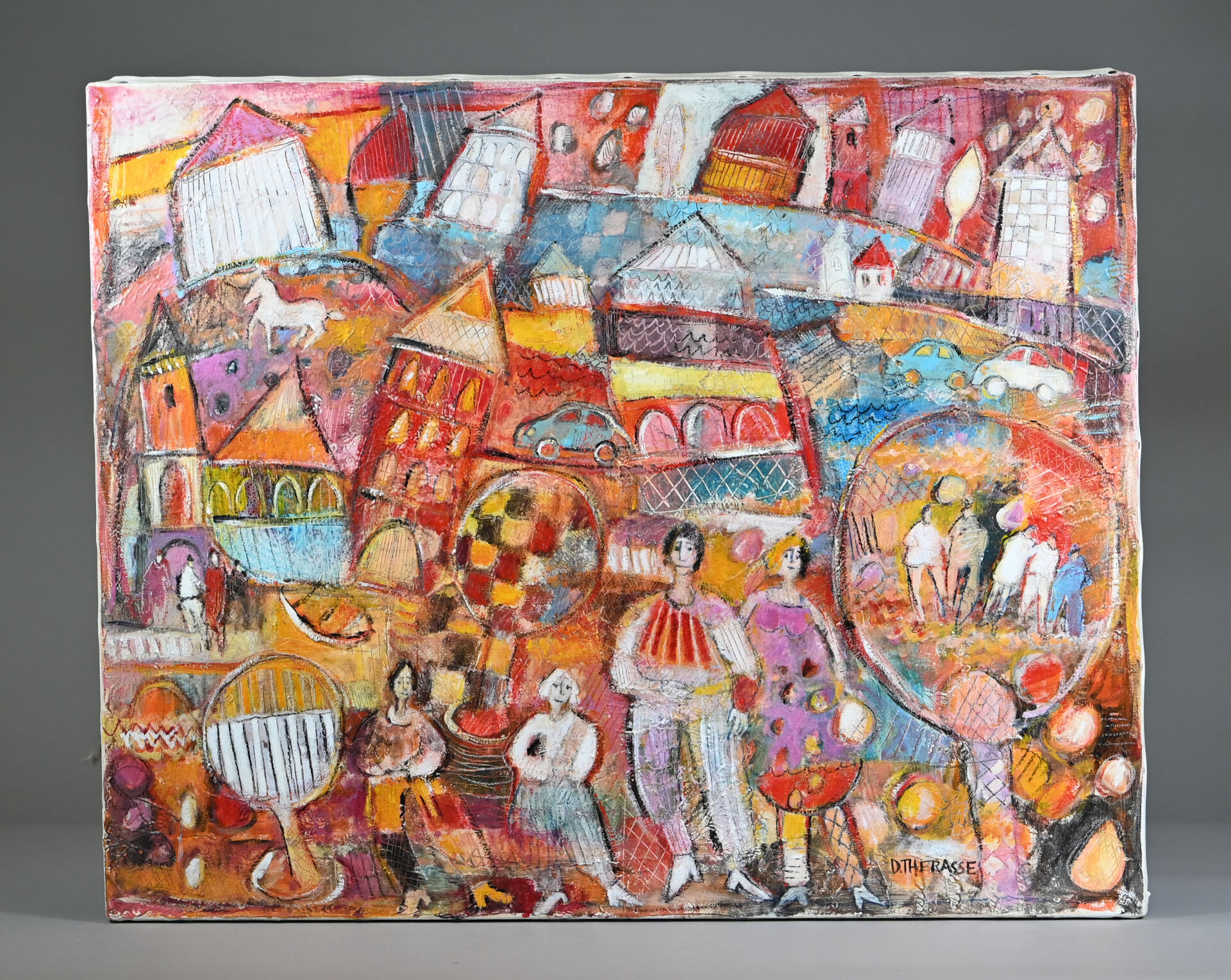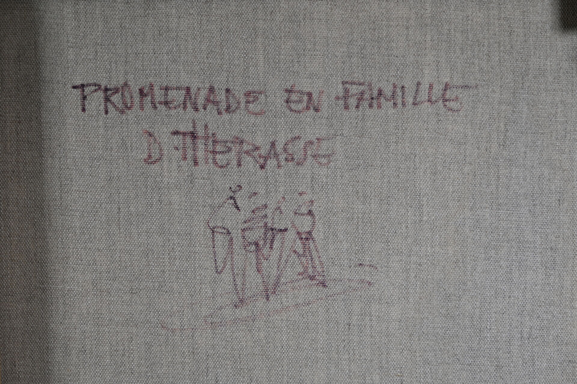 Daniel THERASSE (1955-). Promenade en Famille. Huile sur toile signée en bas vers la droite, contre signée et titrée au dos. 65,5 X 41 cm.