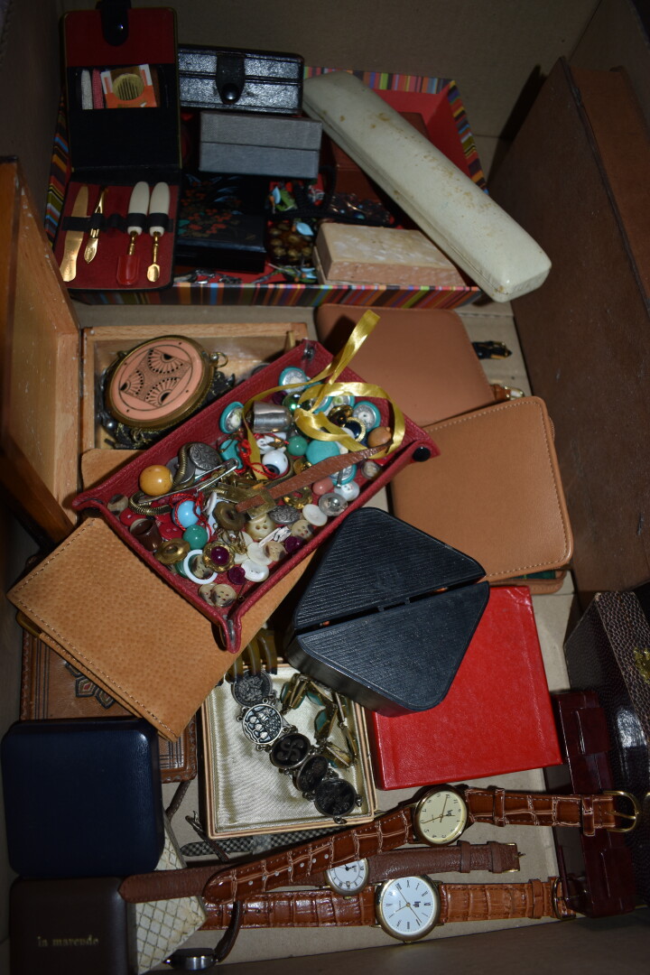 Ensemble de bijoux fantaisie dont chaîne gilletière, montres en métal argenté, boîtes, montres bracelet dont LIP, braclets, peigne en résine, boutons et divers. 1 carton.