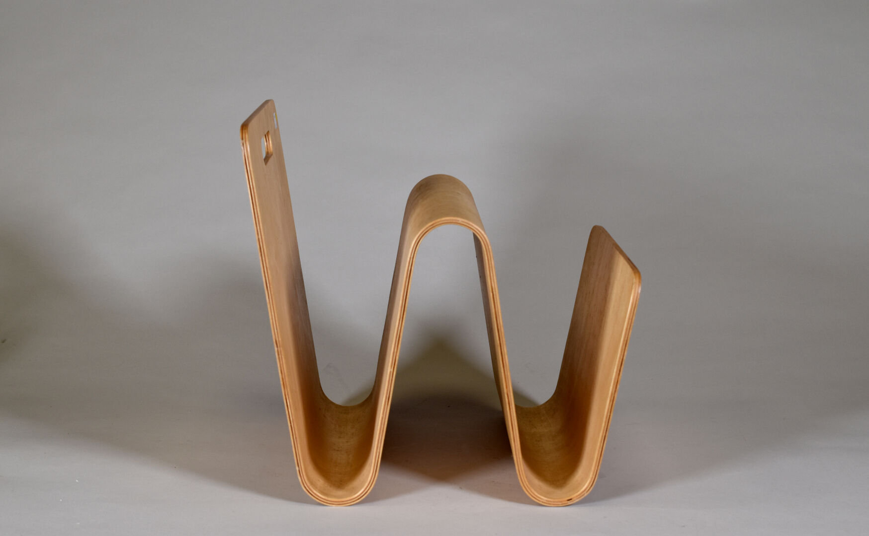 Dans le goût Alvar Aalto. Porte revues en contre plaqué blond (mouillures). Haut. : 36,5 cm – Larg. : 37 cm – Prof. : 32,5 cm.