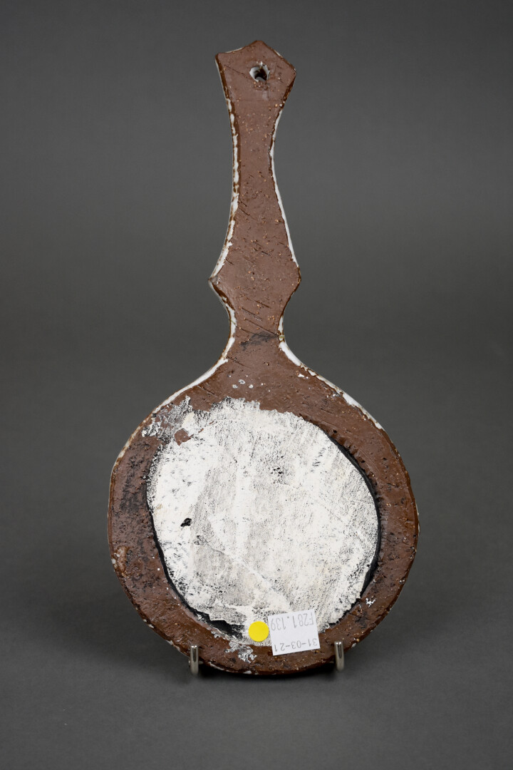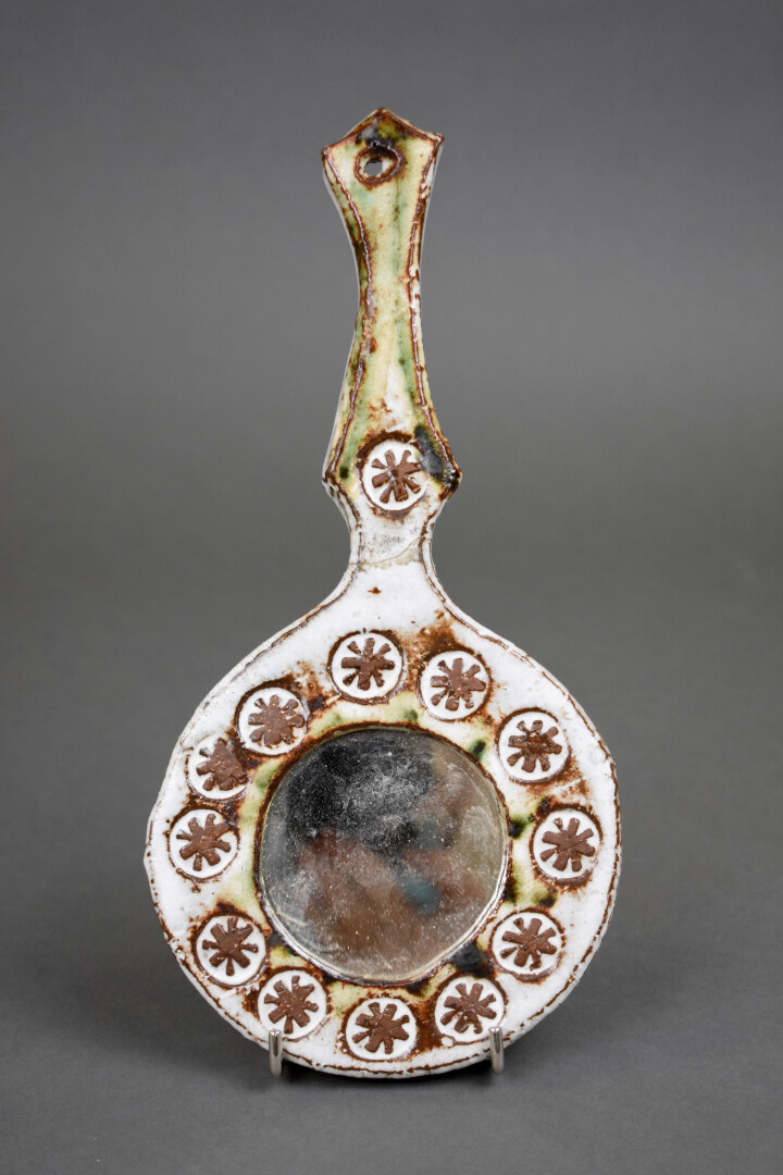 Dans le goût d’Accolay ou Georges PELLETIER. Miroir à main en céramique émaillée crème à décor de fleurs (un accident restauré). Haut. : 27,5 cm.