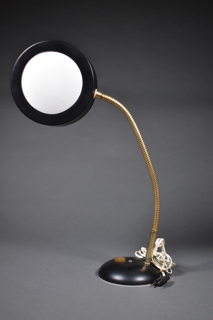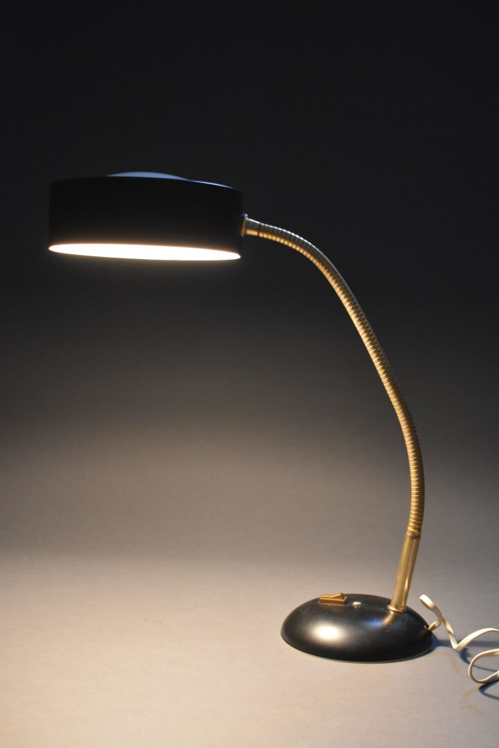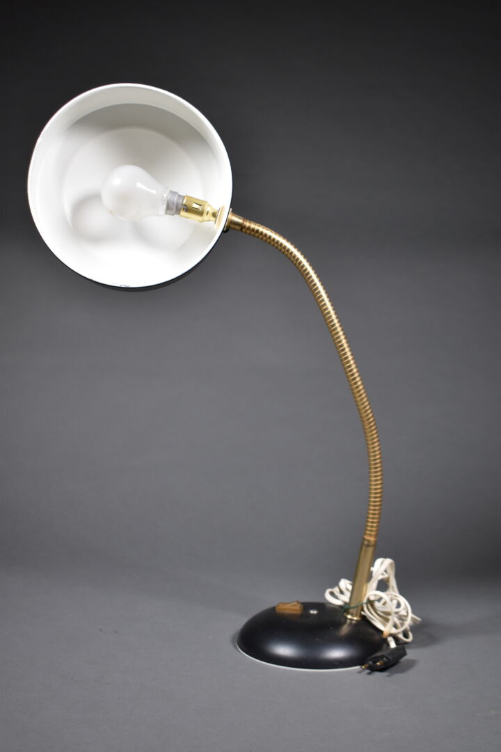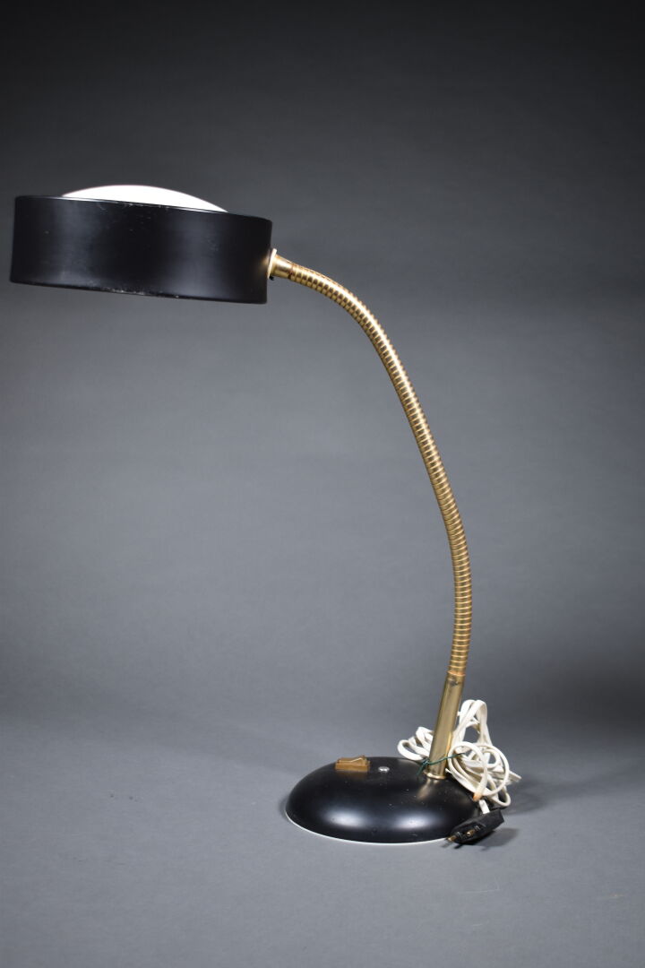 Dans le goût de Charlotte PERRIAND. Lampe de bureau en métal laqué noir, le fût à ressort articulé en métal doré (quelques usures d’usage). Vers 1960. Haut. : 52 cm.