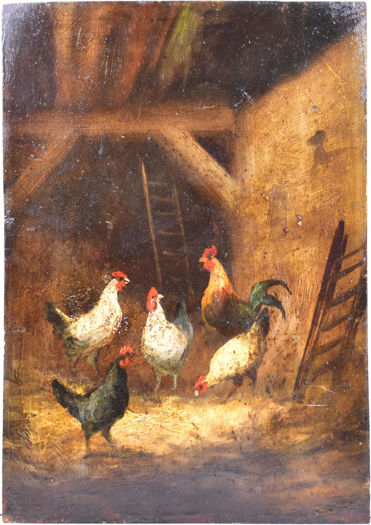 Dans le goût de Claude GUILLEMINET. La basse-cour. Huile sur panneau. 33 x 23 cm.