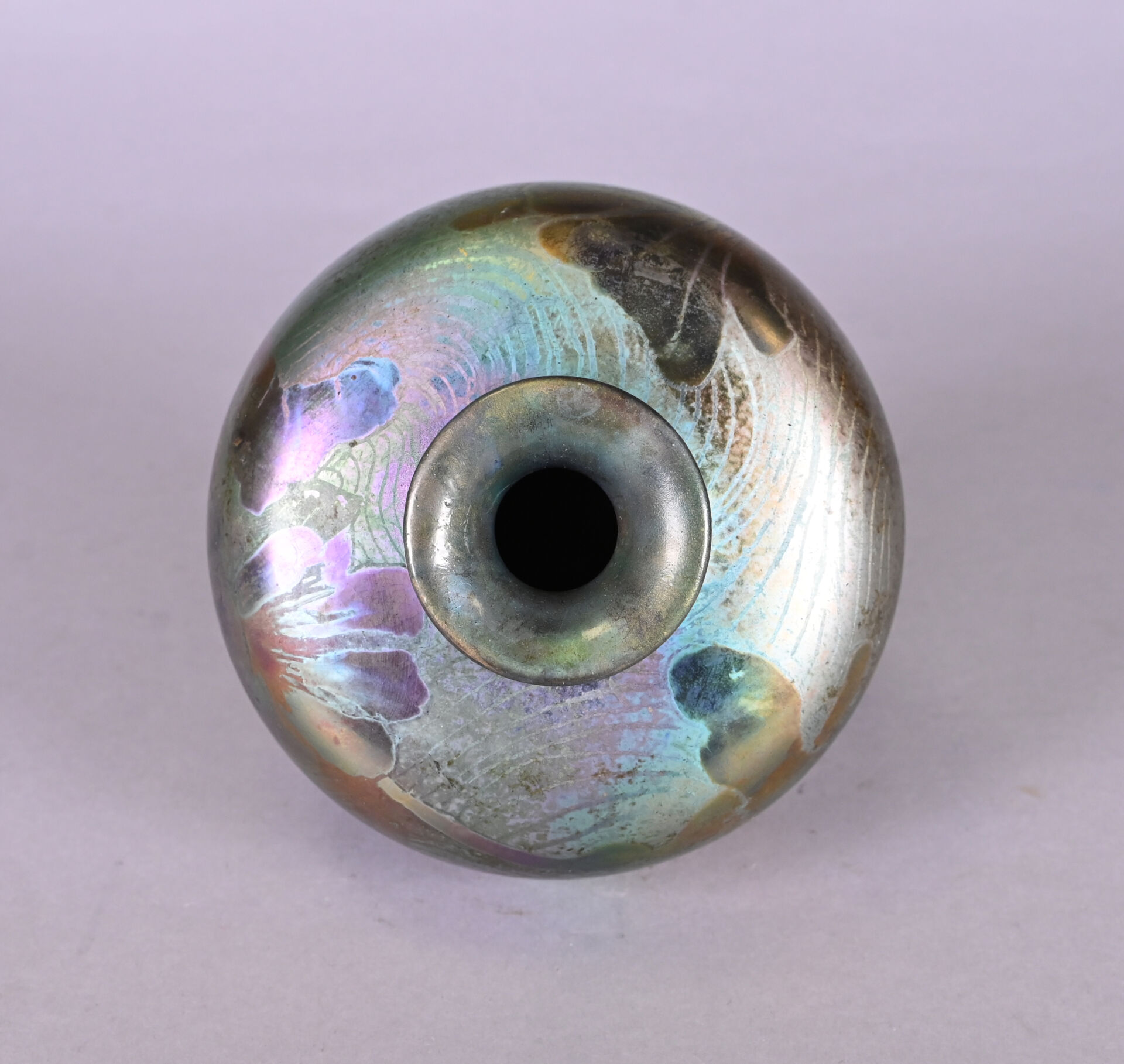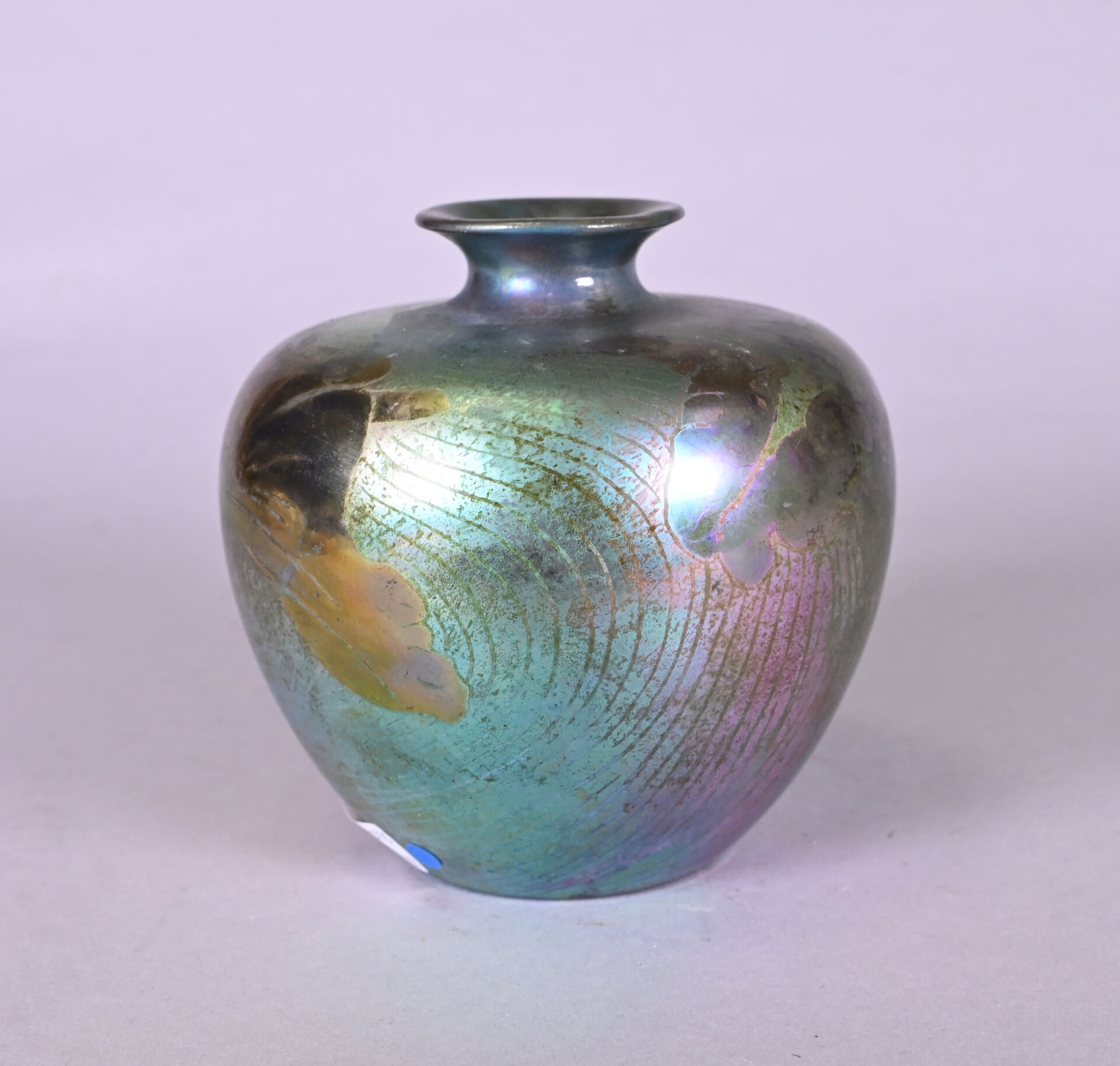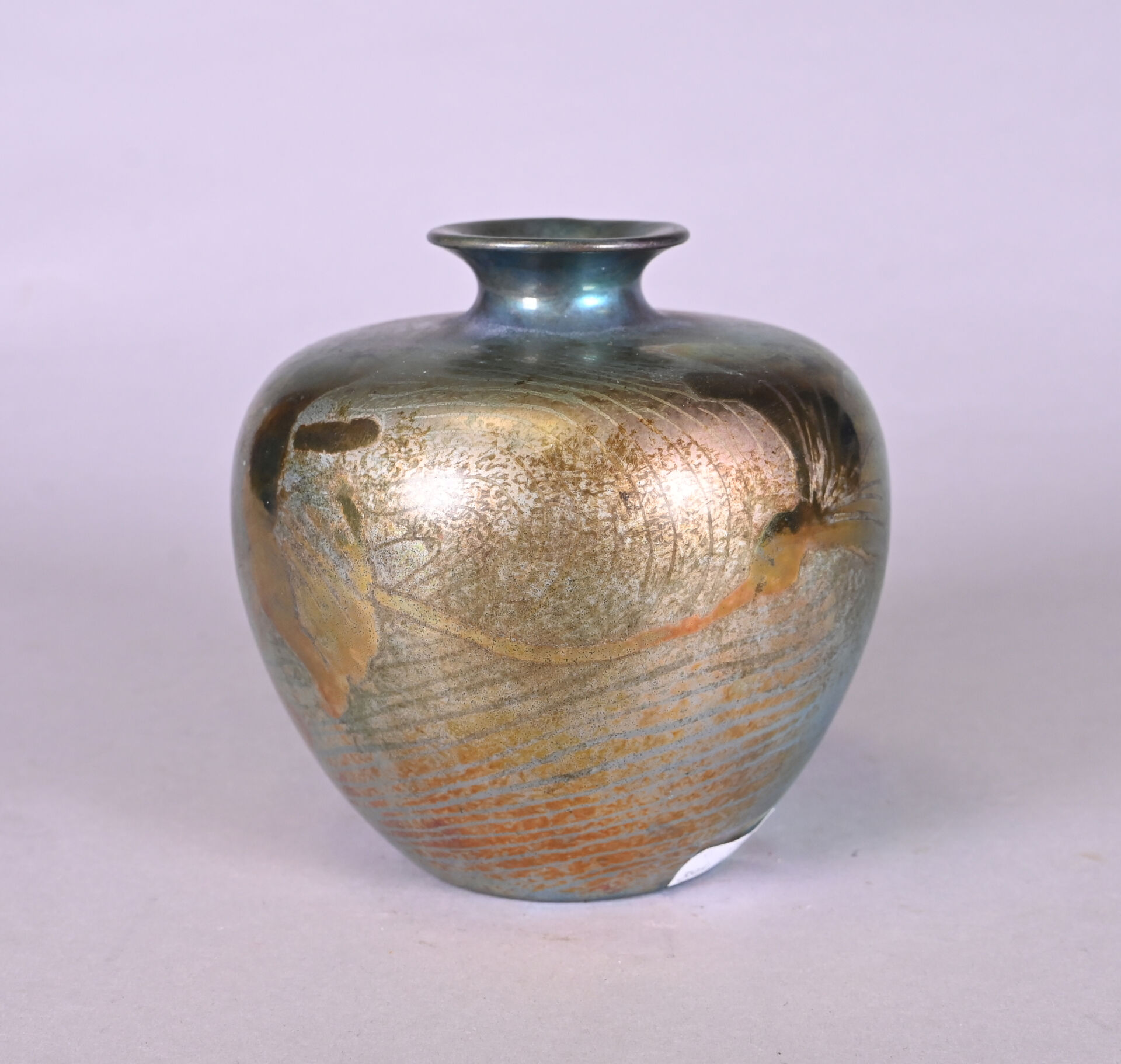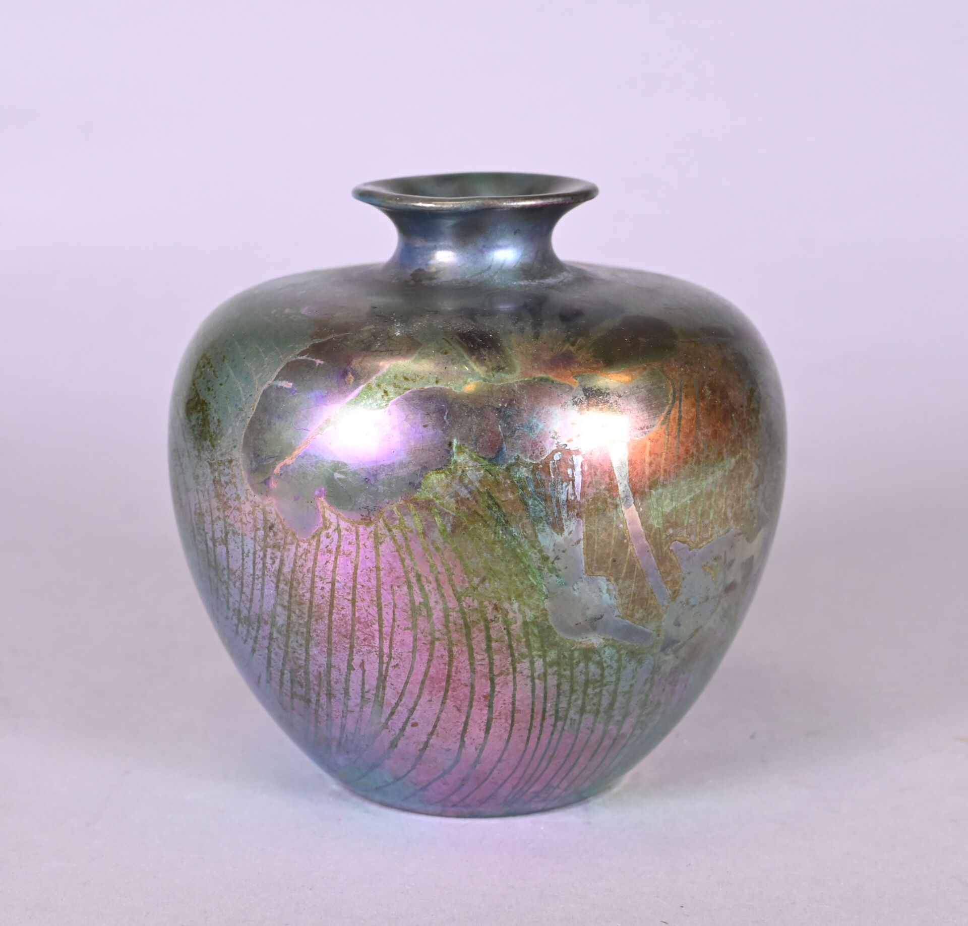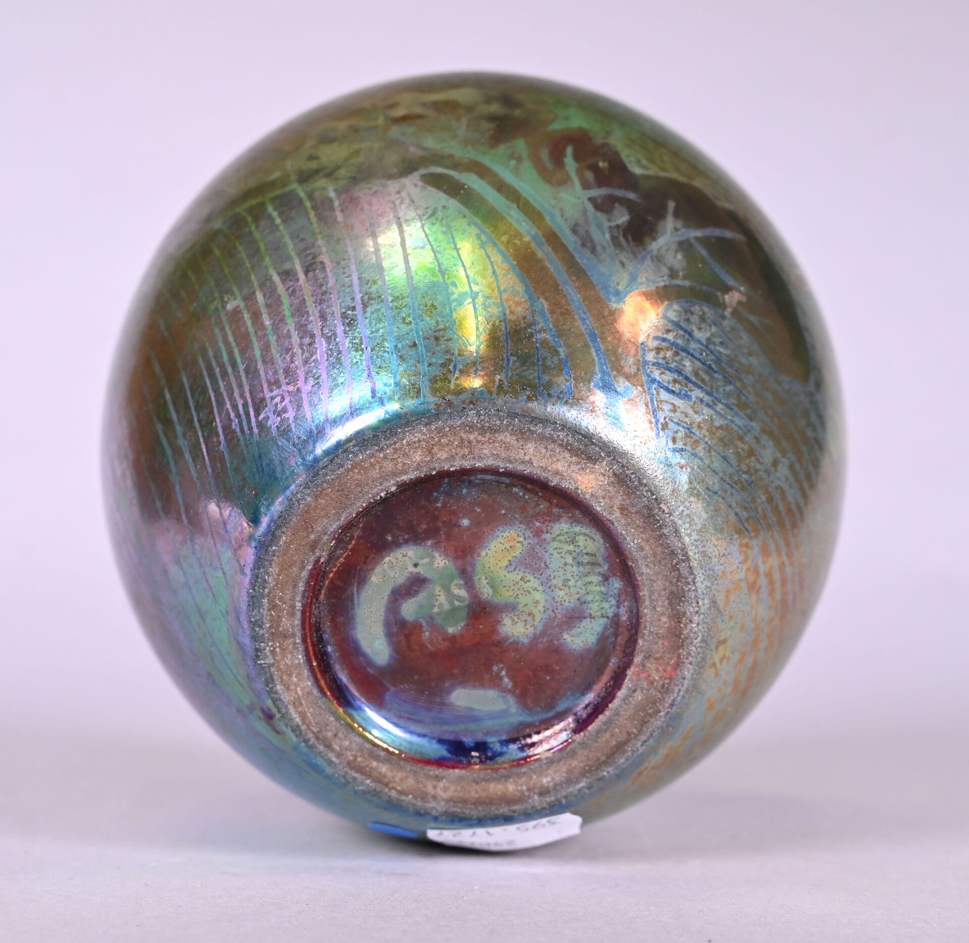 Dans le goût de Clément MASSIER à Vallauris. Vase boule à col resserré en céramique émaillée à reflets irisés de fleurs sur fond rayé. Marqué au dessous. Haut. : 14 cm.