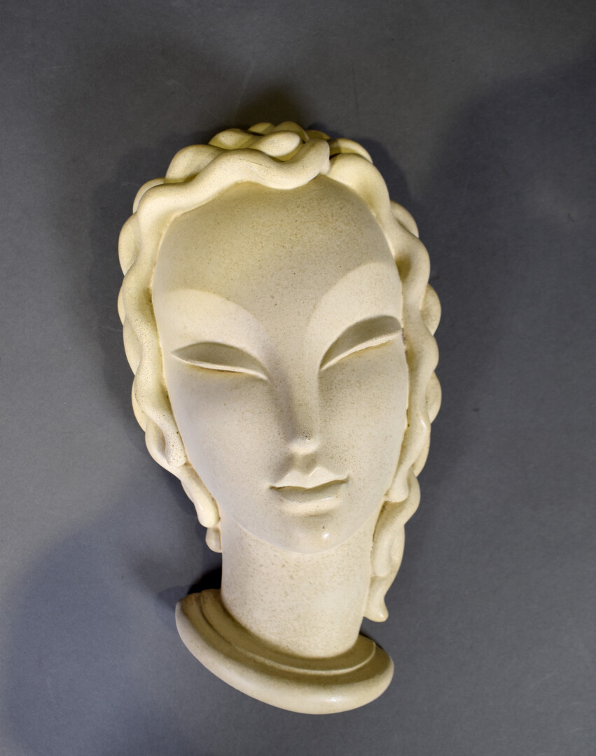 Dans le goût de Colette GUEDEN. Tête de femme en pierre reconstituée (petites restaurations). Haut. : 33 cm.