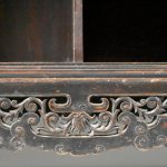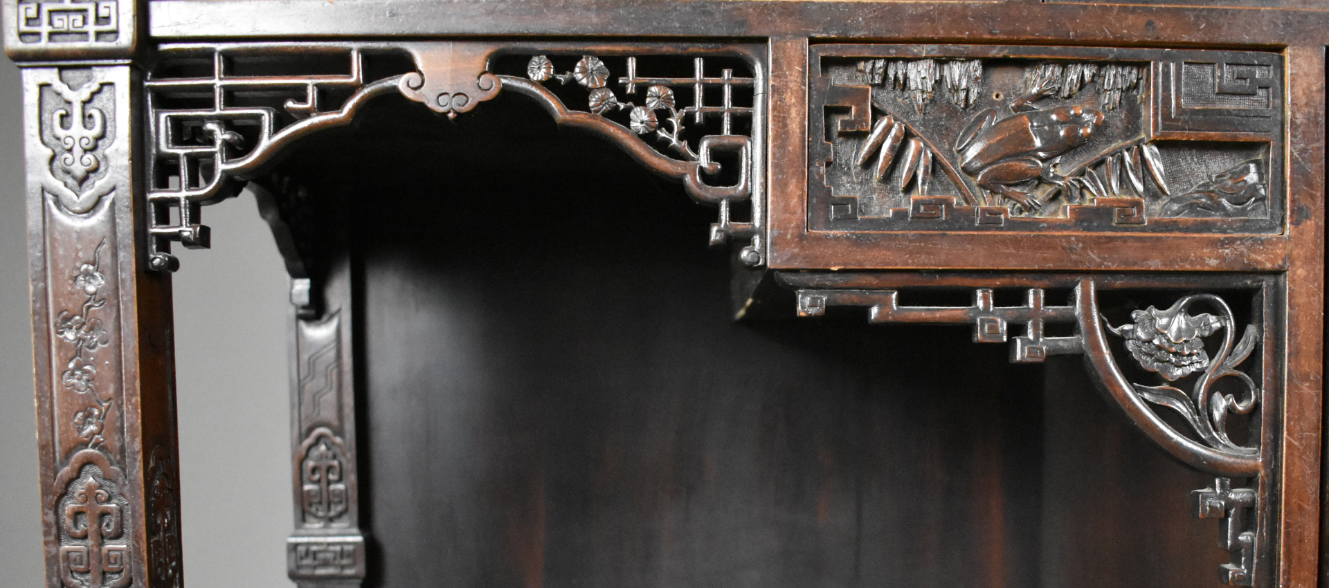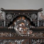 Dans le goût de Gabriel VIARDOT. Meuble étagère en bois teinté à décor sculpté de dragons, chimères, grenouilles, pagodes et motifs d’inspiration chinoise (éclats, manques et mouillures). Il ouvre à quatre tiroirs, dont un secret et trois vantaux. Tablier et piétement à motif de nuages. Travail indochinois ou d’Asie du Sud-Est, fin du XIXe siècle ou début du XXe siècle. Haut. : 167 cm – Larg. : 132 cm – Prof. : 43,5 cm.