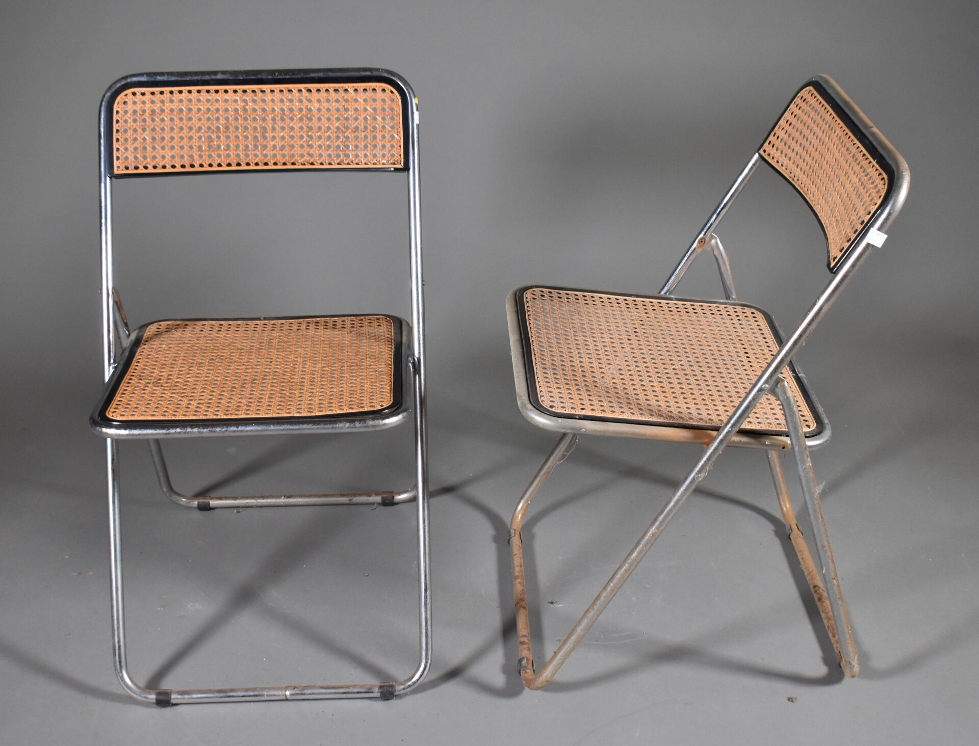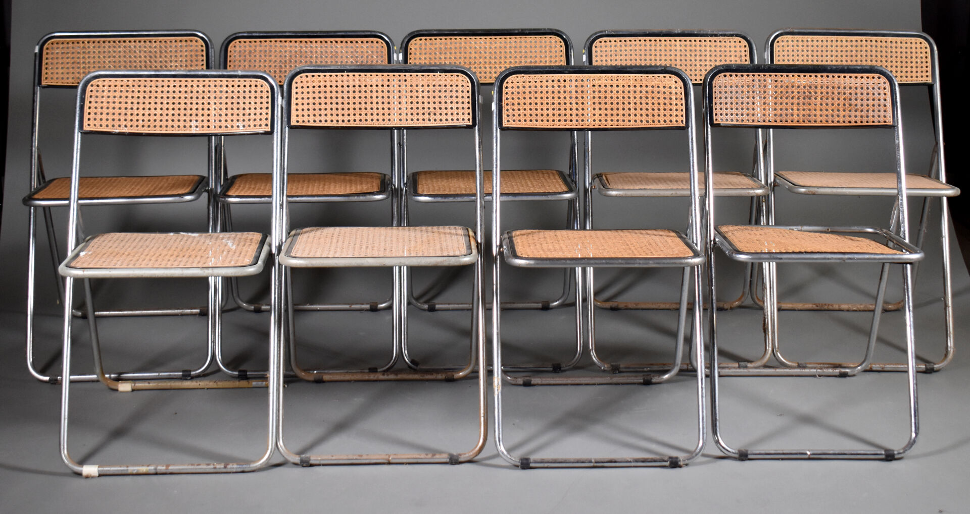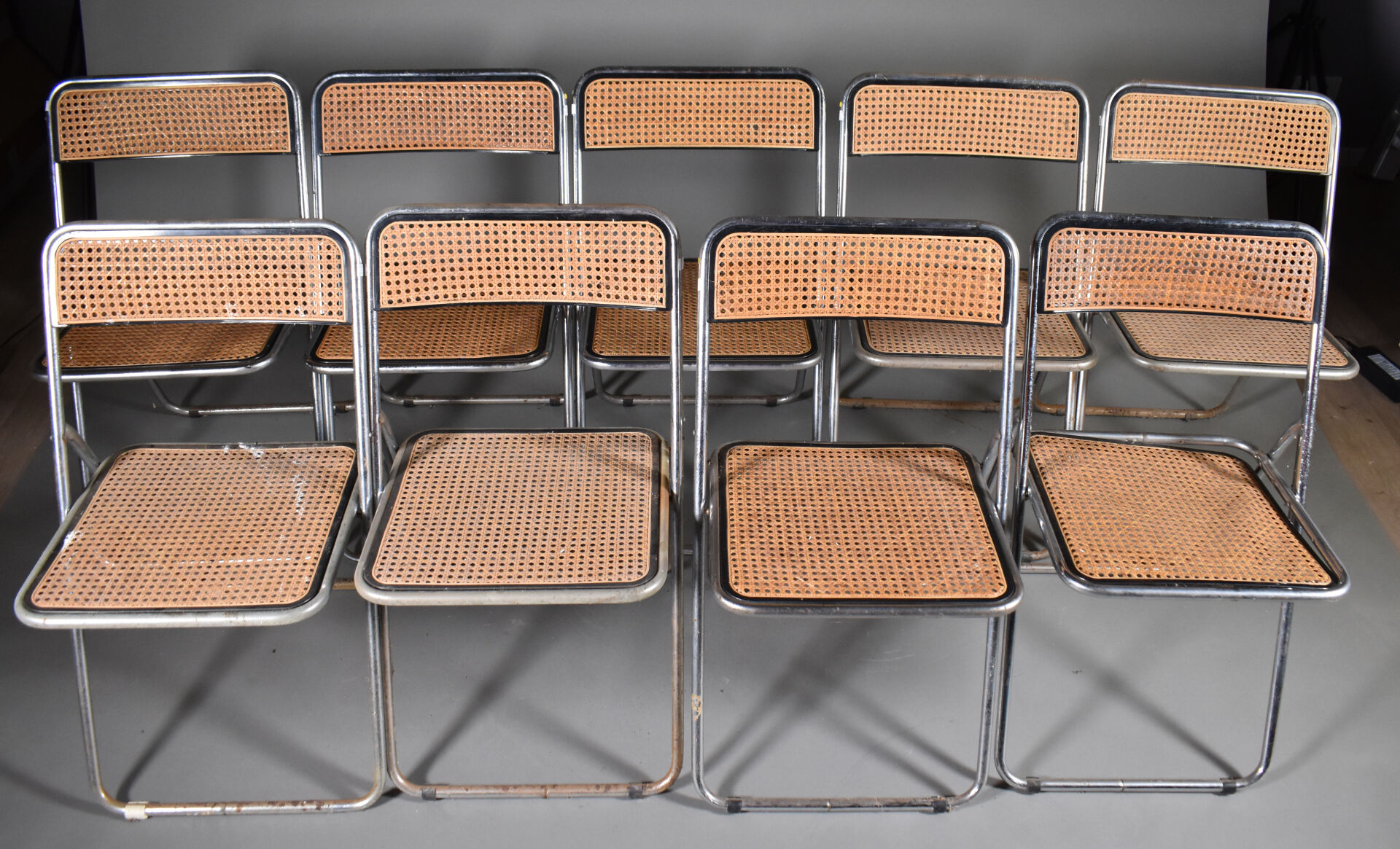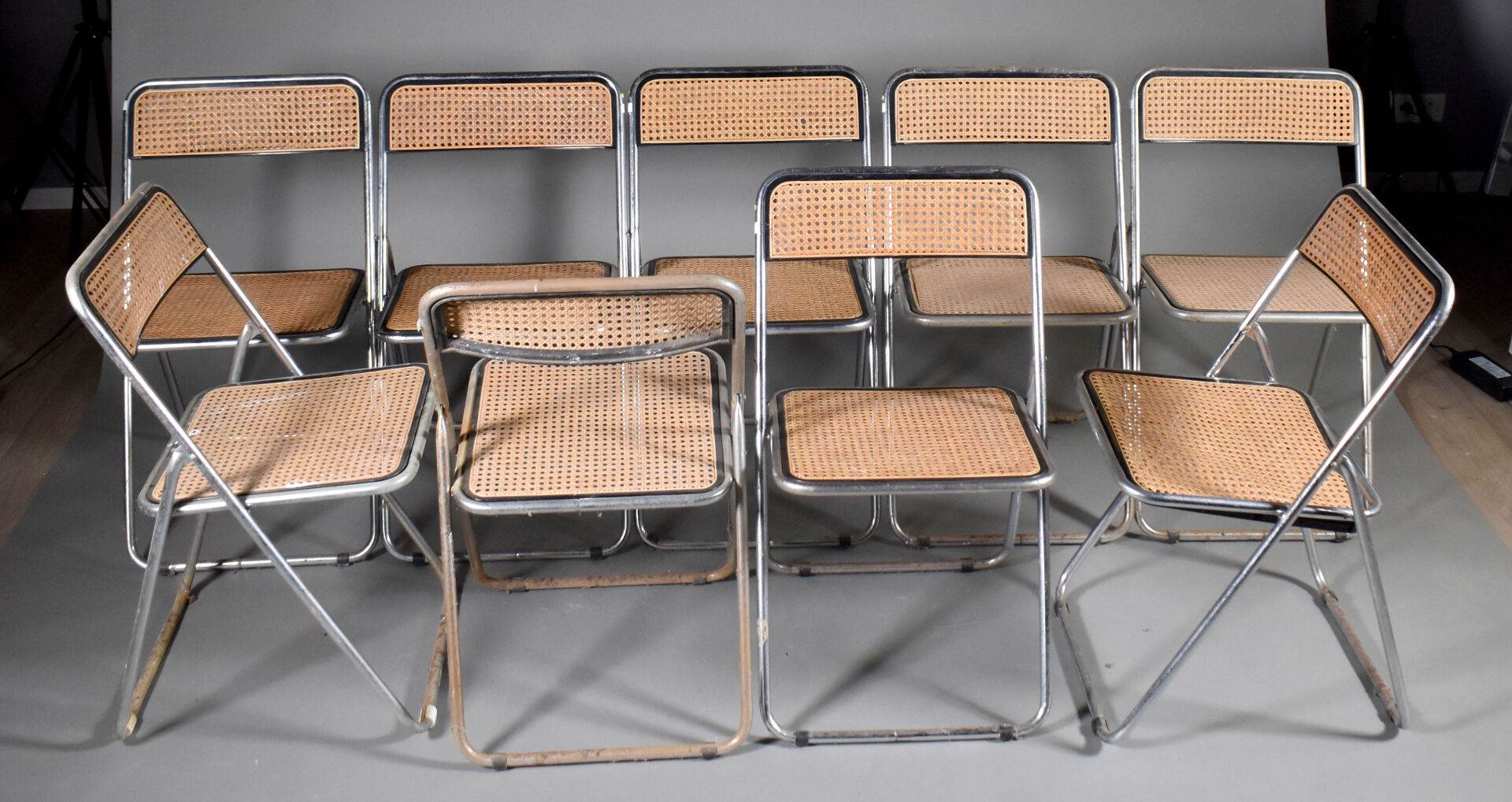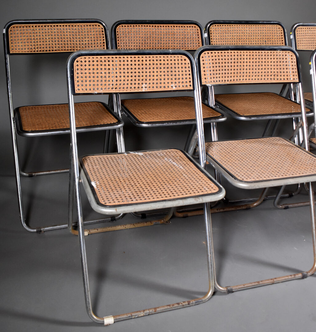 Dans le goût de Giancarlo PIRETTI. Suite de 9 chaises pliantes en métal tubulaire chromé, les dossiers et assises cannés (piqures). Vers 1970. Haut. : 78 cm.