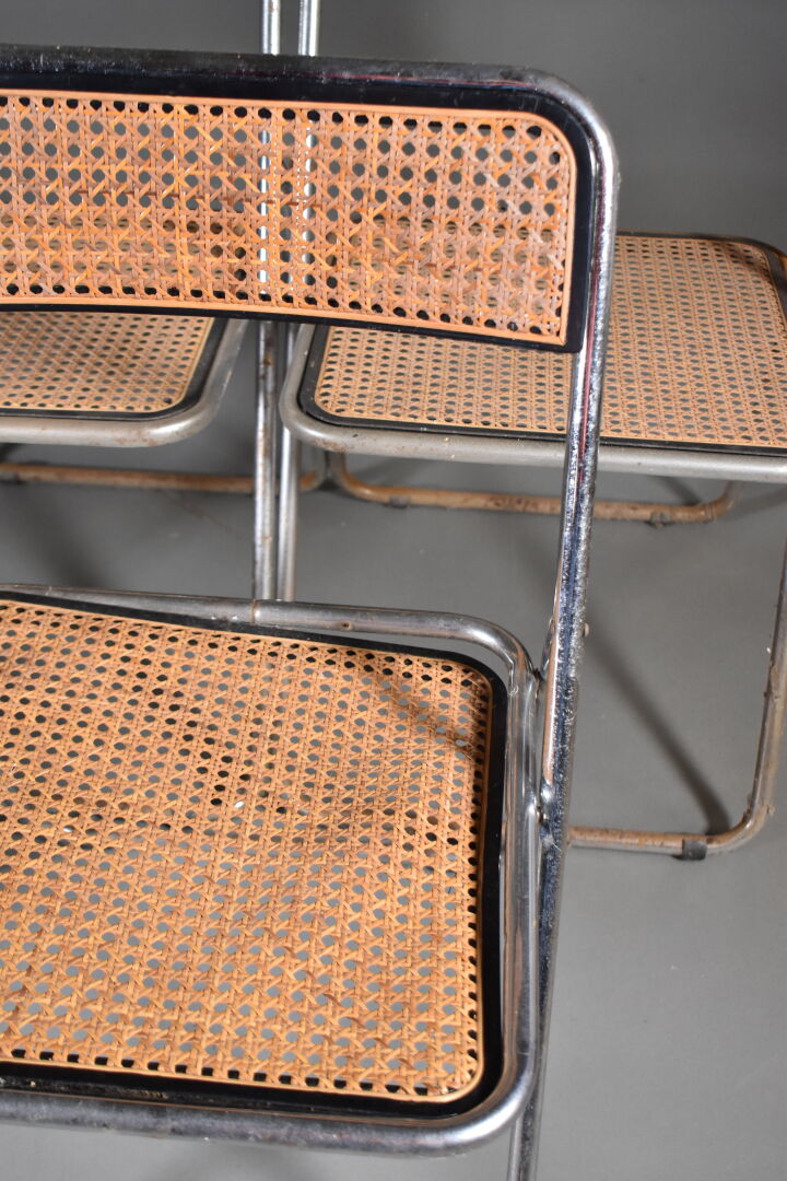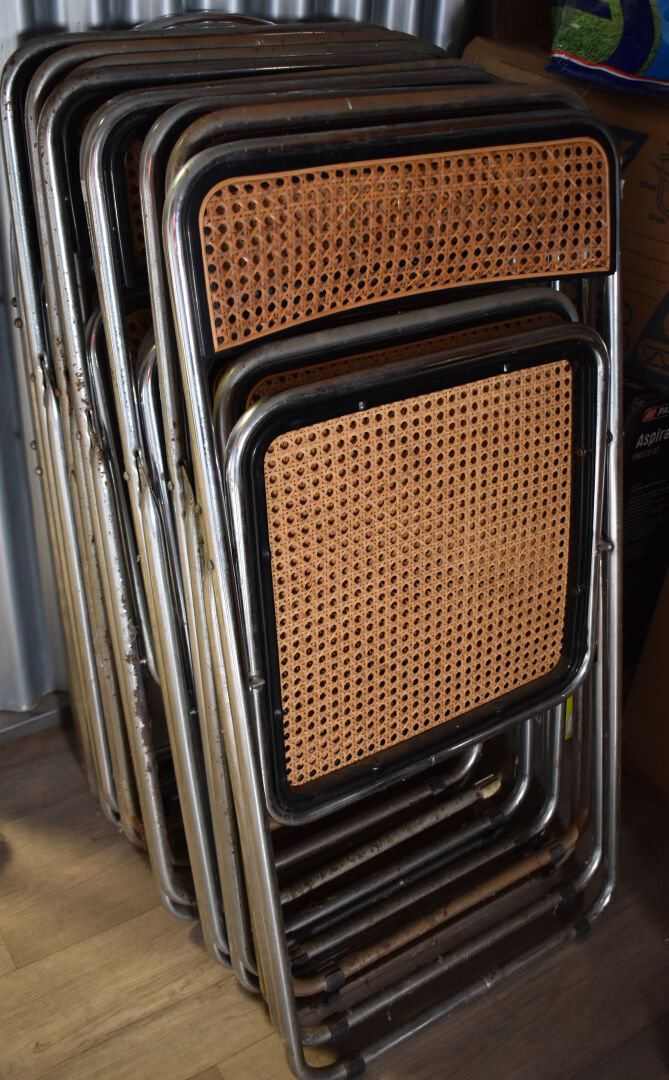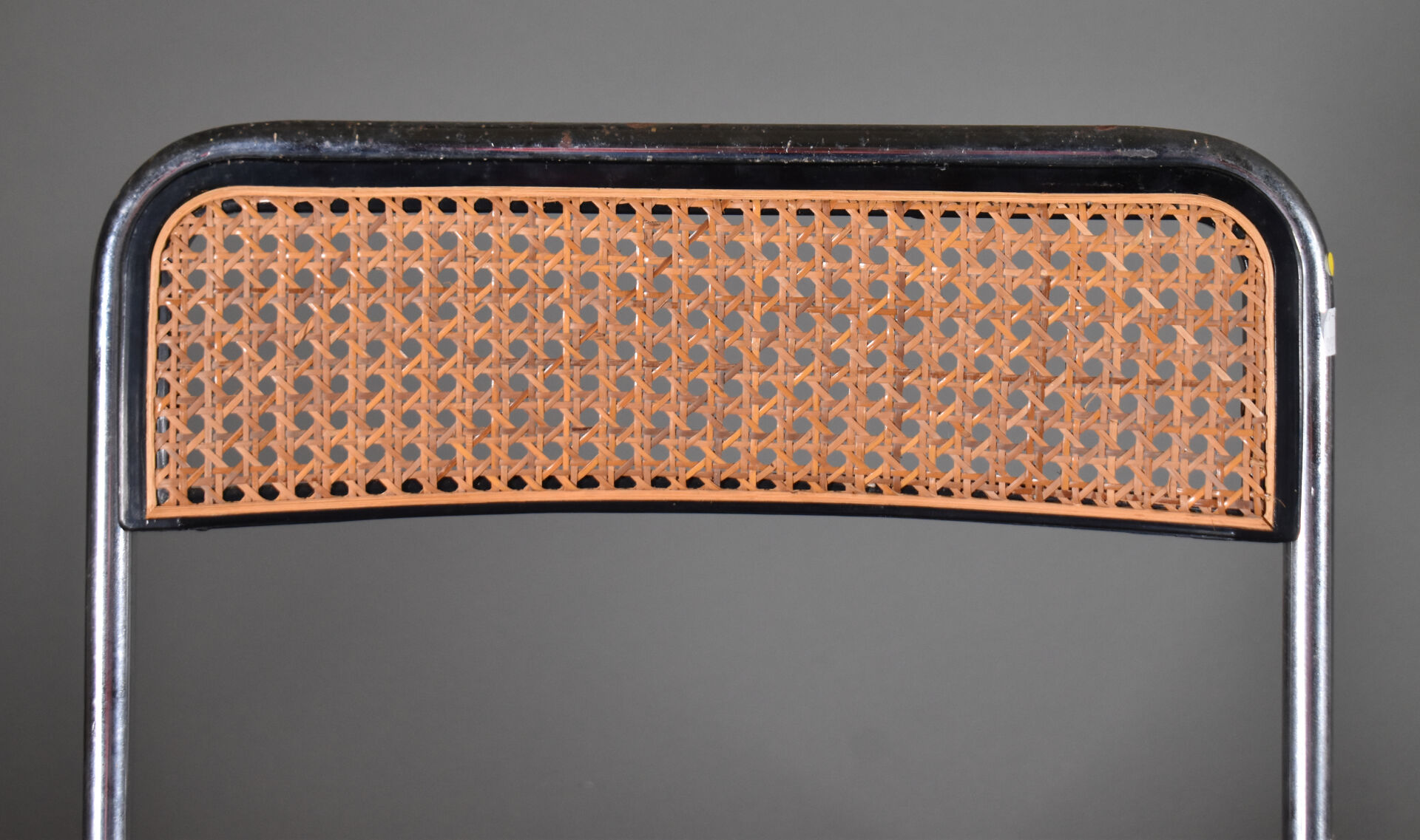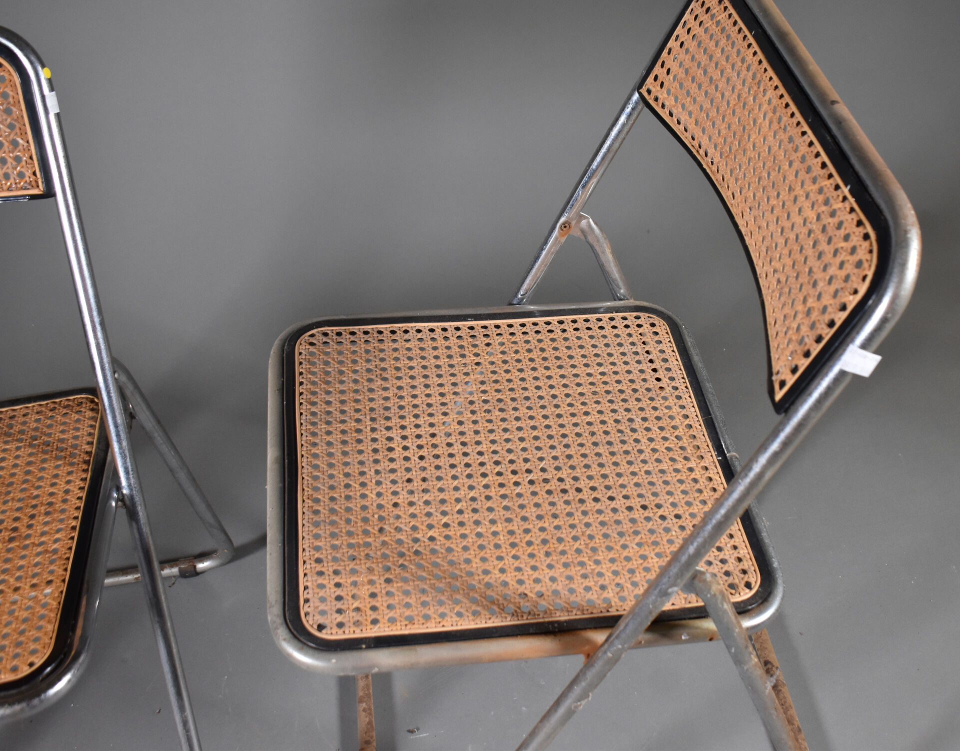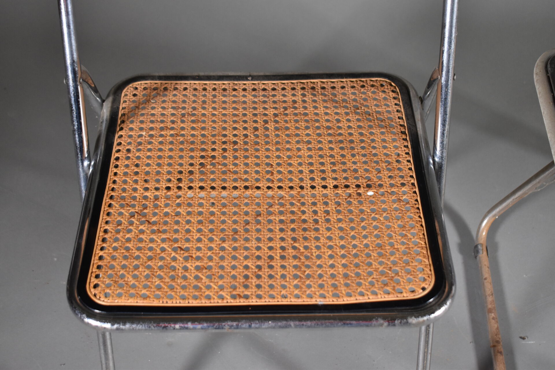 Dans le goût de Giancarlo PIRETTI. Suite de 9 chaises pliantes en métal tubulaire chromé, les dossiers et assises cannés (piqures). Vers 1970. Haut. : 78 cm.