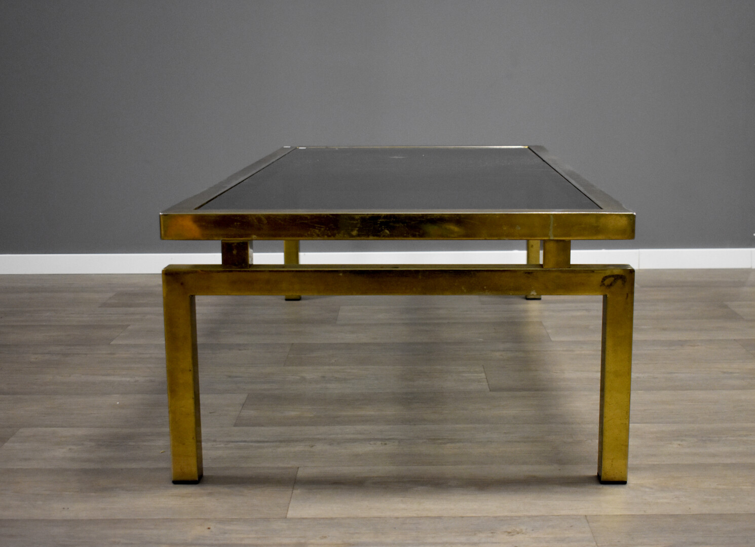 Dans le goût de Guy LEFÈVRE. Table basse à piétement de section carré en métal argenté anciennement doré. Plateau de verre fumé rectangulaire (éclats). Vers 1970/80. Haut. : 41 cm – Larg. : 138 cm – Prof. : 68 cm.