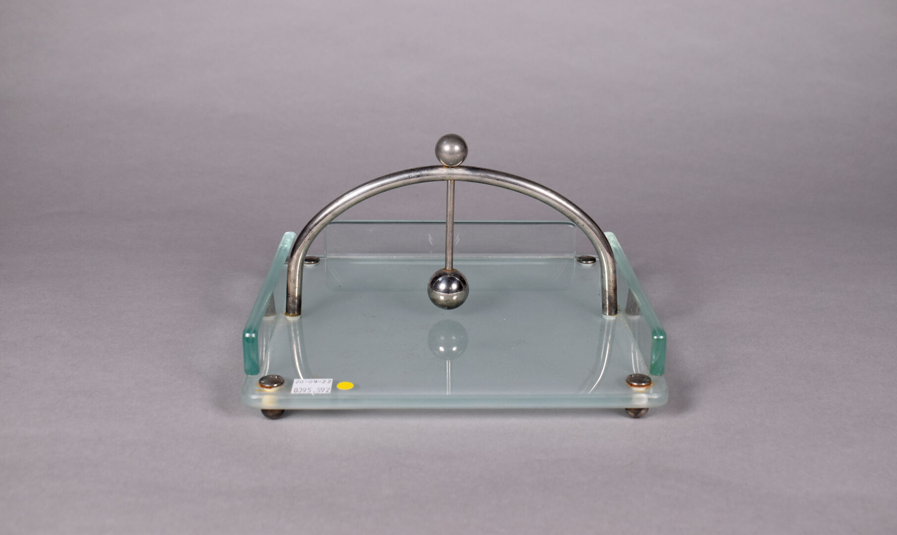 Dans le goût de Jacques ADNET (1900 – 1984). Presse papier en métal chromé et verre partiellement dépoli. Haut. : 13 cm – Larg. : 22 cm – Prof. : 22 cm.