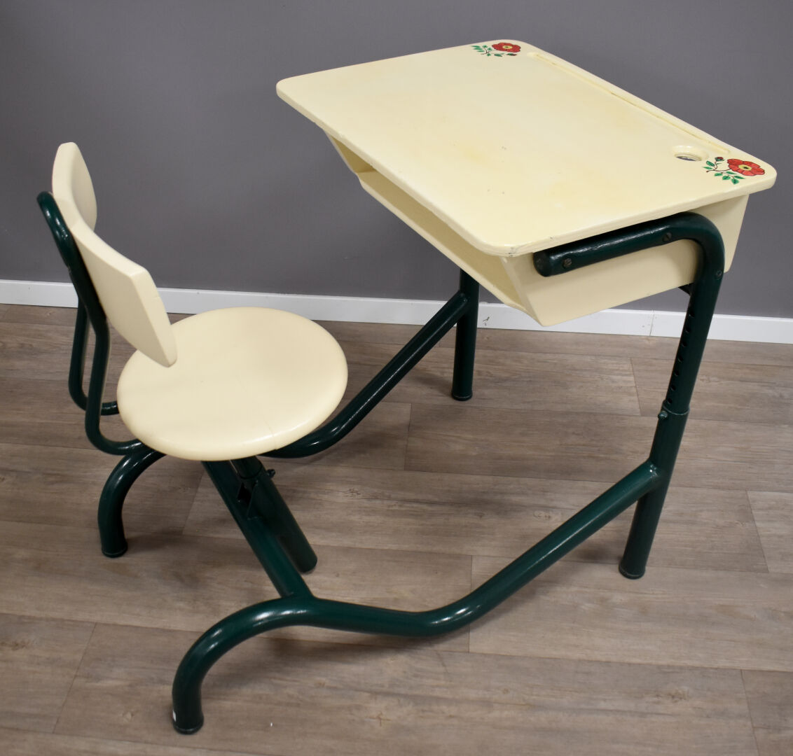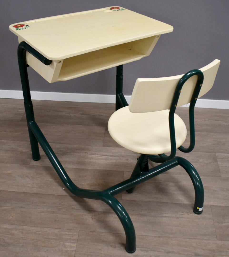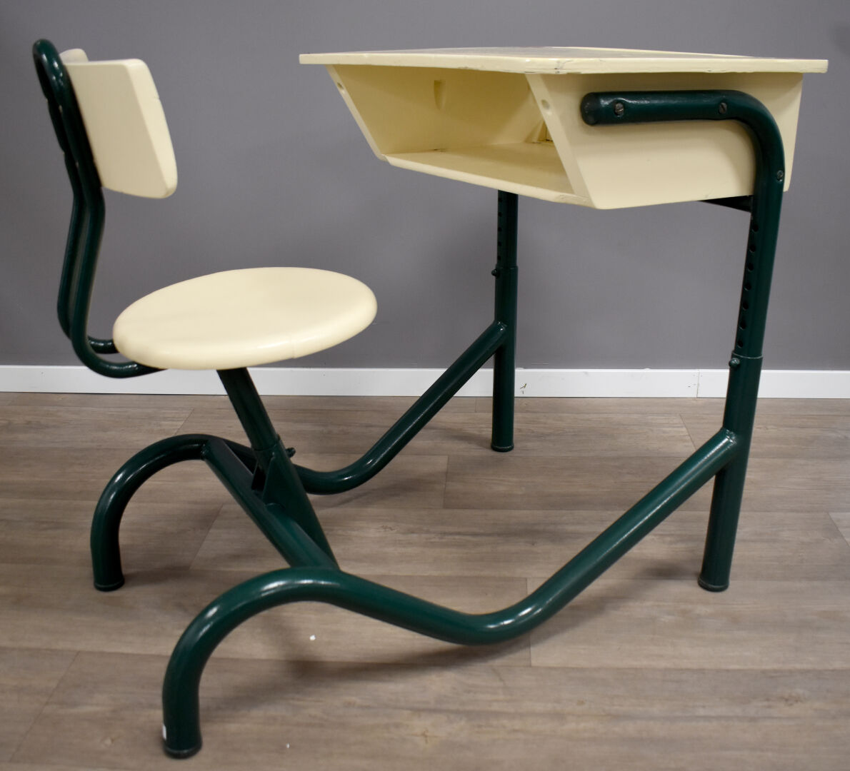 Dans le goût de Jean PROUVE (1901-1984). Pupitre d’écolier en bois et métal relaqué vert et crème. Haut. : 71,5 cm – Larg. : 61 cm – Prof. : 90 cm.