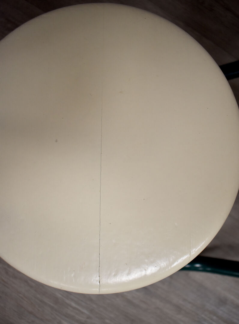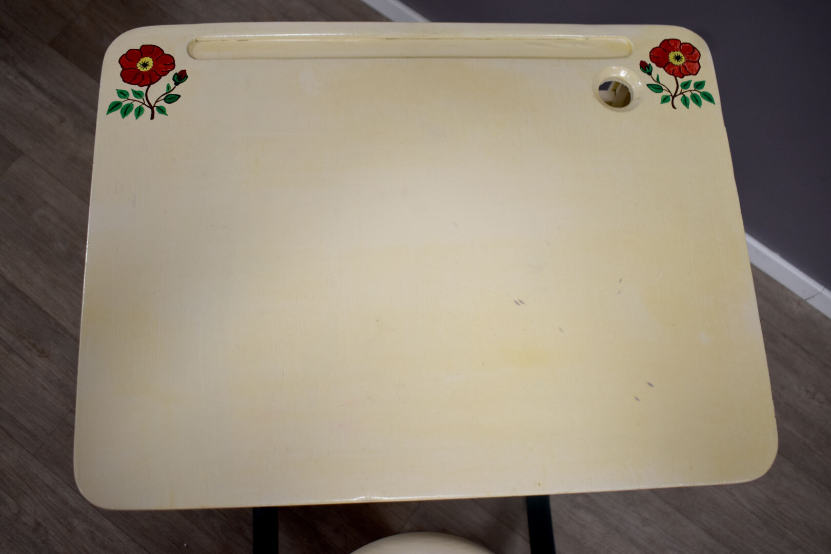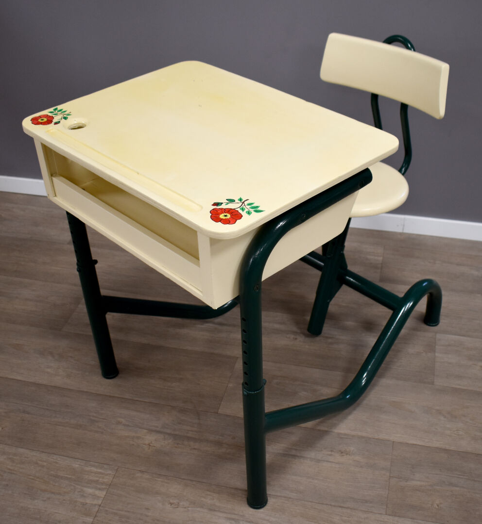 Dans le goût de Jean PROUVE (1901-1984). Pupitre d’écolier en bois et métal relaqué vert et crème. Haut. : 71,5 cm – Larg. : 61 cm – Prof. : 90 cm.