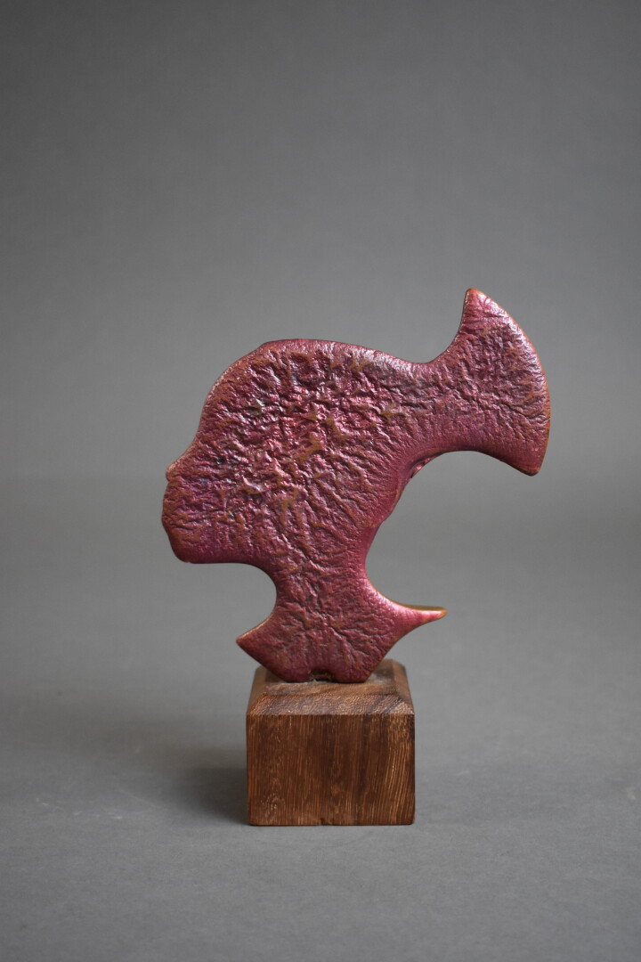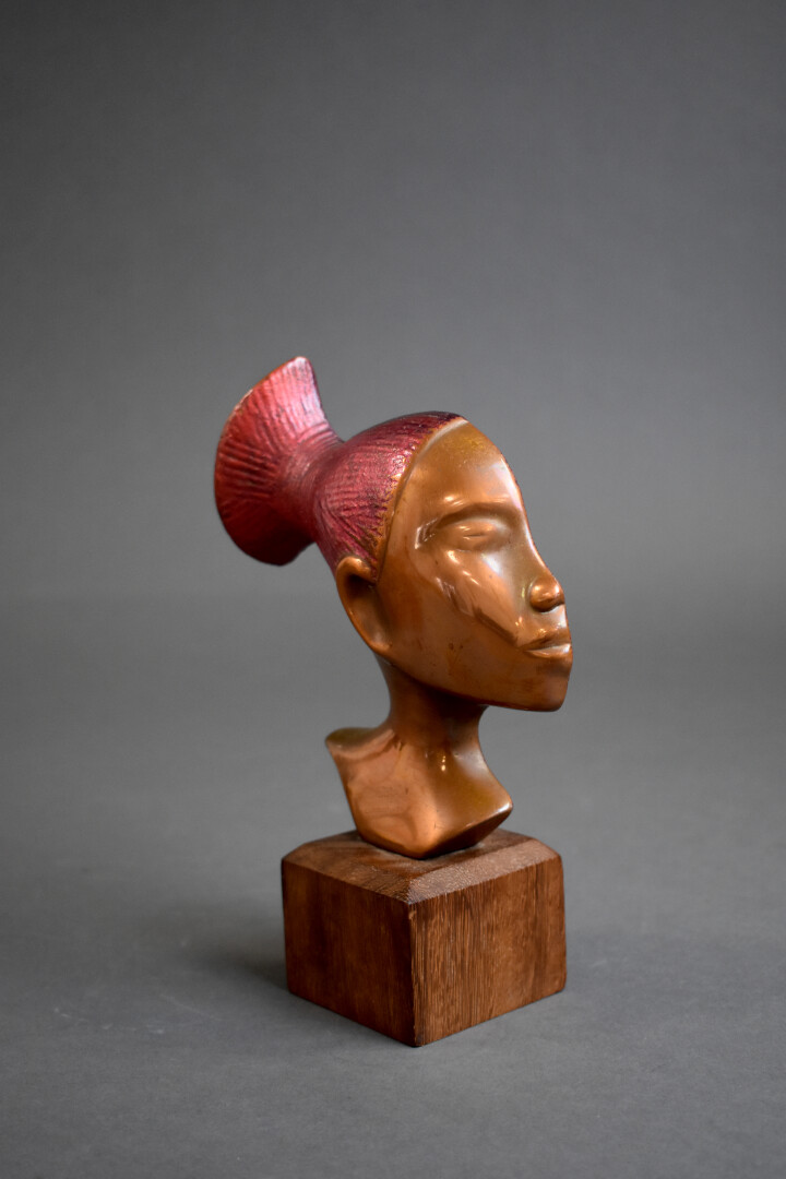 Dans le goût de Karl HAGENAUER. Tête de femme africaine, de profil, en bronze, partiellement patiné rouge. Socle en bois exotique. Haut. : 20,5 cm.