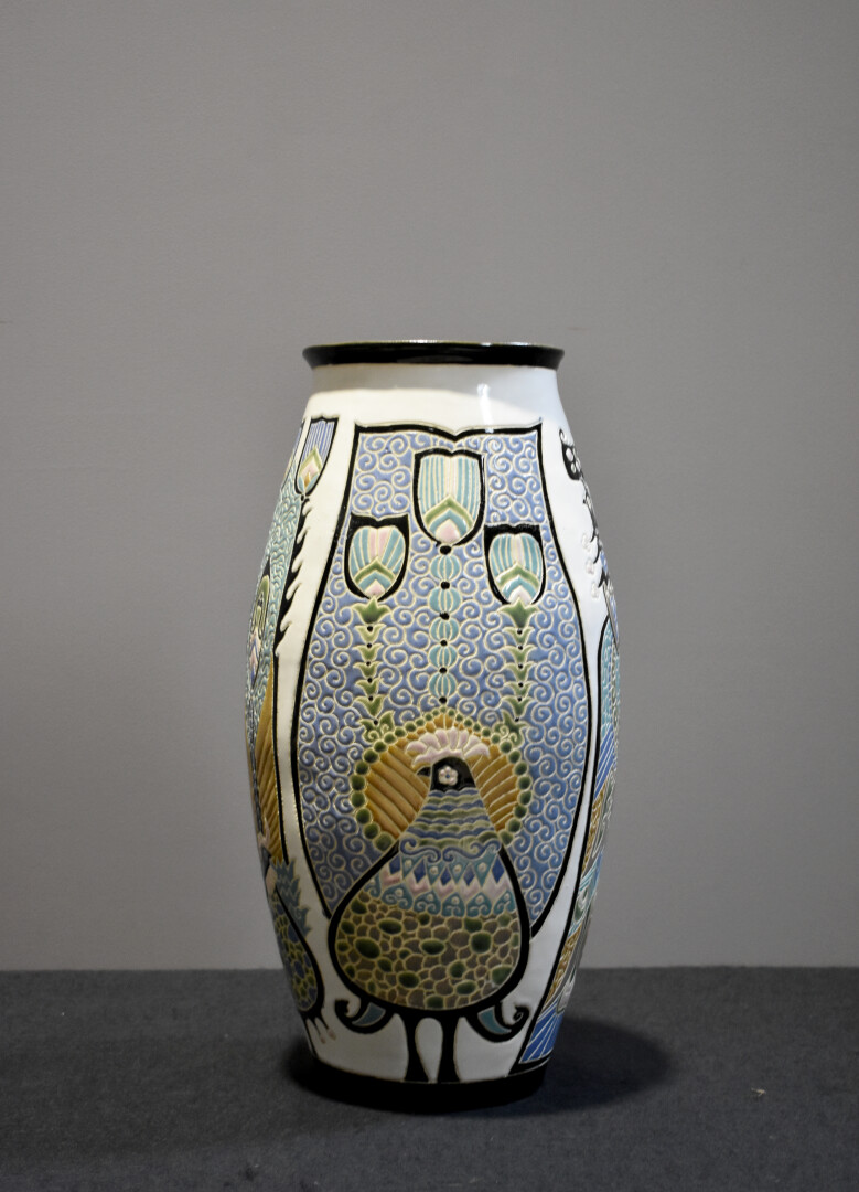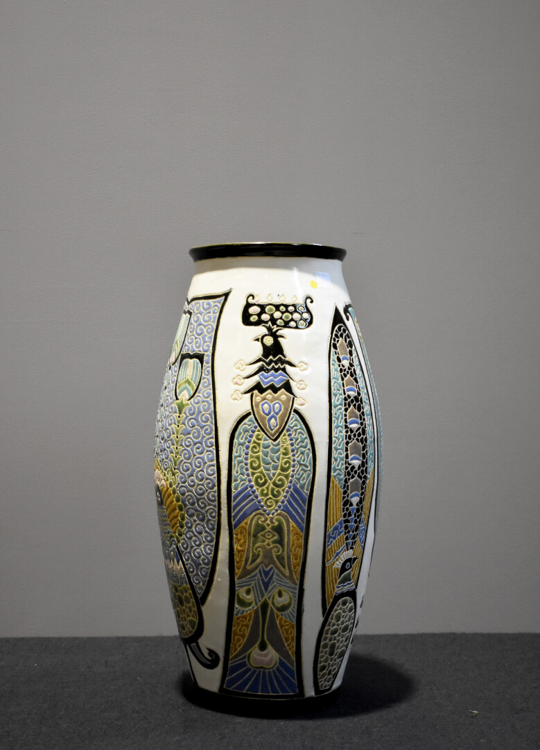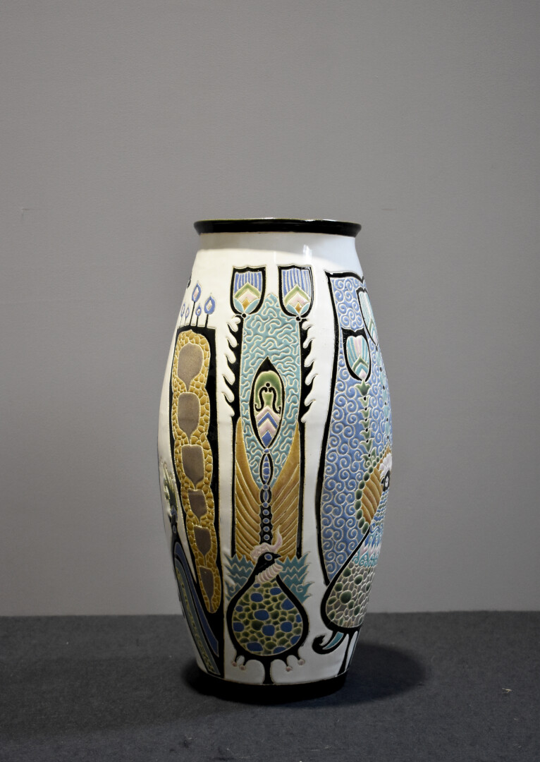 Dans le goût de KERAMIS. Grand vase fuselé en céramique à décor émaillé en polychromie d’oiseaux fantastiques. Première moitié du XXe siècle. Haut. : 47 cm.