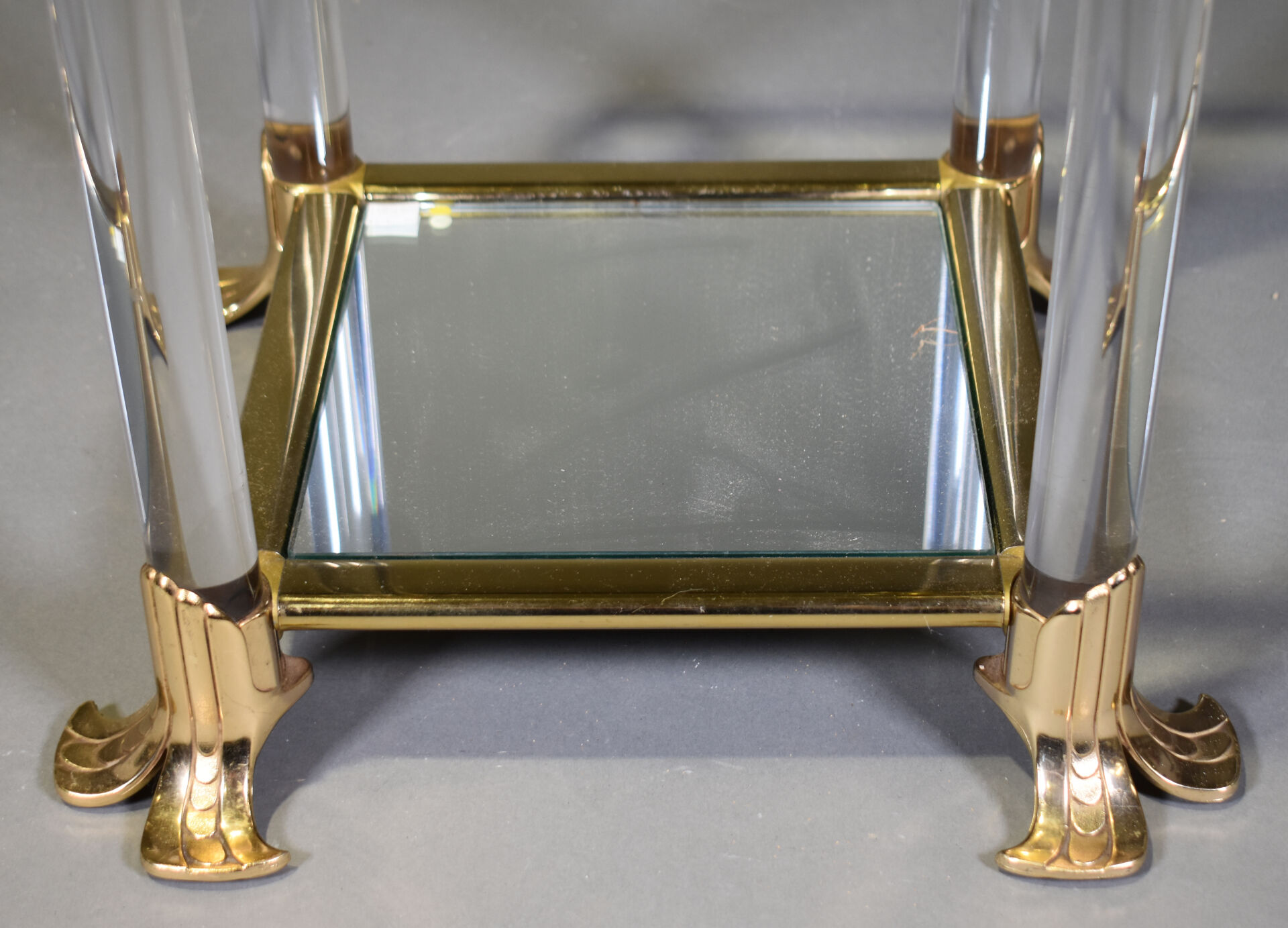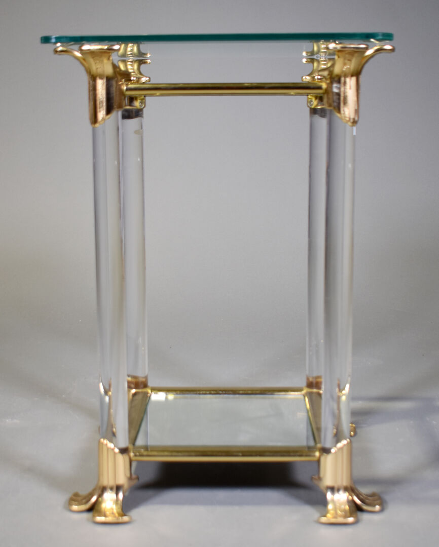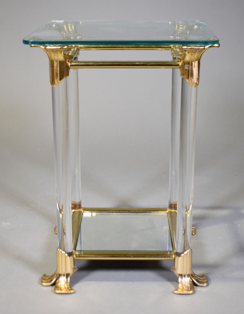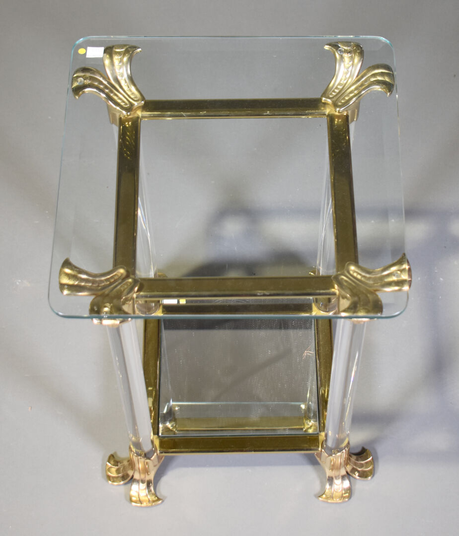 Dans le goût de la maison Le DAUPHIN. Bout de canapé à structure en métal et composition dorés, les montants en plexiglas, les plateau en verre biseauté pour le supérieur et glace pour l’inférieur. Vers 1970/1980. Haut. : 57,5 cm, Larg. et Prof. : 40 cm.