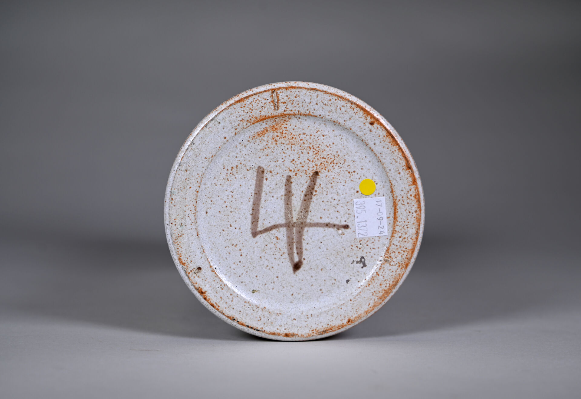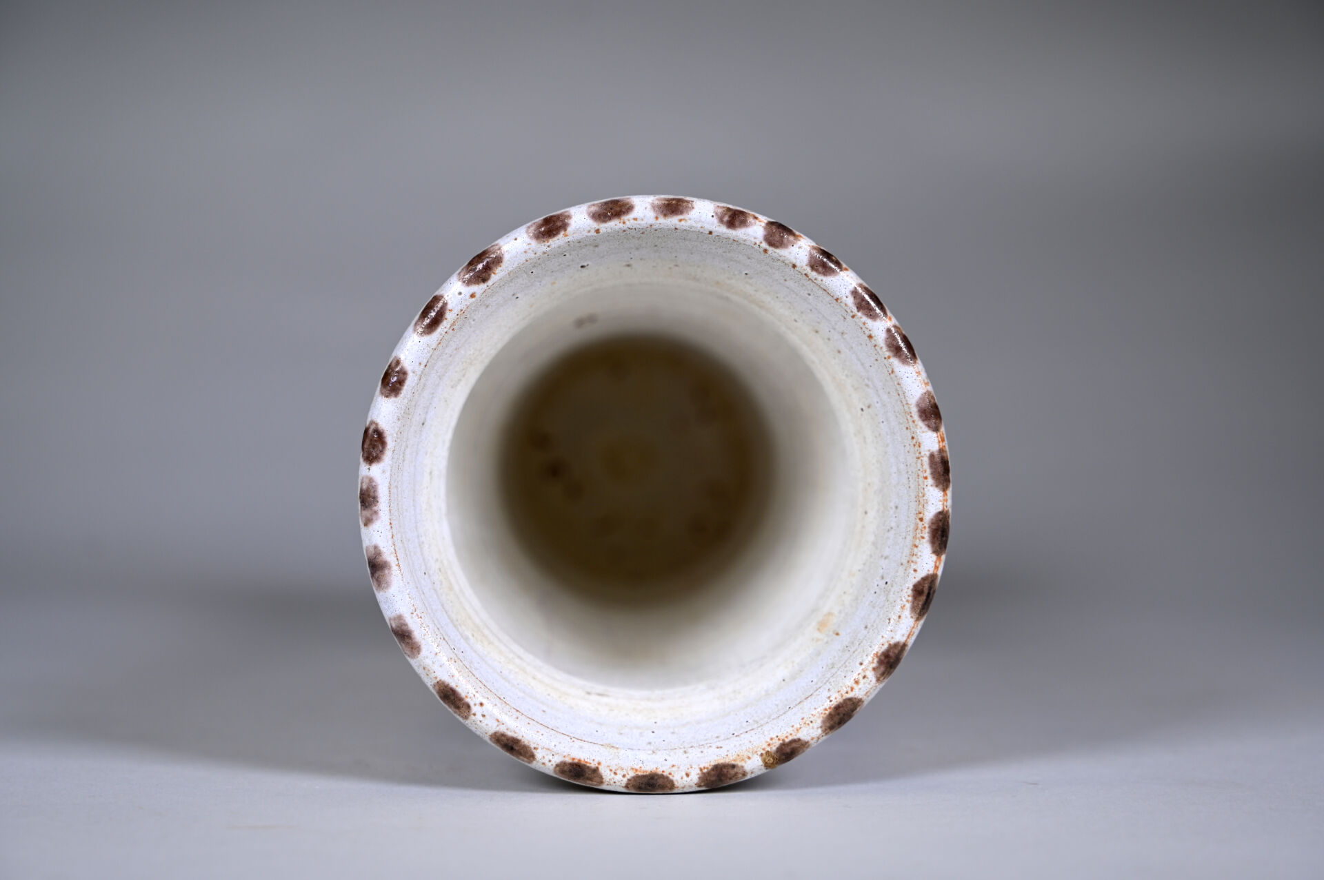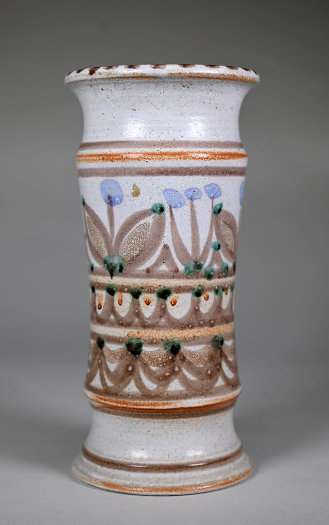 Dans le goût de l’atelier Le Murier à Vallauris. Vase rouleau annelé en céramique émaillée en ocre vert et bleu d’un bandeau végétal et motifs géométriques sur fond crème. Porte une marque au dessous. Milieu du XXe siècle. Haut. : 29 cm.