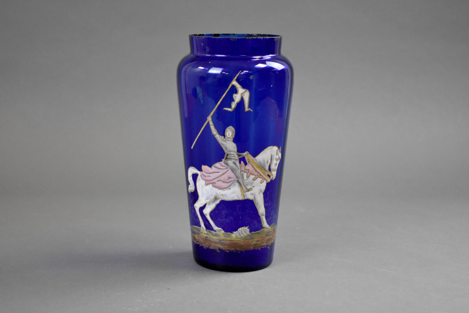 Dans le goût de LEGRAS. Vase fuseau en verre bleu à décor émaillé en polychromie de Jeanne d’Arc. Haut.: 27 cm.