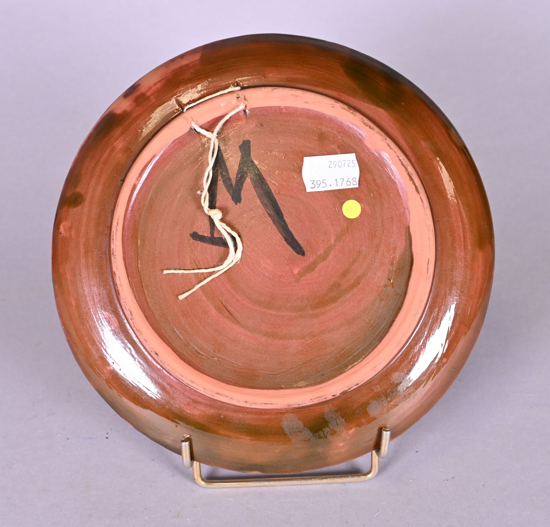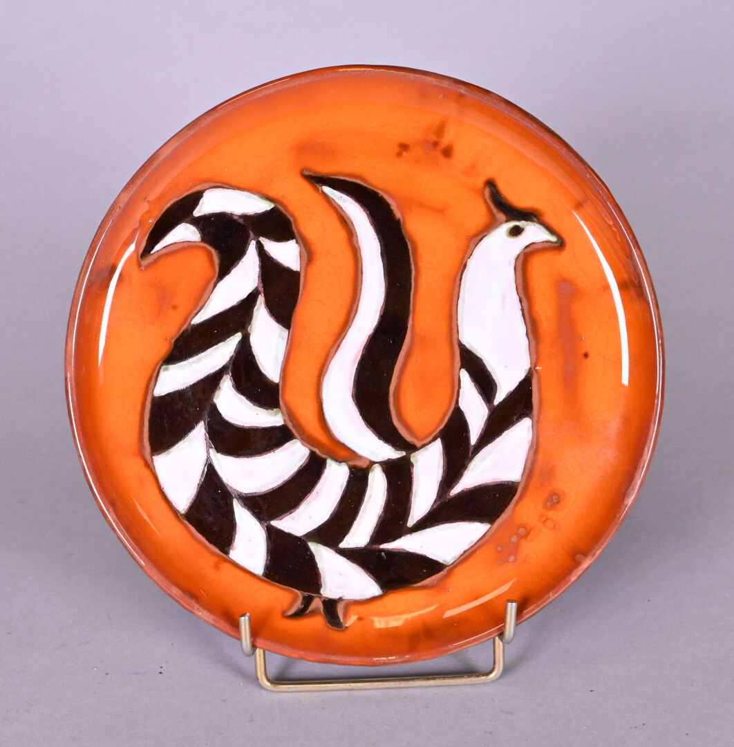 Dans le goût de Lurçat. Assiette en céramique émaillée d’un oiseau en noir et blanc sur fond orange. Monogramme au dos. Diam. : 20,5 cm.