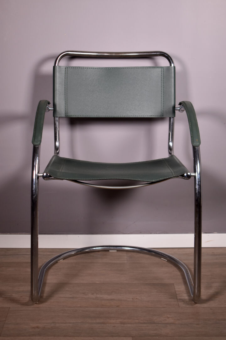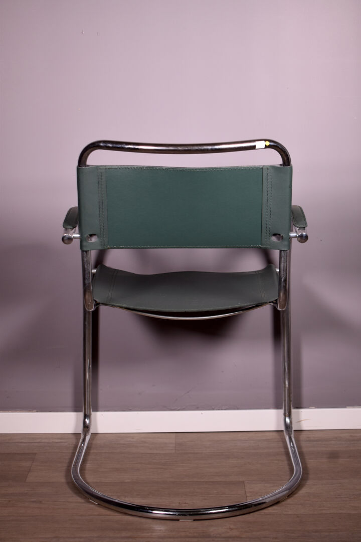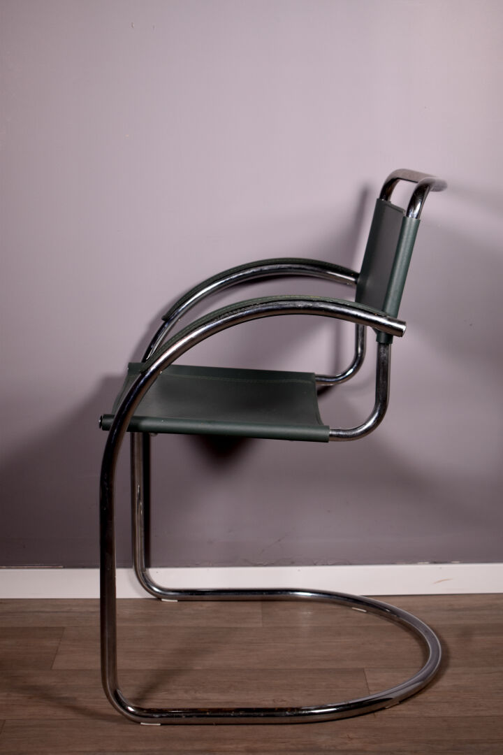 Dans le goût de Marcel BREUER. Fauteuil de bureau en métal tubulaire chromé, garniture de skaï vert. Vers 1970/1980. Haut. : 81 cm.