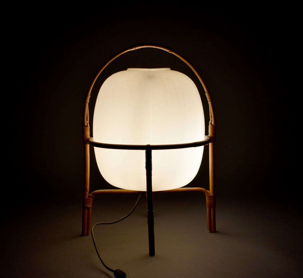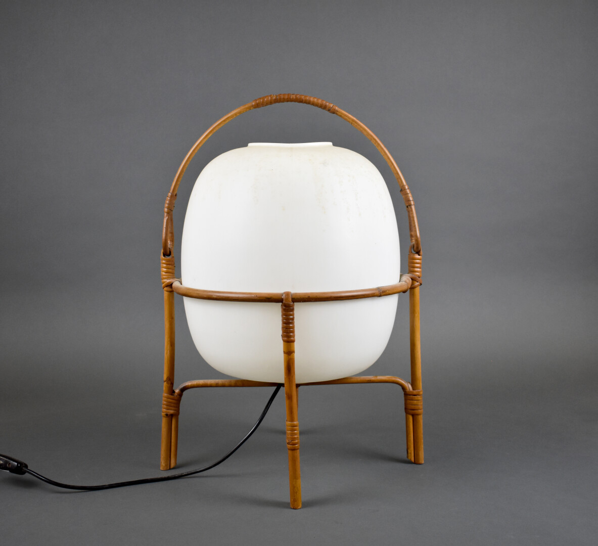 Dans le goût de Miguel MILA. Lampe dans le goût du modèle « Cestita » en rotin et résine crème. Éditeur Tramo. Vers 1962. Haut. : 46 cm (sans l’anse).