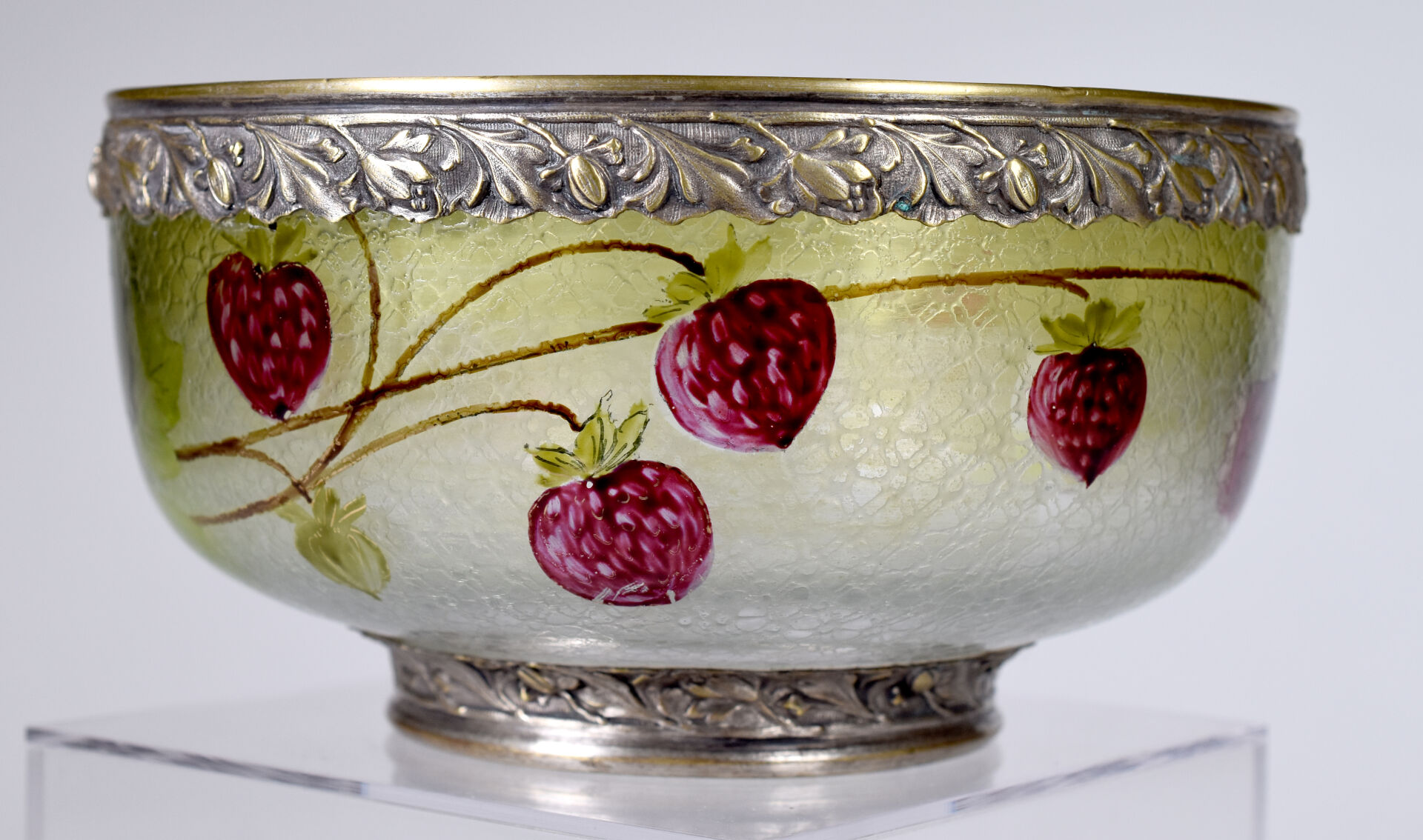 Dans le goût de Montjoye. Coupe en verre émaillé de fraises sur fond craquelé. Monture en métal argenté (usures à l’argenture). Haut. : 9 cm – Diam. : 17 cm.