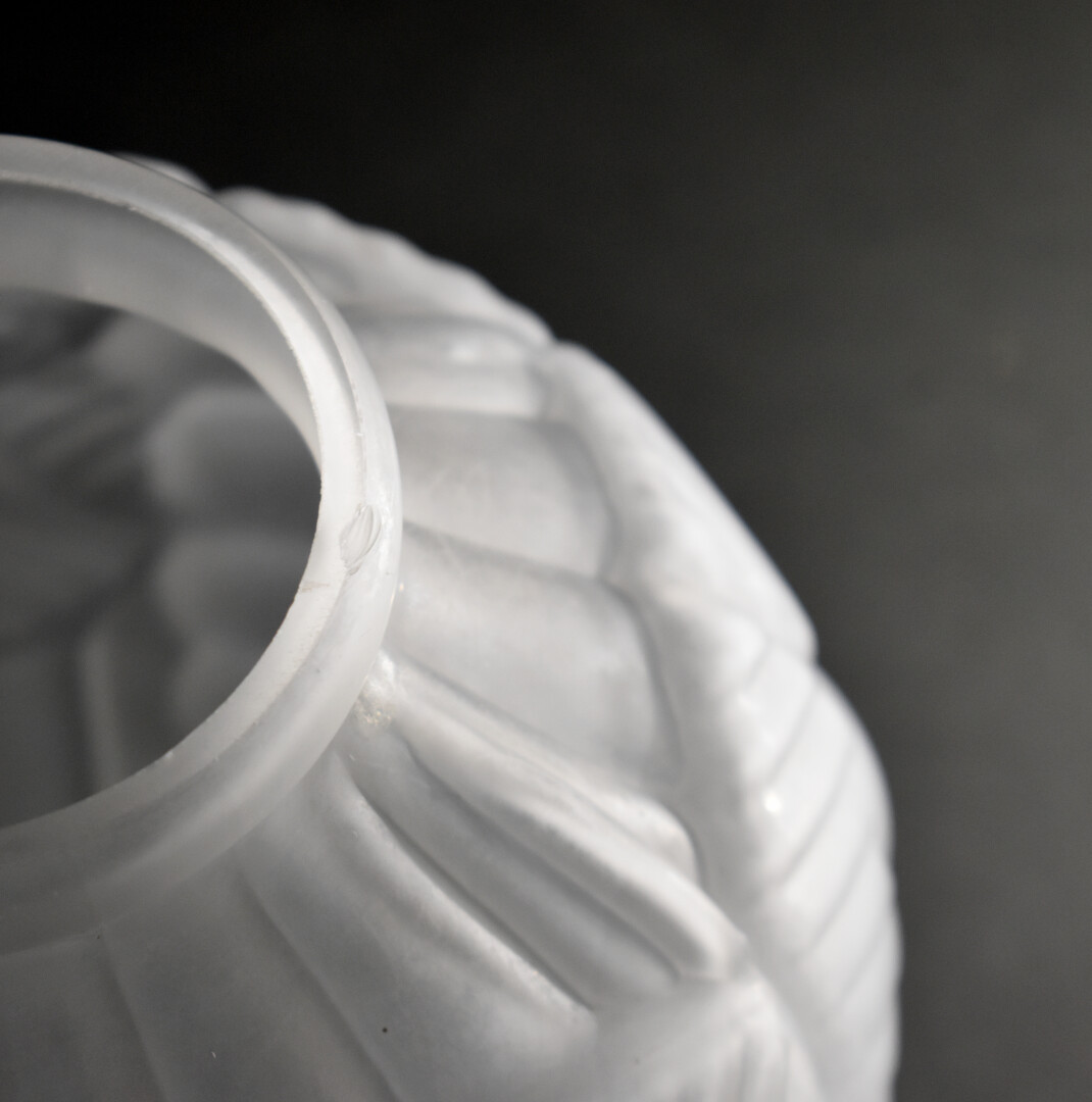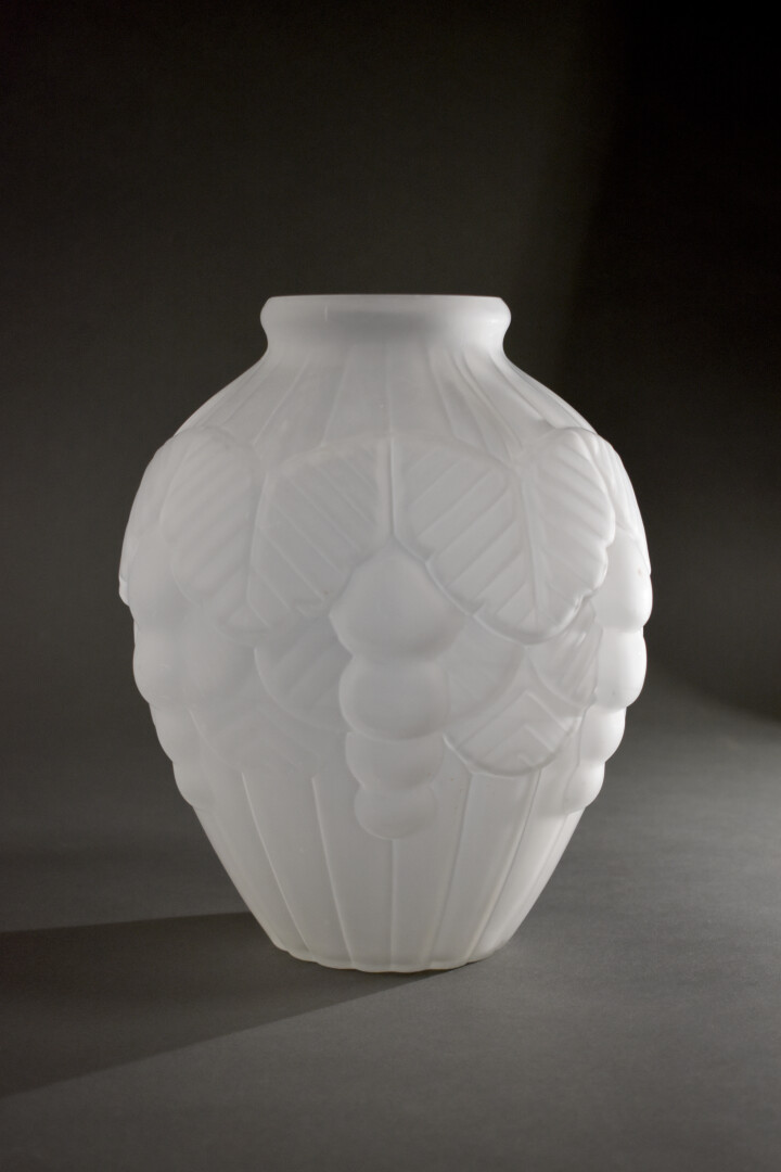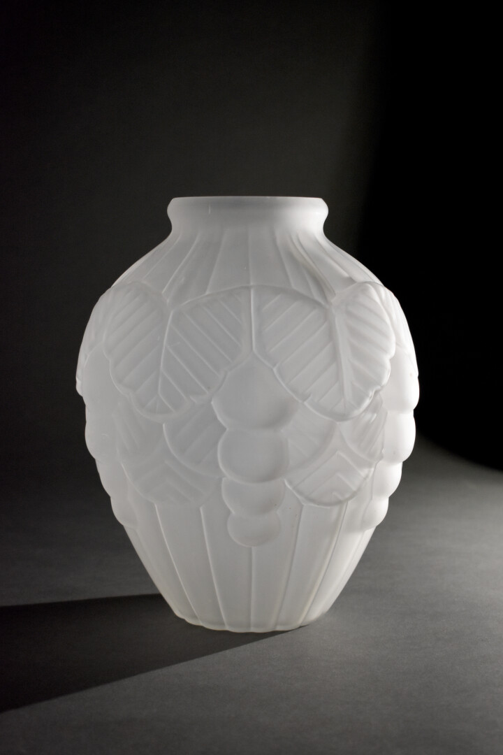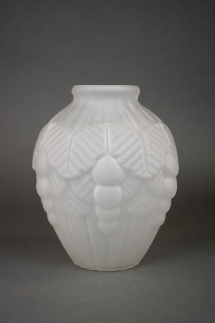 Dans le goût de MULLER. Vase en verre moulé dépoli à décor de grape de fruit (un éclat au col). Epoque Art déco. Haut. : 24,5 cm.