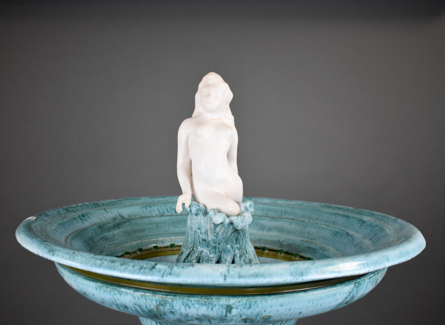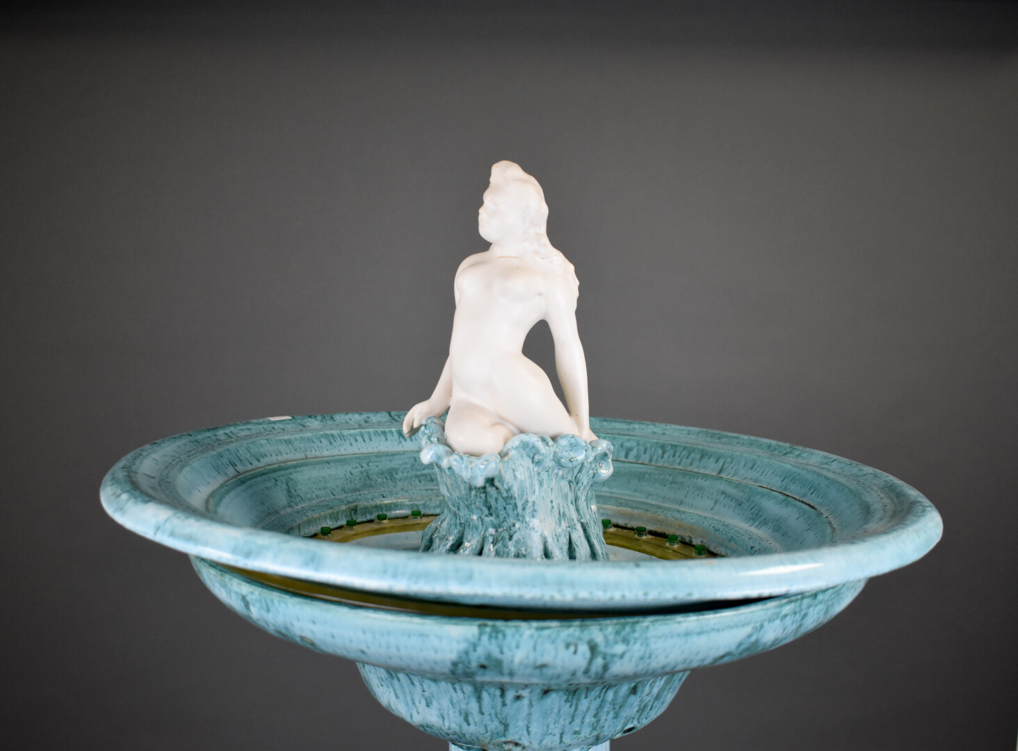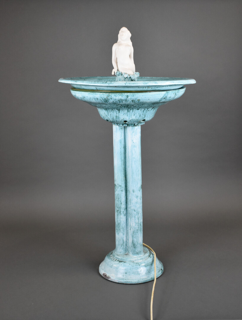 Dans le goût de SAINTE RADEGONDE ou VALLAURIS. Fontaine à eau lumineuse en céramique émaillée turquoise, le fût à trois colonnes affrontées. La vasque ornée en son centre d’une figure de naïade sortant des flots (deux éclats, une restauration au niveau de la tête). Haut. : 83 cm.