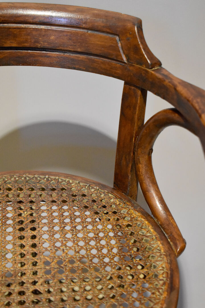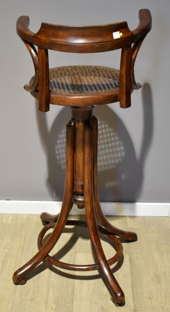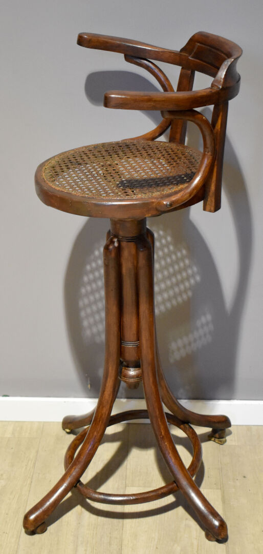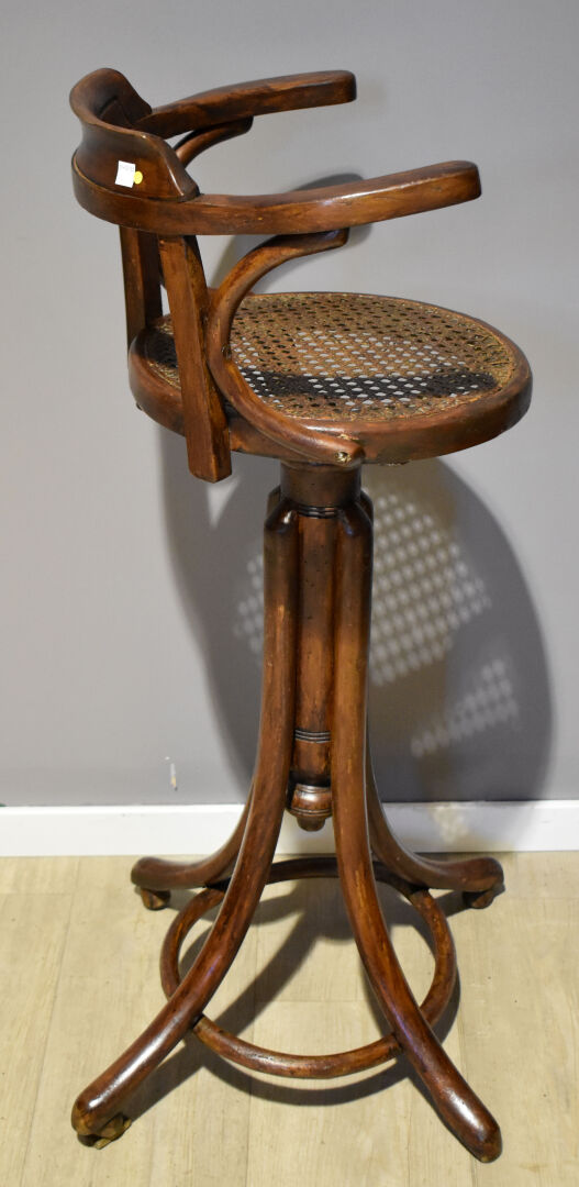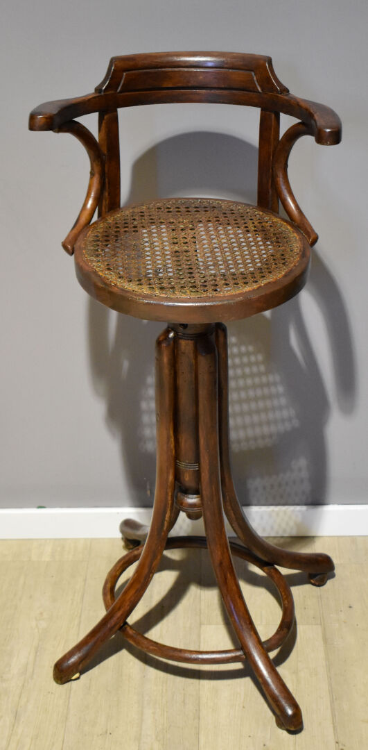 Dans le goût de Thonet. Chaise haut de coiffeur le pour enfant en hêtre courbé et assise cannée. Hauteur réglable par une vis centrale. Vers 1900/1920. Haut. max. : 107 cm – min. : 91 cm.