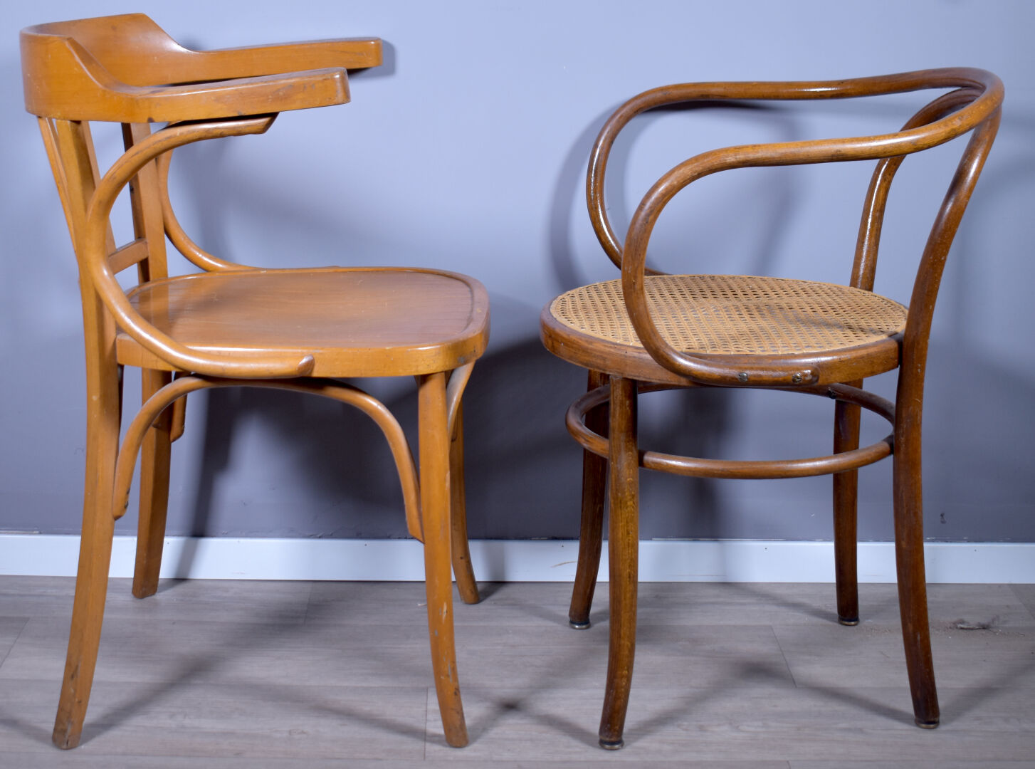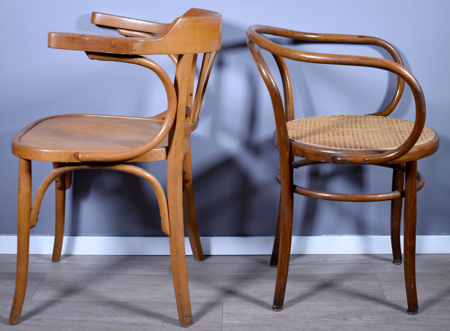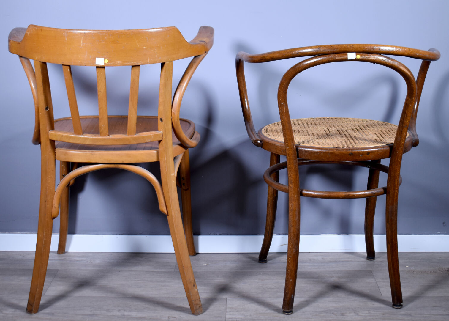 Dans le goût de Thonet. Deux fauteuils en hêtre courbé, l’un à assise canné (quelques usures). Haut. : 80 cm – Haut. : 76,5 cm.