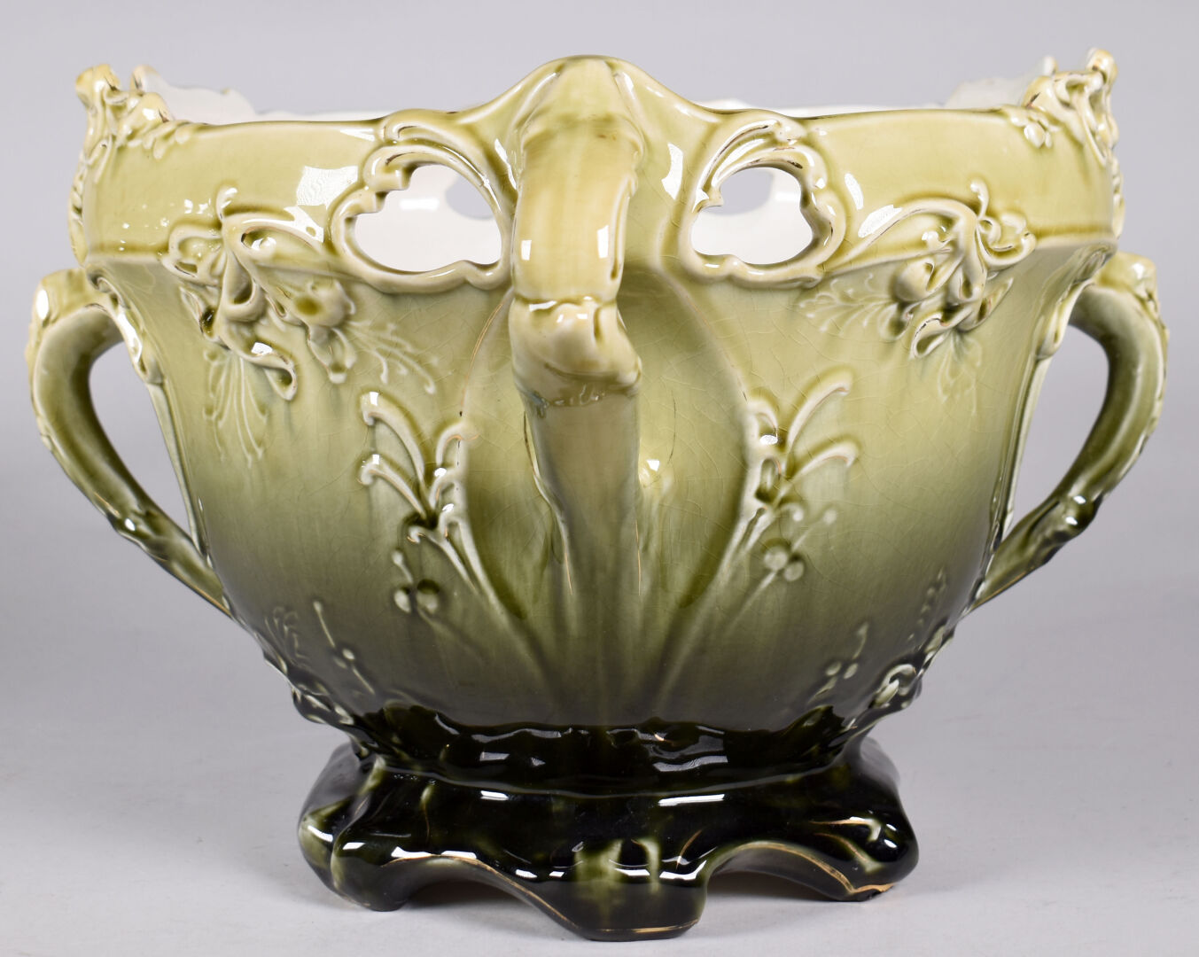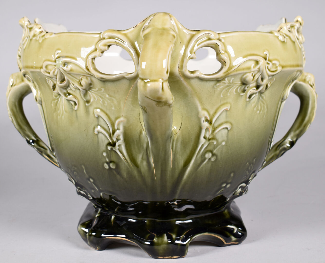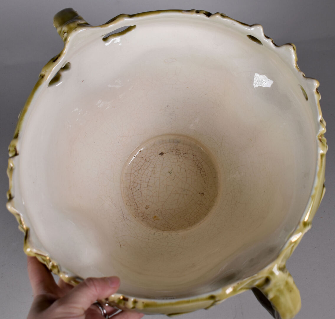 Dans le goût d’Hector GUIMARD et des Faïencerie de Bruyn. Cache pot en faïence émaillée vert à décor de végétaux (quelques égrenures, une restauration). Époque Art Nouveau. Haut. : 24,5 cm.