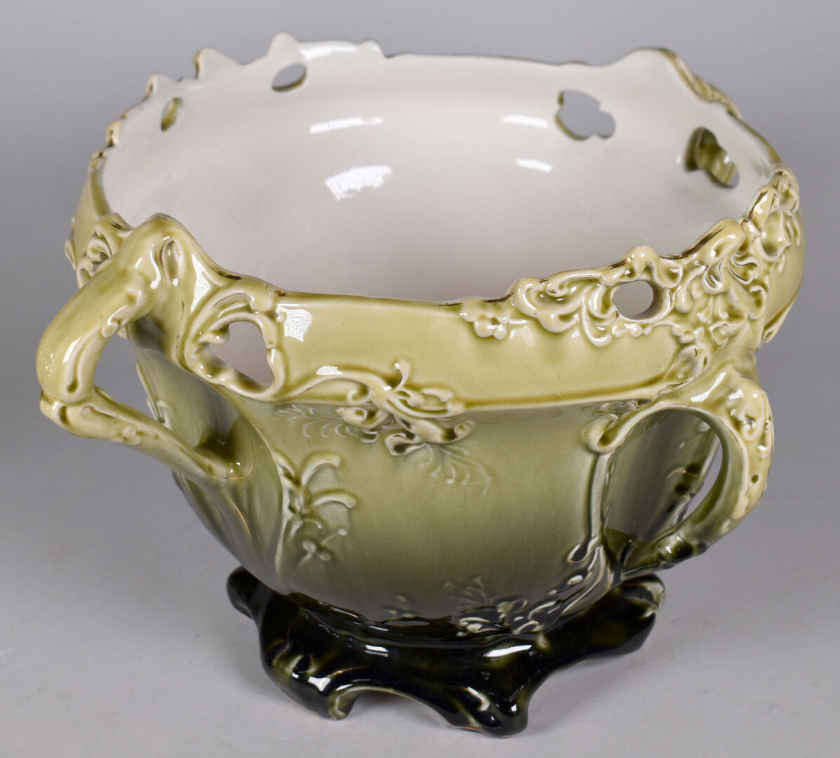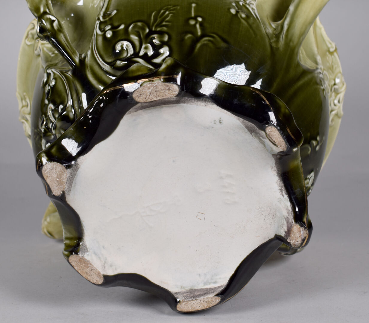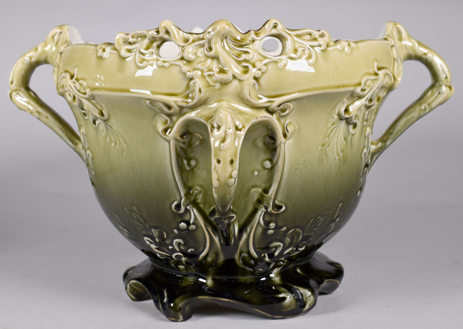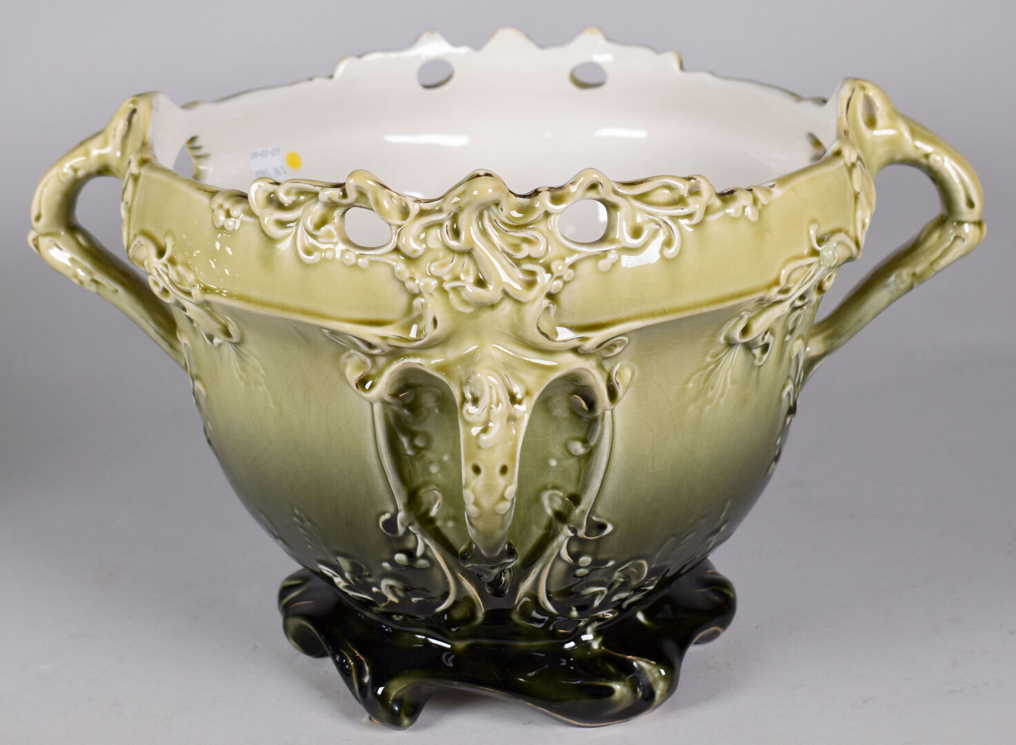 Dans le goût d’Hector GUIMARD et des Faïencerie de Bruyn. Cache pot en faïence émaillée vert à décor de végétaux (quelques égrenures, une restauration). Époque Art Nouveau. Haut. : 24,5 cm.