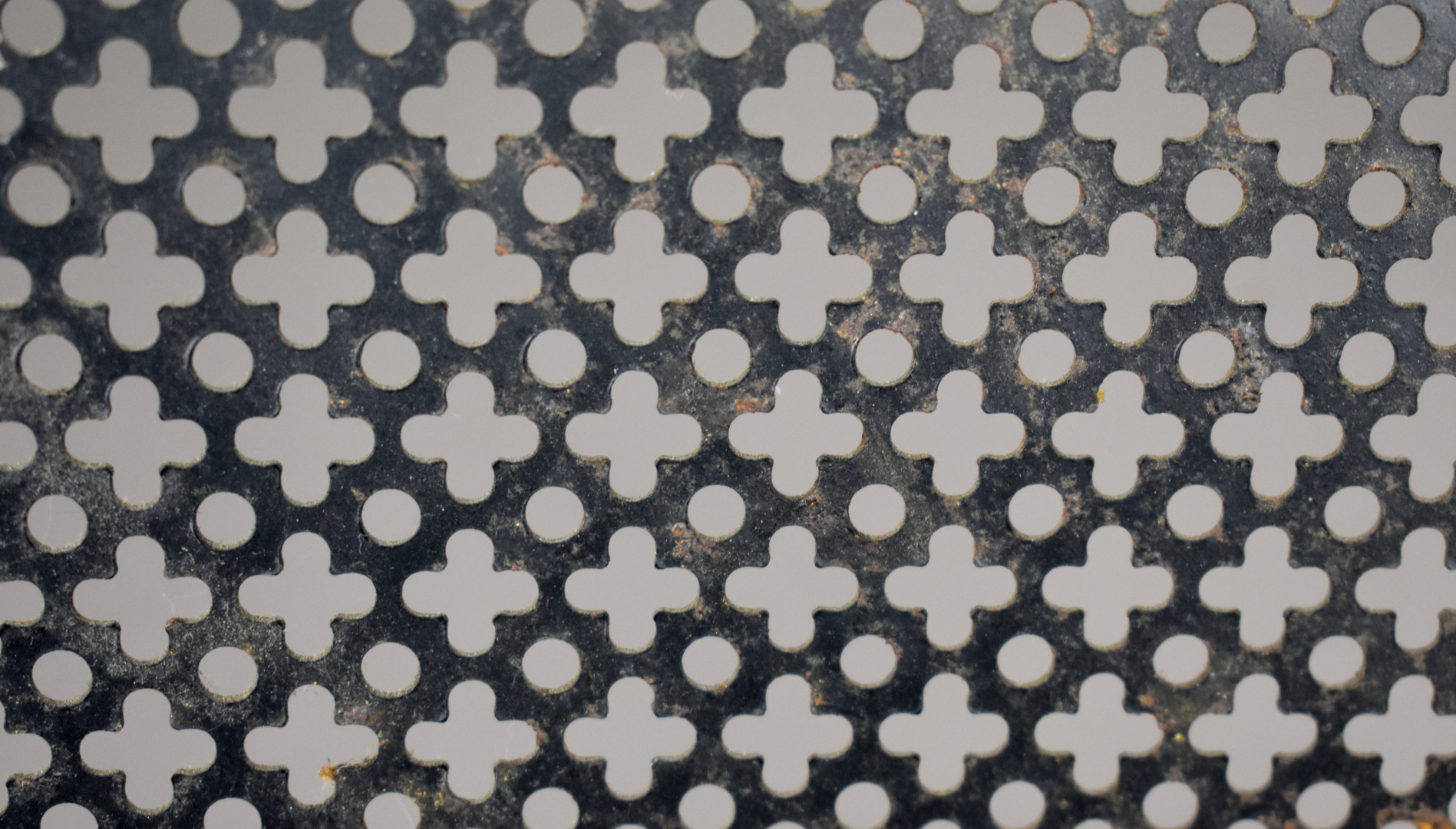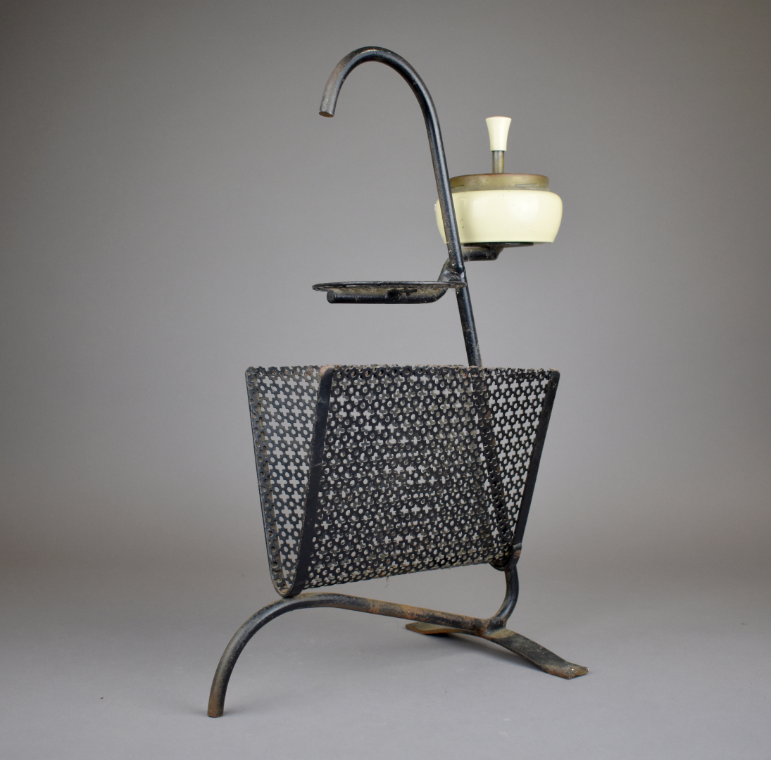 Dans le goût Mategot. Porte revue cendrier en tôle perforée noire et métal laqué crème. Seconde moitié du XXe siècle. Haut. : 54 cm.
