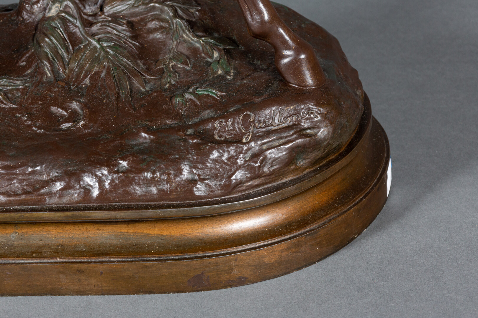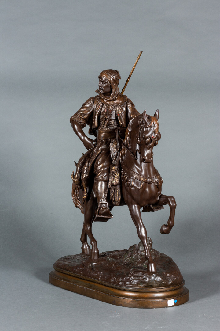 D’après Alfred BARYE (1839-1882) et Émile GUILLEMIN (1841-1907). Cavalier Arabe revenant de la chasse. Régule à patine brun, doré et rouge. Signé sur la terrasse, cachet « Fabrication Française Made In France ». Haut. : 71 cm – Larg. : 49 cm – Prof. : 25 cm.