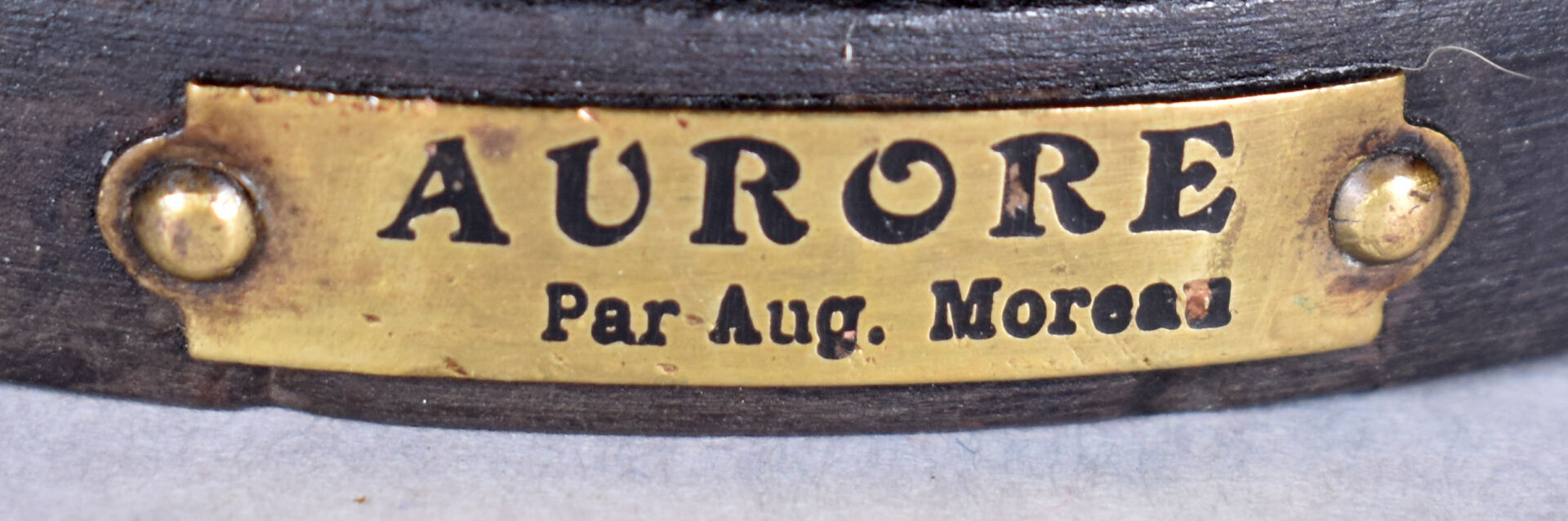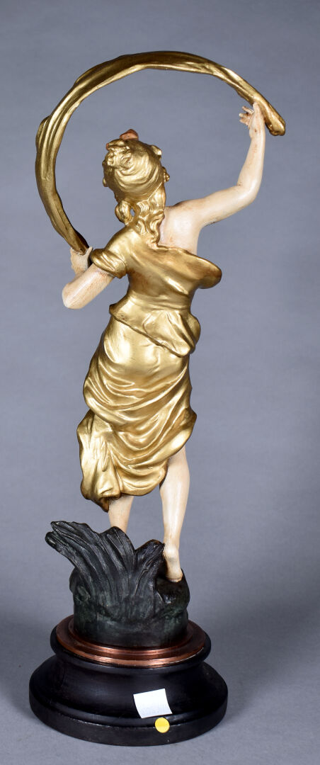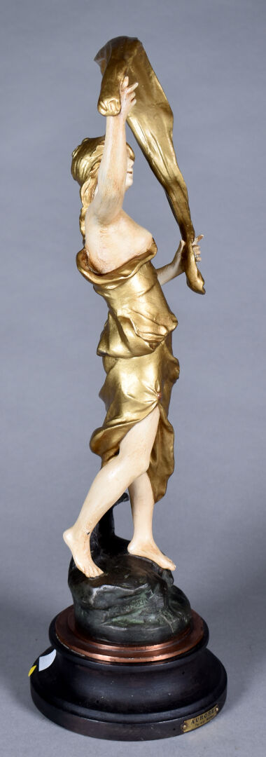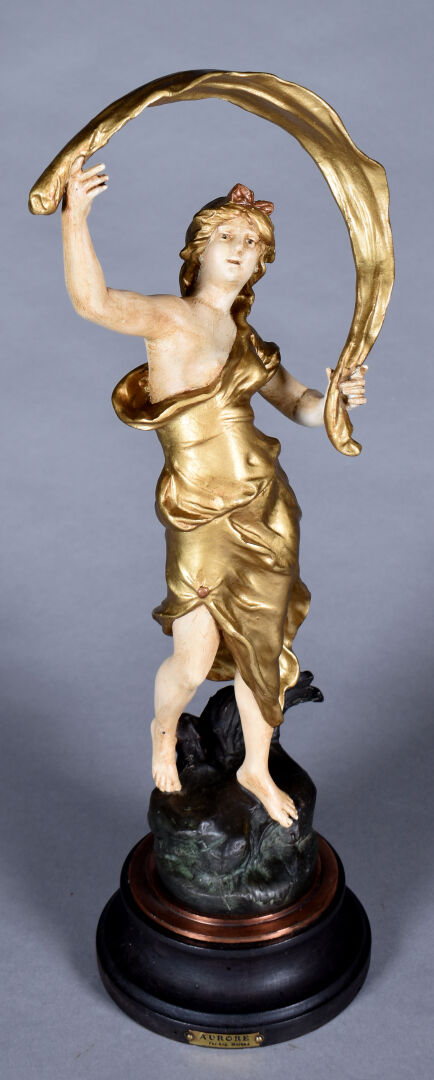 D’après Auguste MOREAU. Sujet en métal à patine polychrome titré « Aurore ». Haut. : 41 cm.