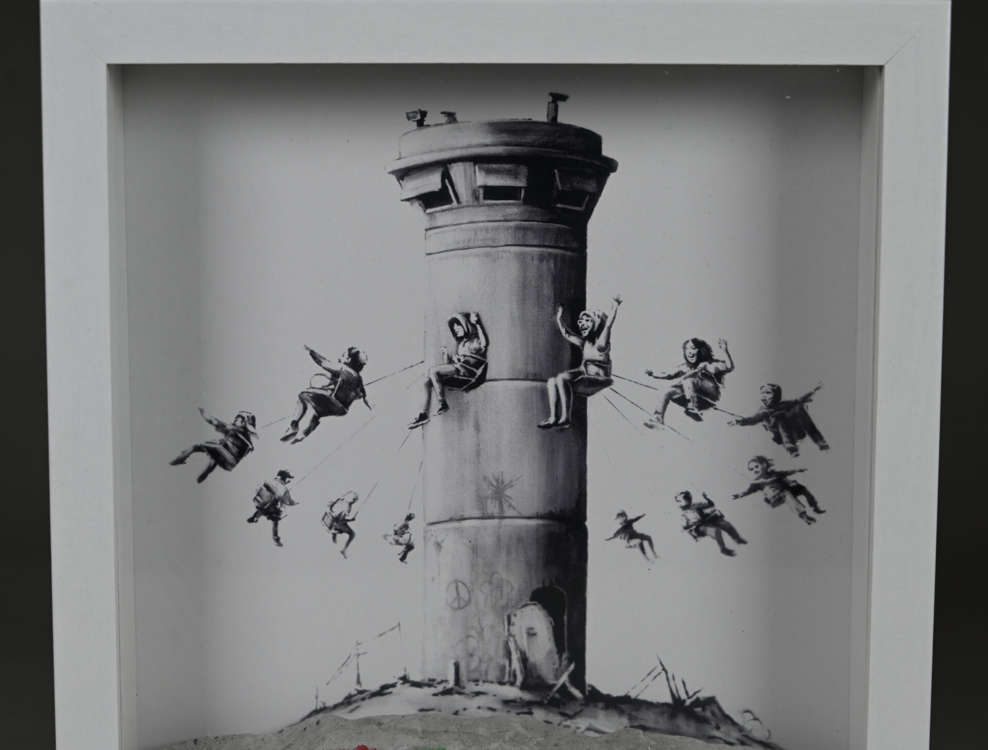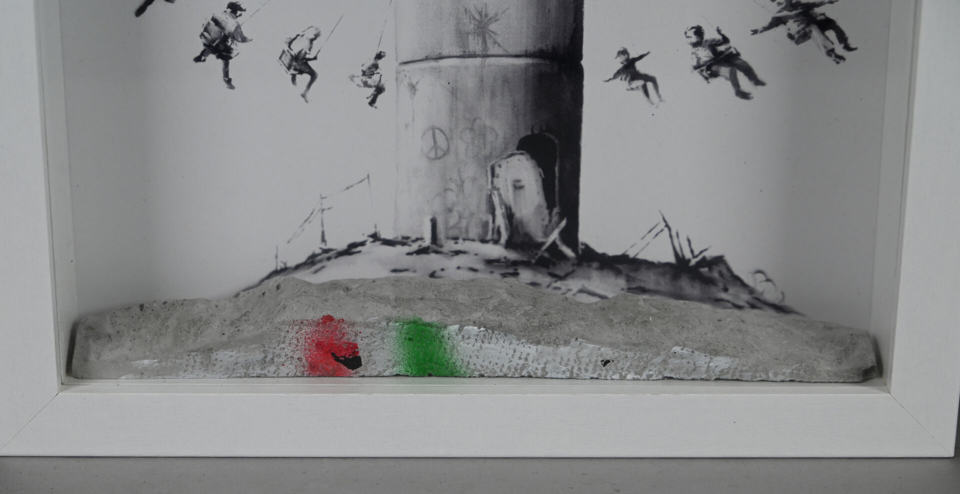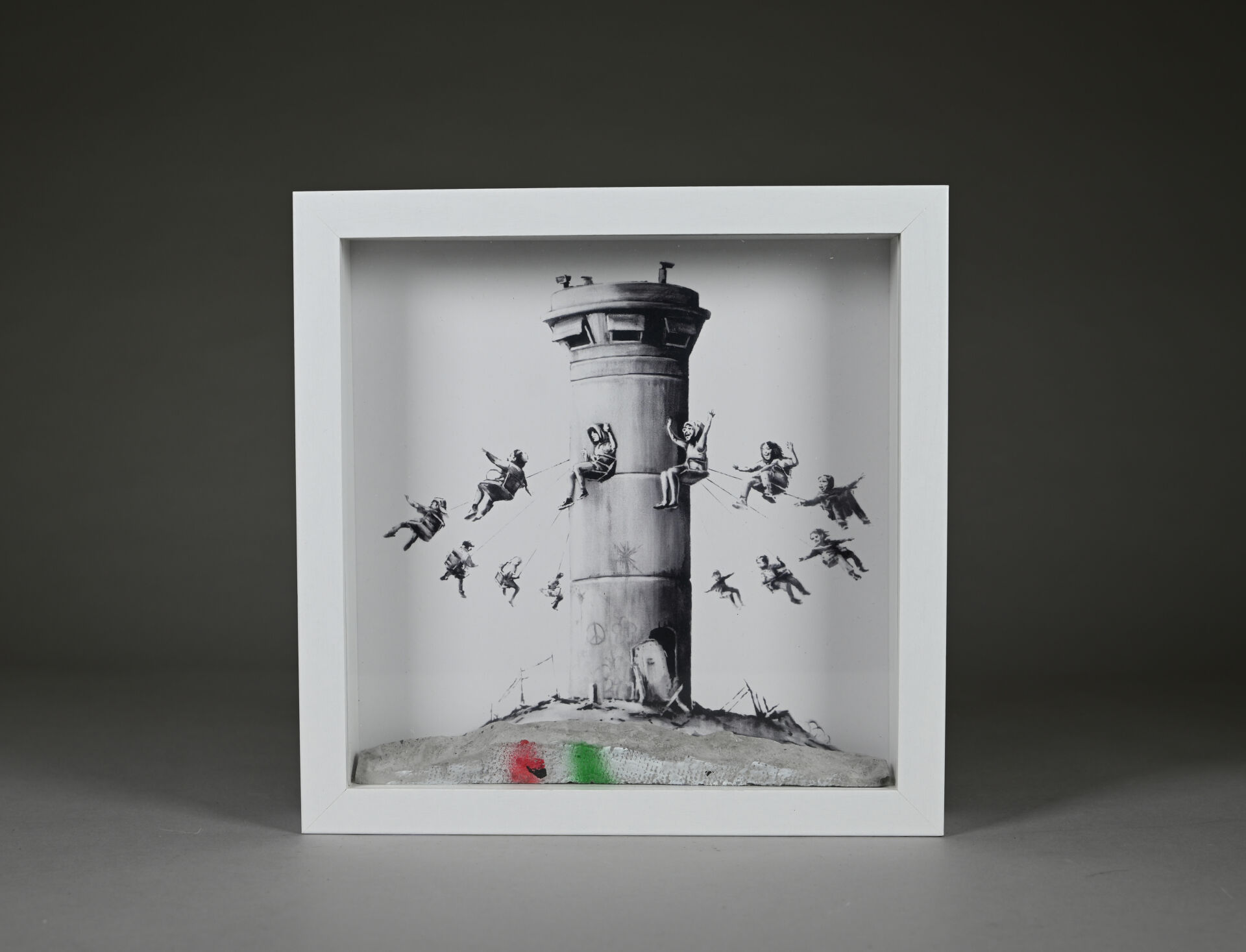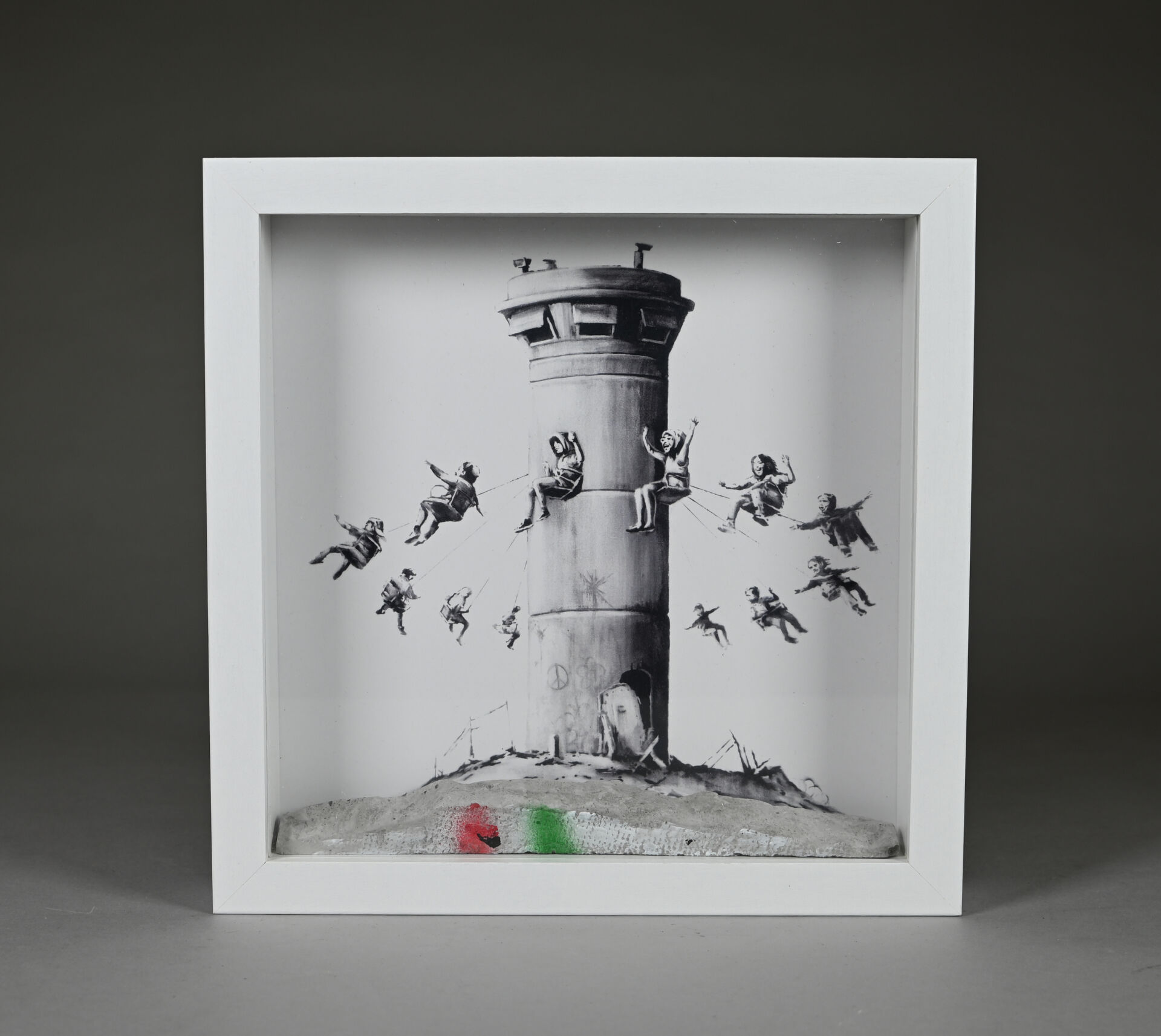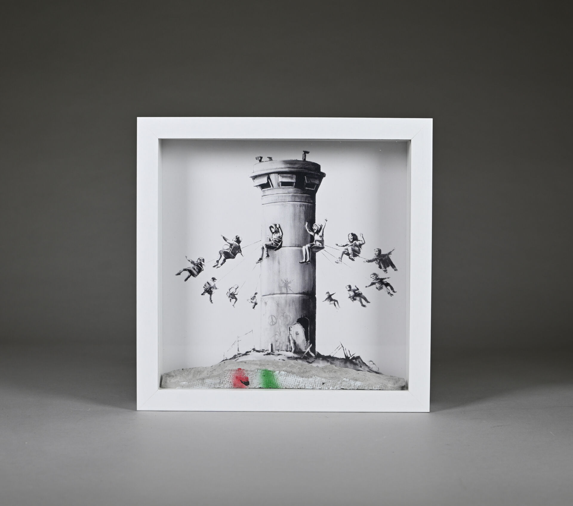D’après BANKSY Box Set. Composition d’une impression monochrome sur papier et morceau de béton peint à la bombe, dans une caisse en bois et verre. Édition limitée. 2017. On joint la facture avec tampon « The Walled off Hôtel ». Haut.: 25,5 cm – Larg. : 25,5 cm.