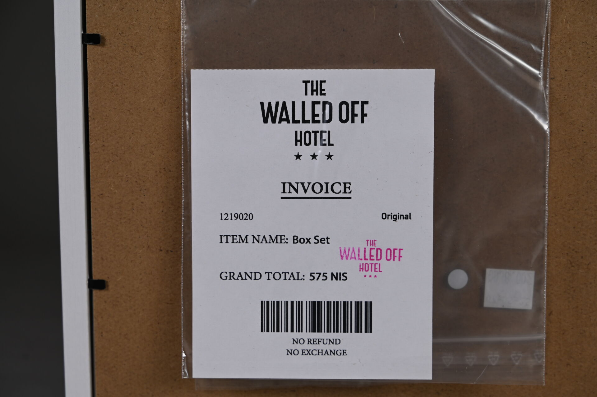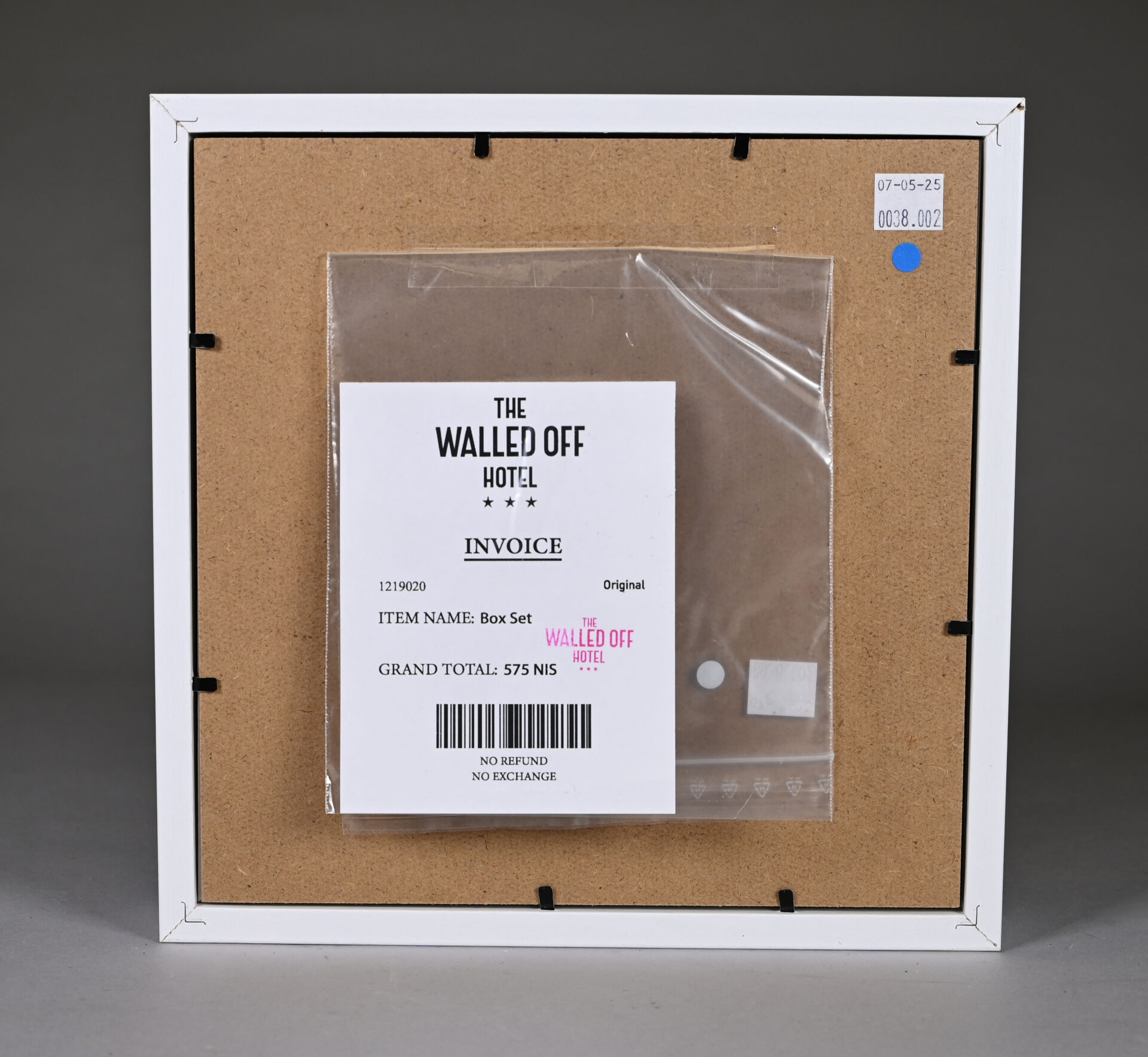 D’après BANKSY Box Set. Composition d’une impression monochrome sur papier et morceau de béton peint à la bombe, dans une caisse en bois et verre. Édition limitée. 2017. On joint la facture avec tampon « The Walled off Hôtel ».